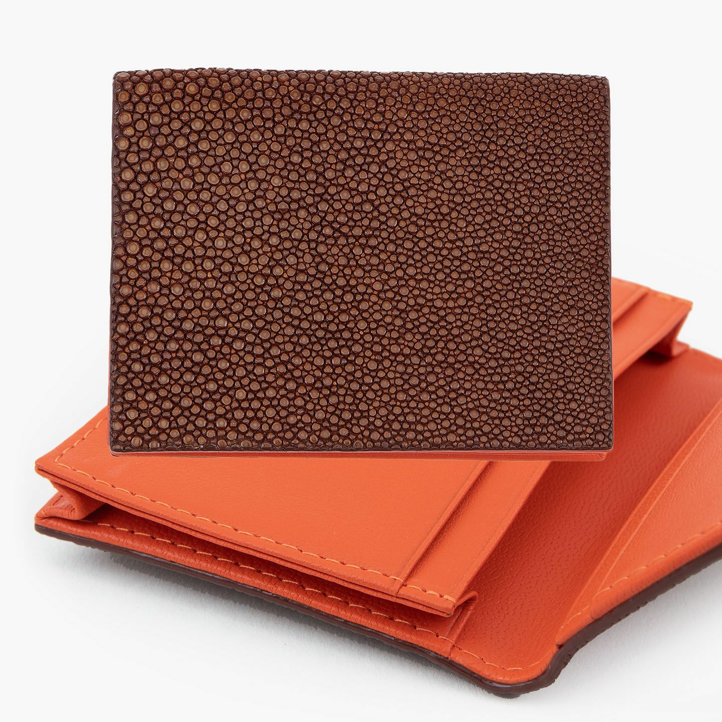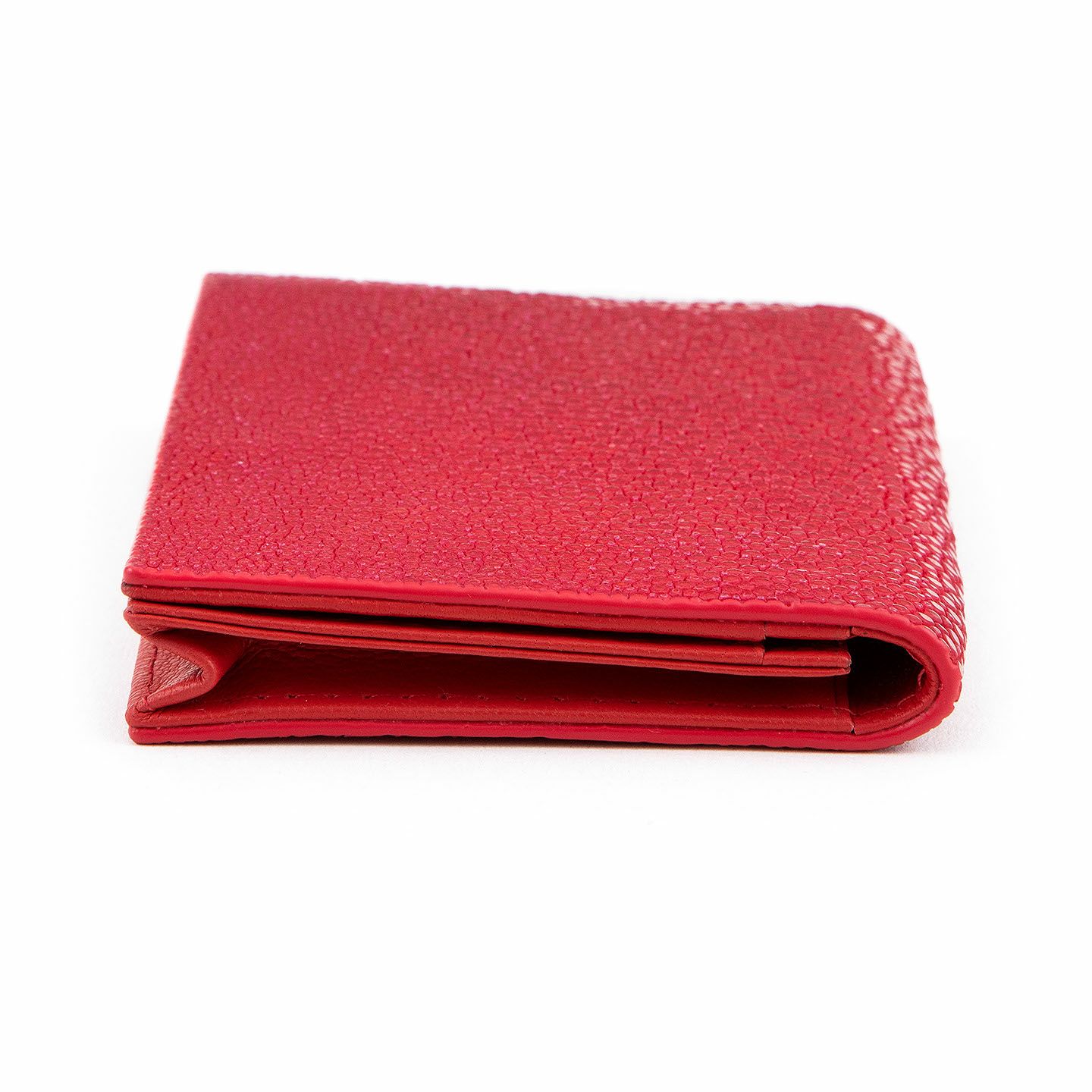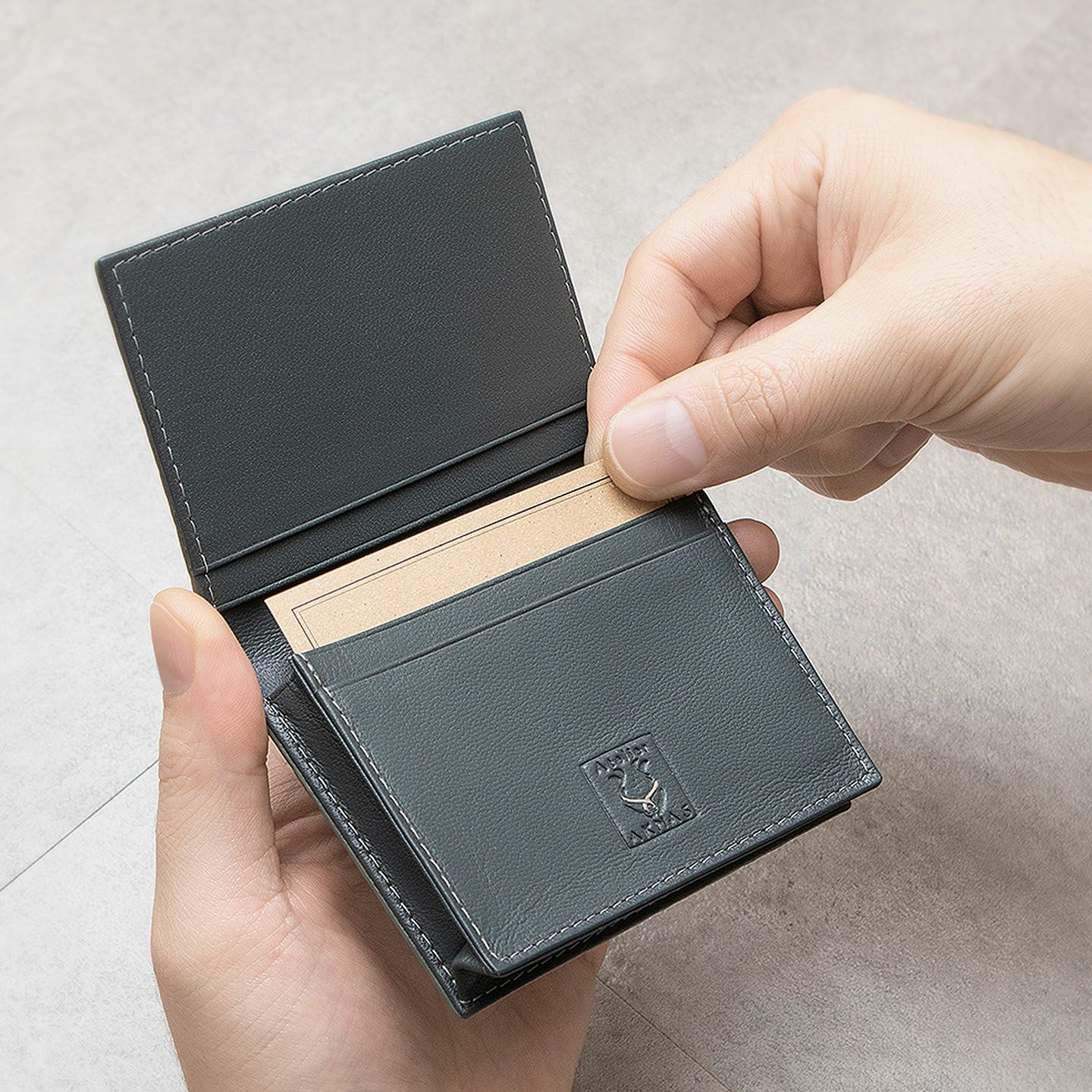 革製品としての最高のパフォーマンスを実現するために、革職人たちが飽くなき探求と努力、クリエイティビティとクオリティを追求しているブランド『Atelier AKNAS』の名刺入れ(S)。メインポケットには、紙袋のように底部までマチが付いている「通しマチ」を採用し、一般的な名刺の厚さであれば30枚ほどまで入れられるとともに、3つのサブカードポケットも備えて名刺の仕分けができ、その収納性と実用性で貢献。ガラスビーズを散りばめたような小さな鱗が美しいたエイ革「ガルーシャ」を、外装として贅沢に纏わせながら、古来より“ラッキーフィッシュ”と呼ばれてきた縁起の良さも、ビジネスシーンにもたらしてくれる。