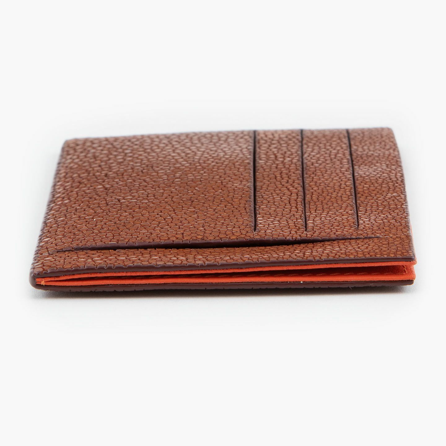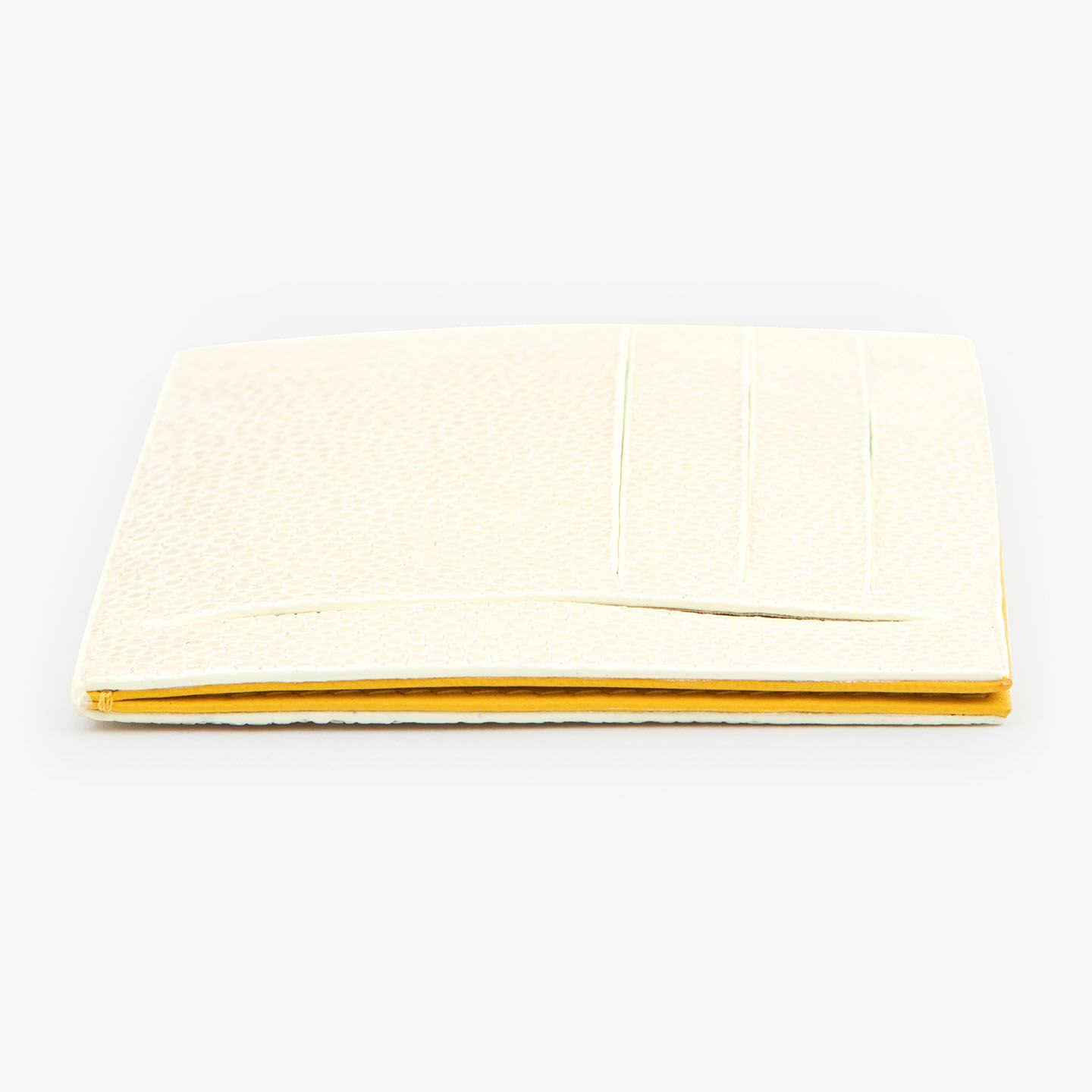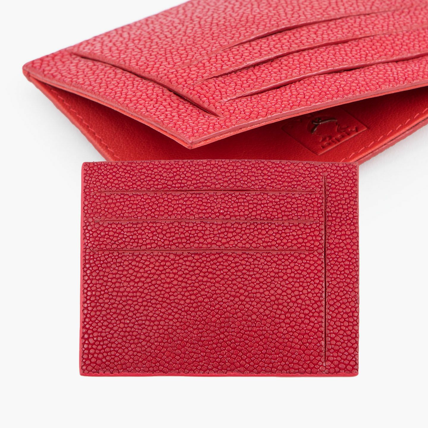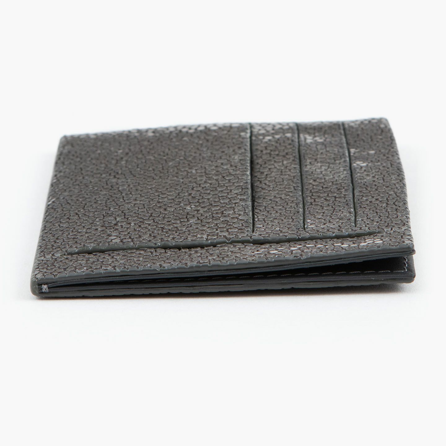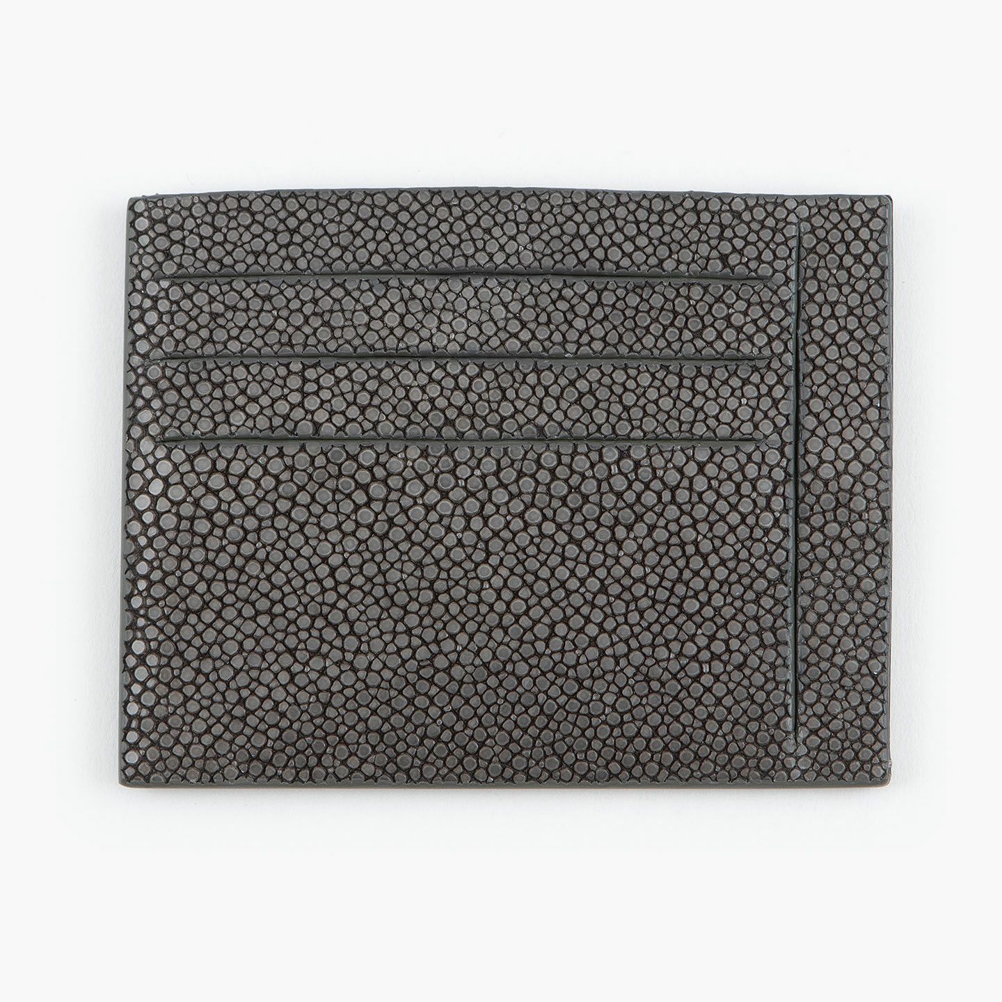 コンセプトに“Cuirs D'ailleurs 〜旅するレザー〜”を掲げ、他の人たちとは違った美学によるクールで洒落た人生の旅へと誘う、ブランド『Atelier AKNAS』のスリット札ばさみ。美しく覆っているガラスビーズを散りばめたような小さな鱗と、地中海の潮風を指先で感じるような冷んやりとした感触が魅力的な「ガルーシャ」を、外装として纏わせ贅沢感を演出。その両サイドに、無縫製の切り込みでフラットに仕立てたカードポケット各3つ(計6つ)・スリット式フリーポケット各1つ(計2つ)を備え、二つ折りの紙幣を簡単に差し込んで10枚ほど収納できる札入れとともに、金具を排したスリム&スマートな使用感をもたらしてくれる。