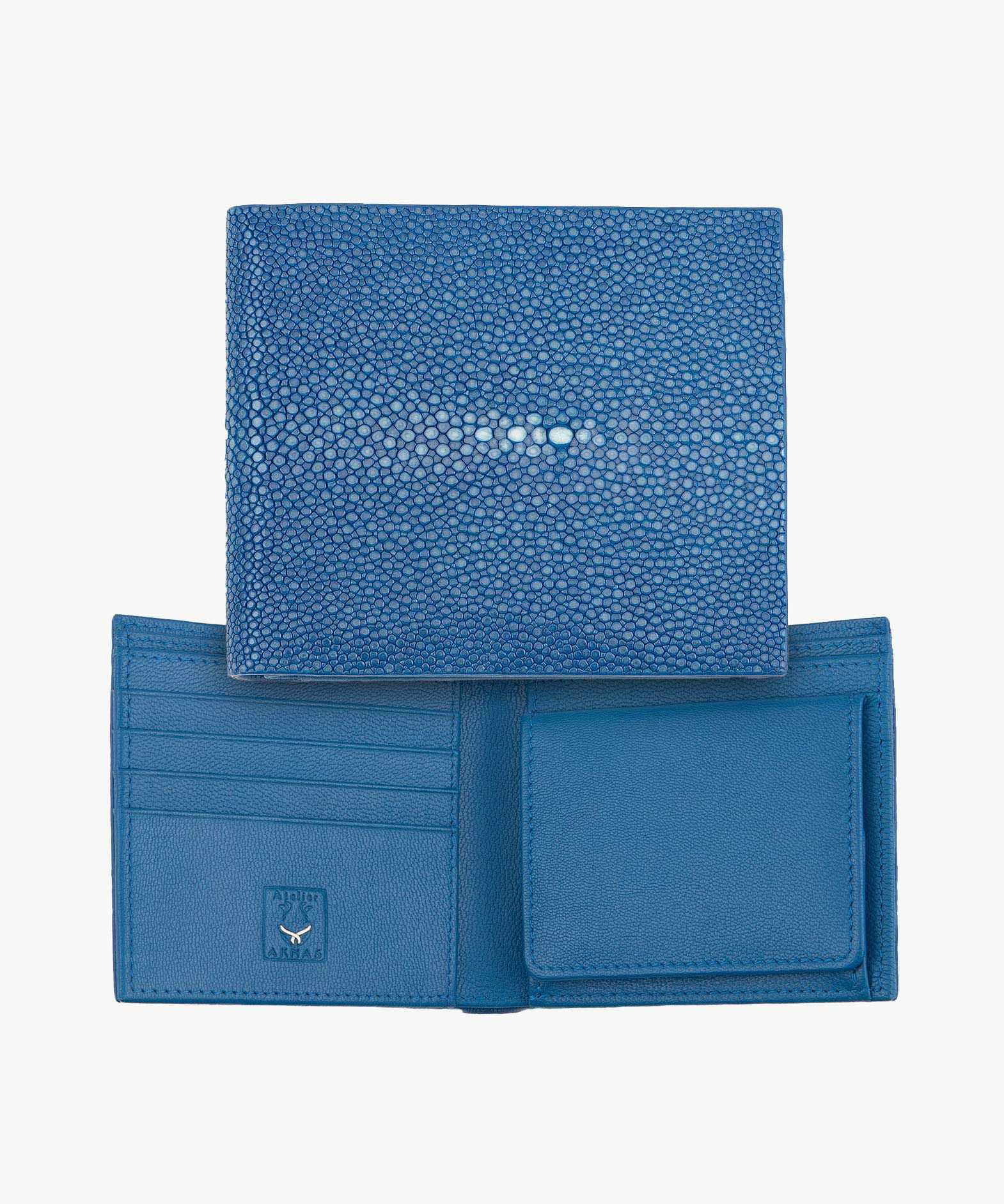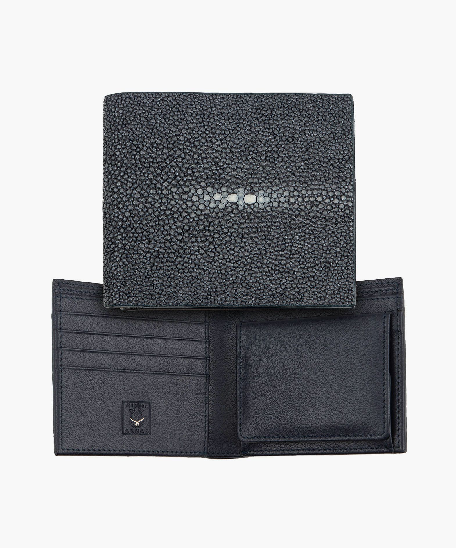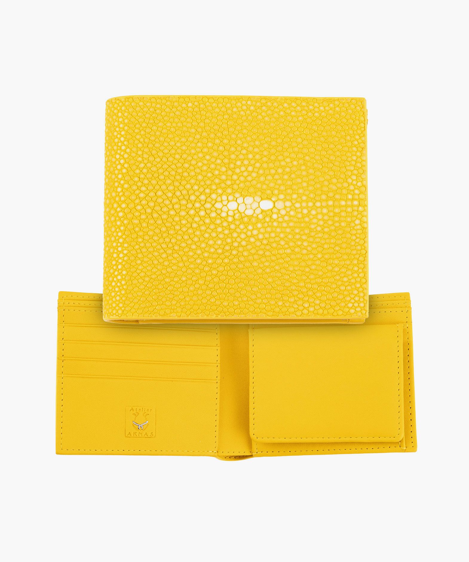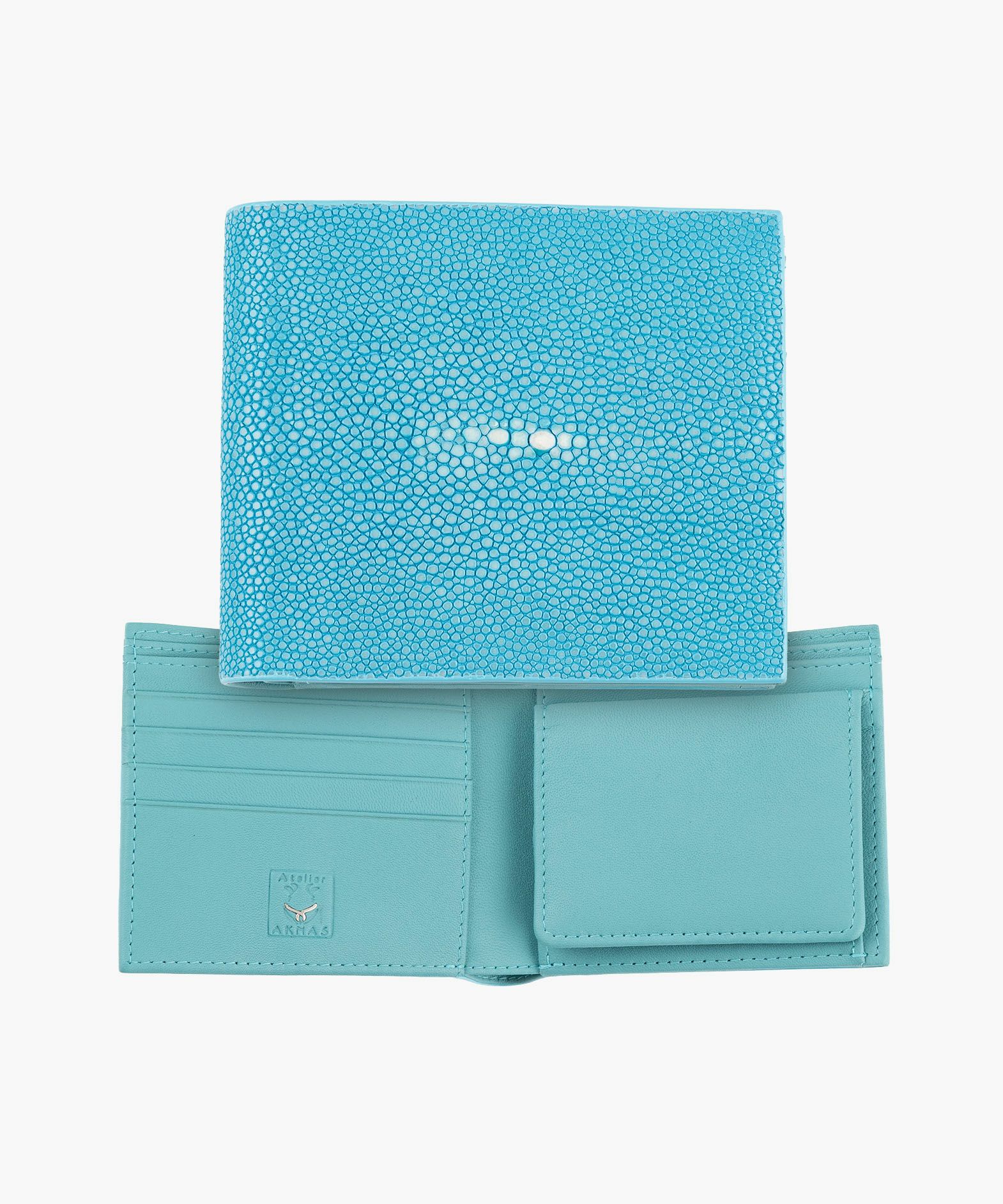 他とは違った美学による洒落た人生の旅へと誘う、“Cuirs D'ailleurs 〜旅するレザー〜”をコンセプトにしている、ブランド『Atelier AKNAS』の二つ折り財布(小銭入れ付き)。地中海の潮風を指先で感じるような冷んやりとした感触が印象的な外装「ガルーシャ」は、ガラスビーズを散りばめたみたいな小さな鱗が美しく、 “100年モノ”と言われるくらい強度・耐久性も誇る、縁起が良いと重宝されてきたエイ革。内装には、異なる質感・カラーリングが絶妙なイタリア産「山羊革」をあしらい、札入れ・カードポケット・フリーポケットとともにボックス型小銭入れも備え、サイズ感を超える収納性が普段使いをより楽しくしてくれる。