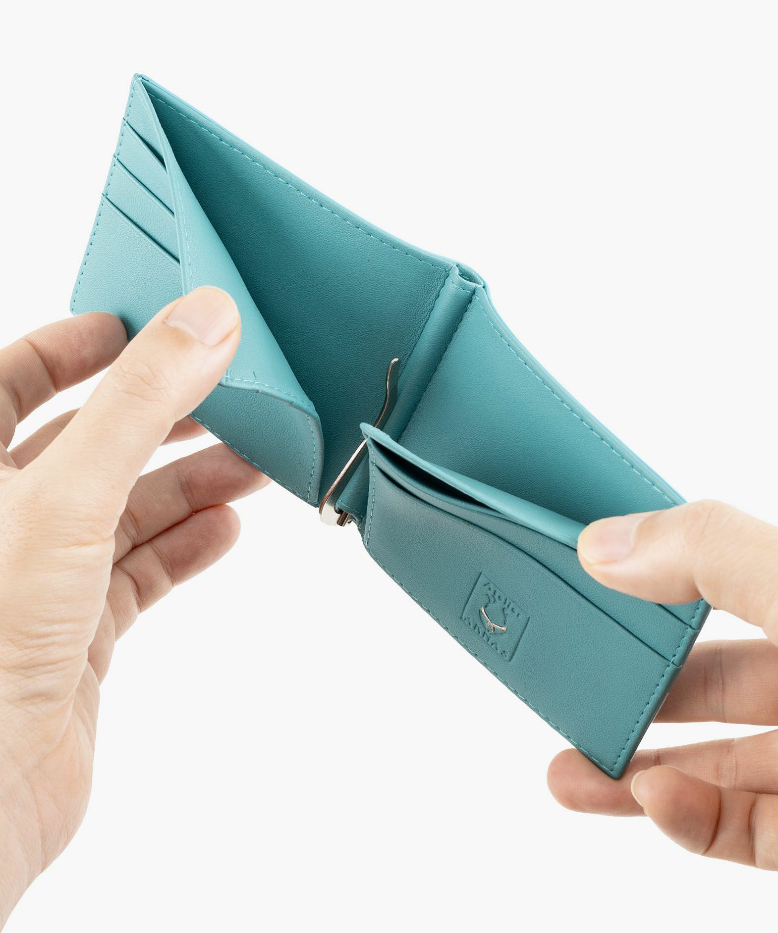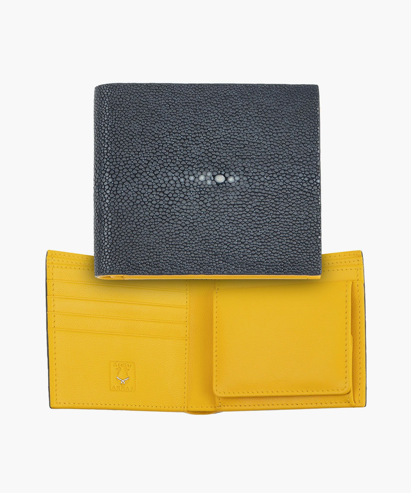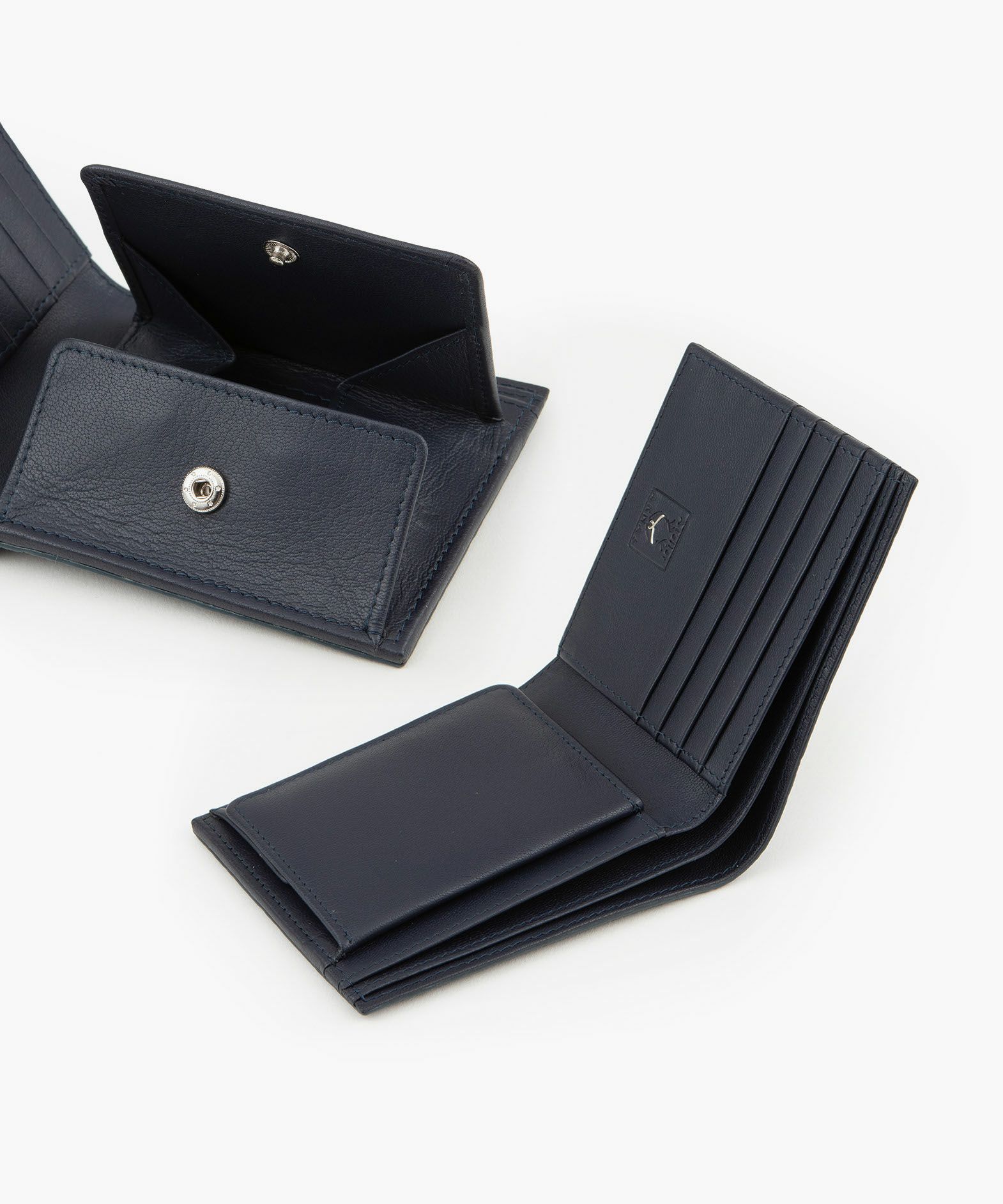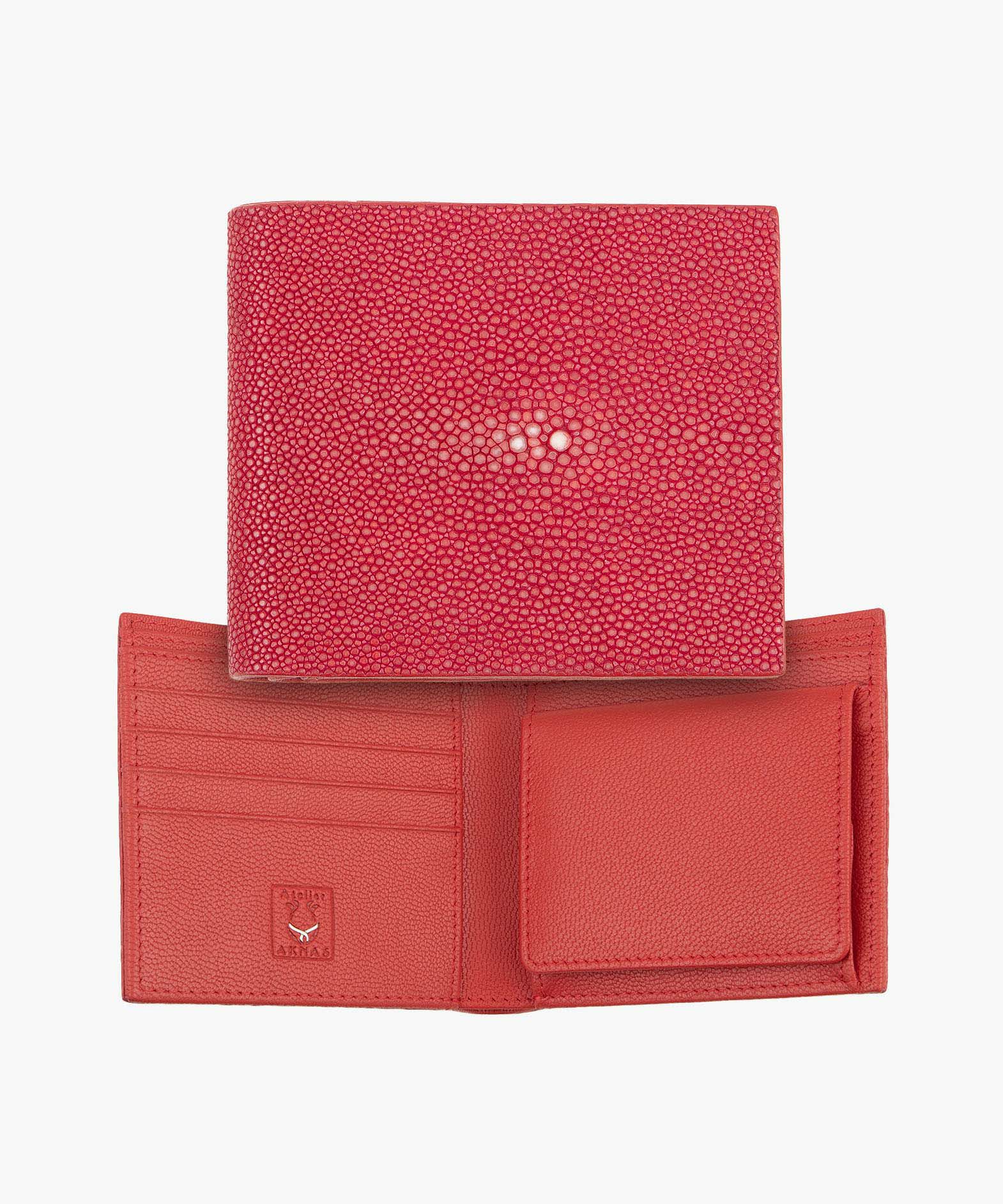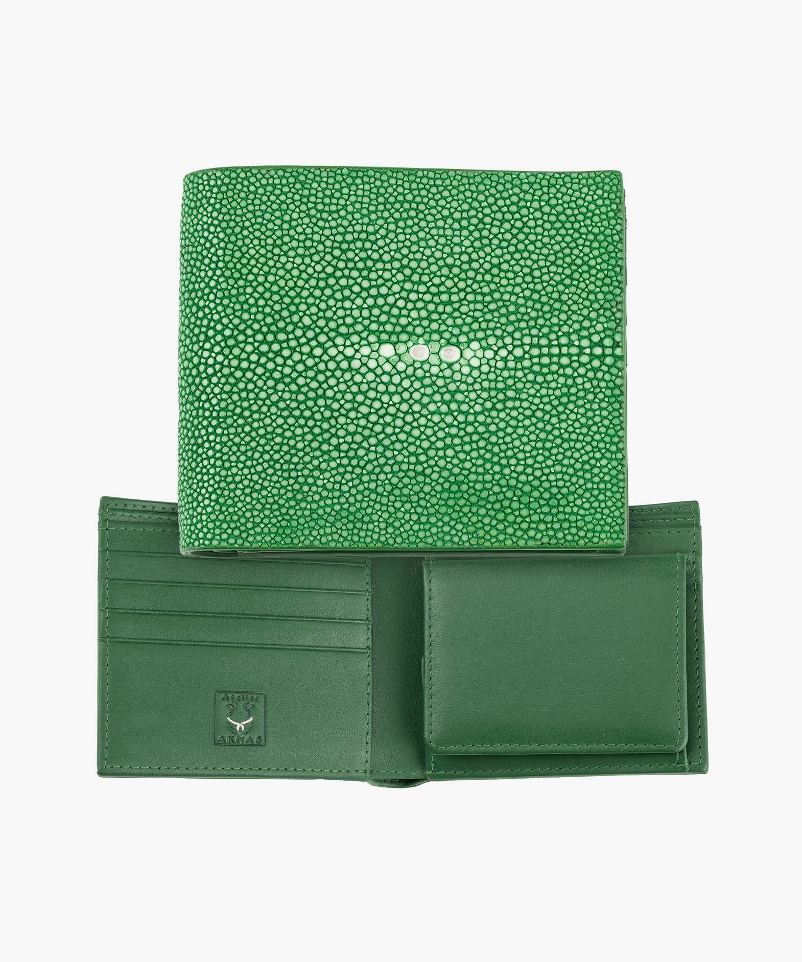 他とは違った美学による洒落た人生の旅へと誘う、“Cuirs D'ailleurs 〜旅するレザー〜”をコンセプトにしている、ブランド『Atelier AKNAS』の二つ折り財布(小銭入れ付き)。地中海の潮風を指先で感じるような冷んやりとした感触が印象的な外装「ガルーシャ」は、ガラスビーズを散りばめたみたいな小さな鱗が美しく、 “100年モノ”と言われるくらい強度・耐久性も誇る、縁起が良いと重宝されてきたエイ革。内装には、異なる質感・カラーリングが絶妙なイタリア産「山羊革」をあしらい、札入れ・カードポケット・フリーポケットとともにボックス型小銭入れも備え、サイズ感を超える収納性が普段使いをより楽しくしてくれる。