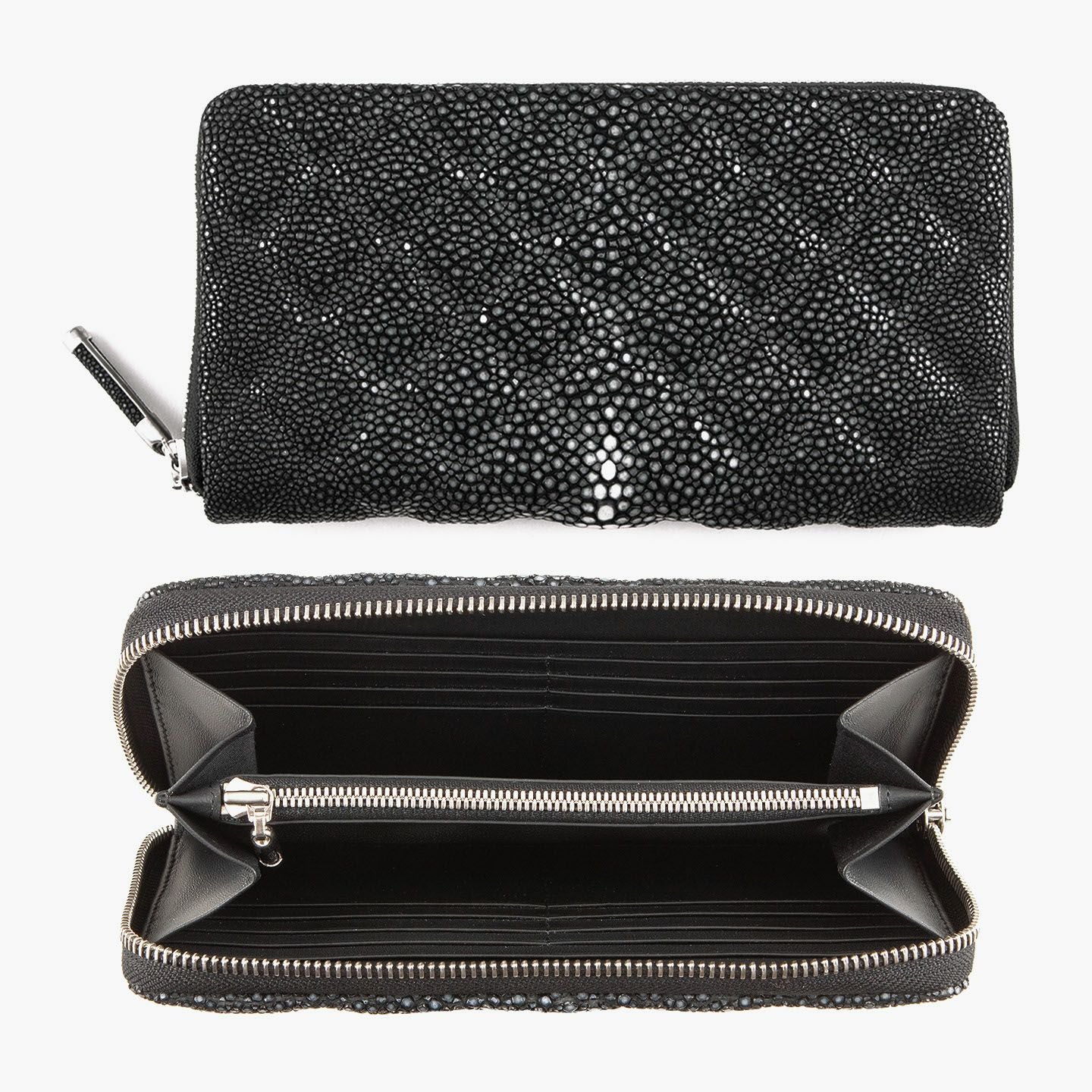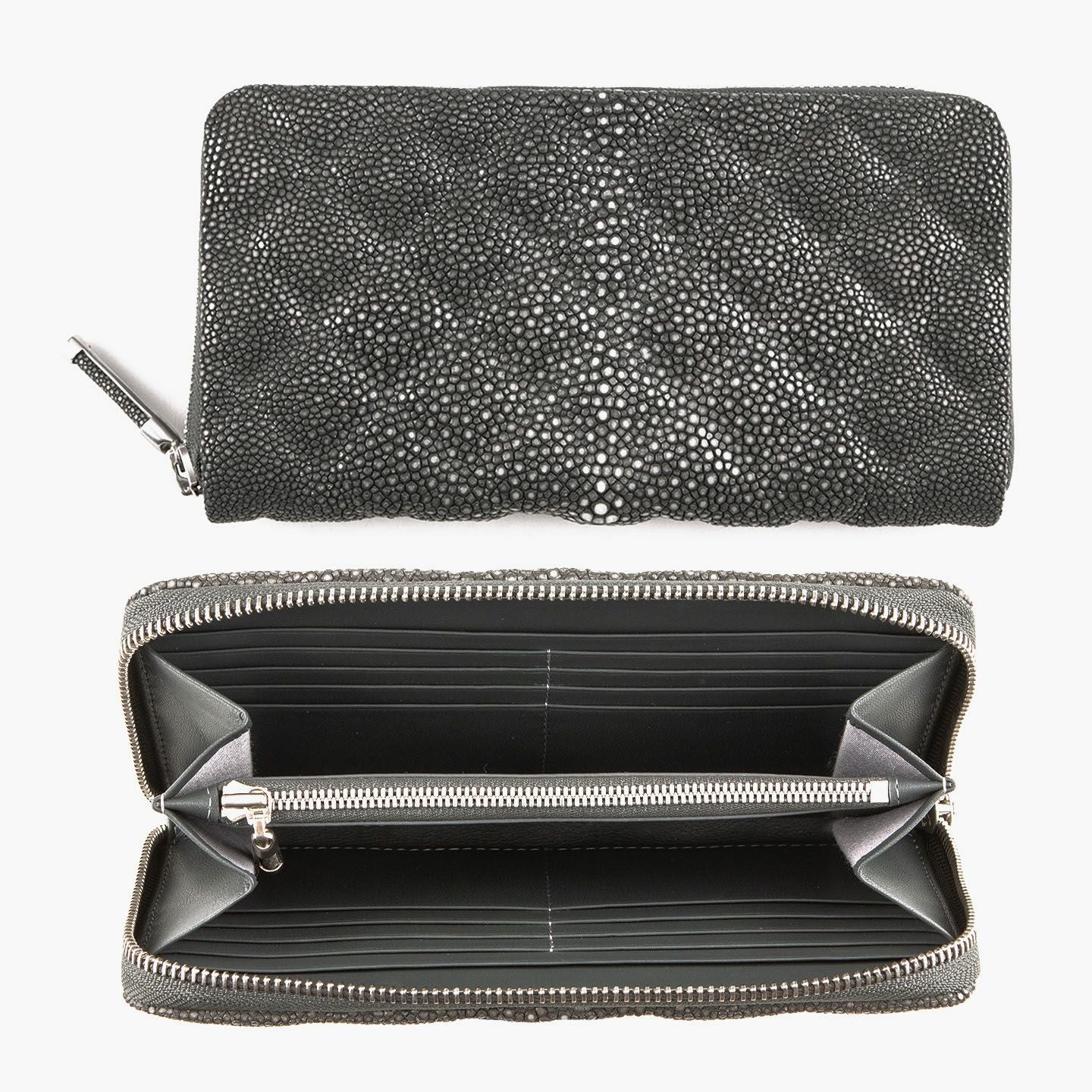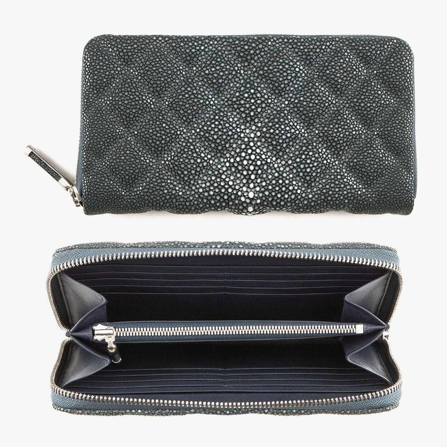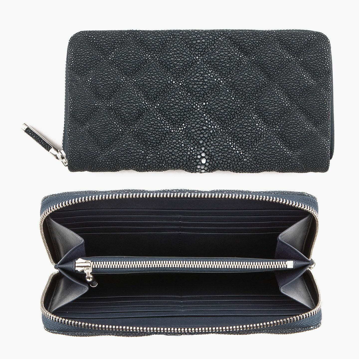 「いつも一緒に人生の旅の時間を刻んでいく革製品でありたい」という、想いを込めているブランド『Atelier AKNAS』のラウンドジップ長財布(ダイヤエンボス)。ガラスビーズを散りばめたような小さな鱗が美しく、縁起が良いと重宝されてきたエイ革「ガルーシャ」の硬い皮革の下に、特殊なクッション材を入れて試行錯誤の末にエンボス加工のダイヤ模様を成功させた、ブランドの真骨頂とも言える独創的なデザインで世界的にも希少なコレクション。贅沢な極上感を纏った高品位でエレガントな外装の魅力とともに、三層に分かれている内装の設計により収納物の整理がしやすい実用性も兼ね備え、大人の感性を満たしてくれる。