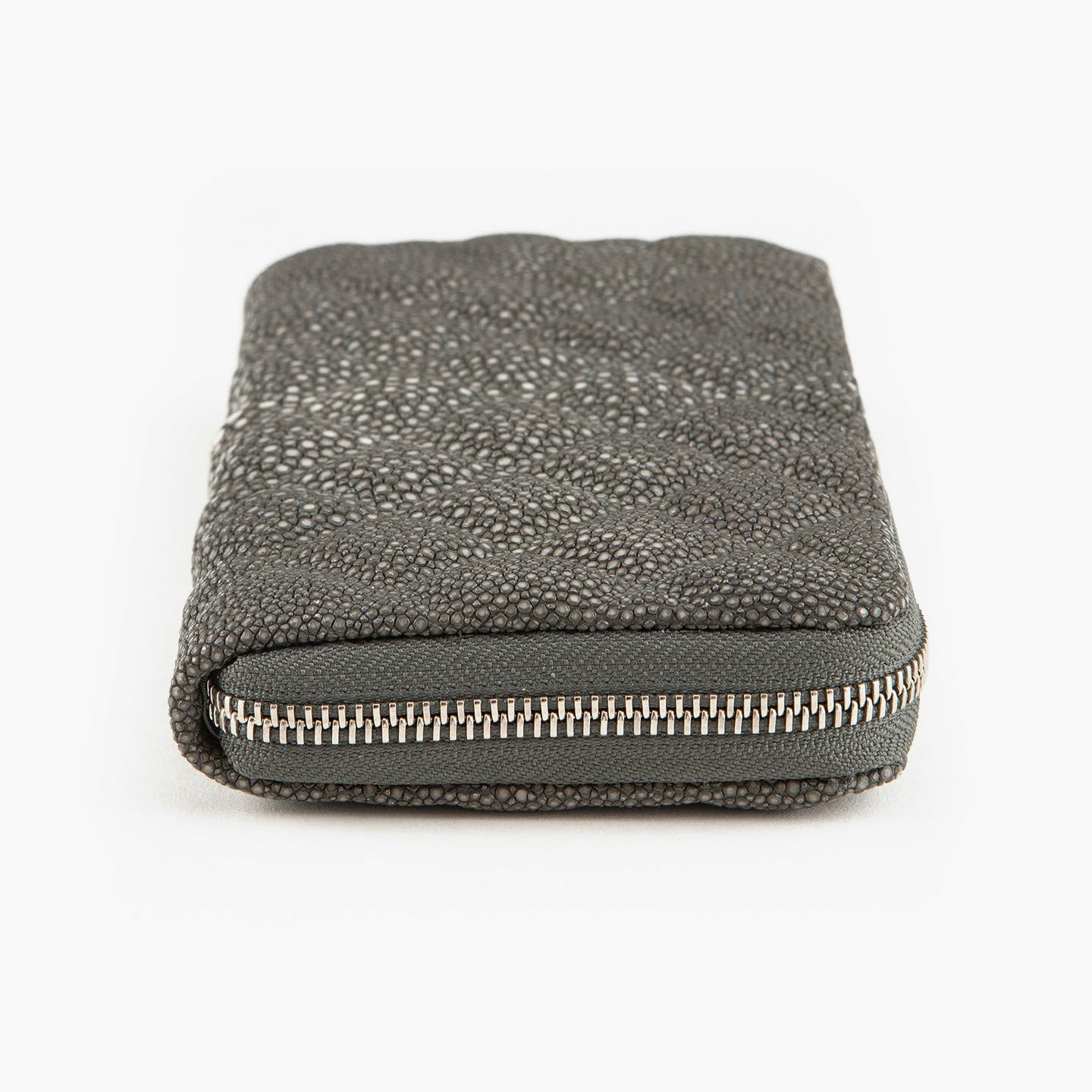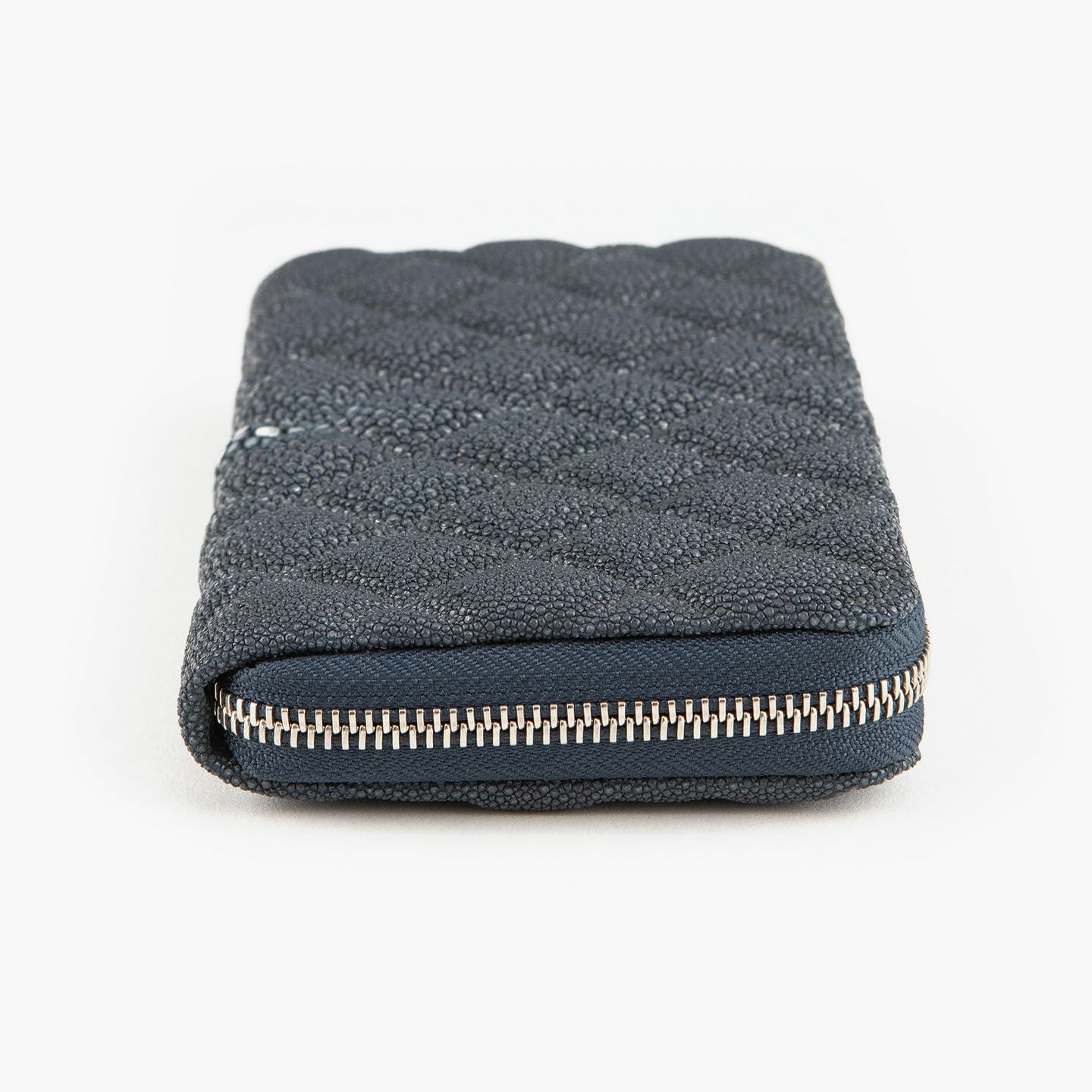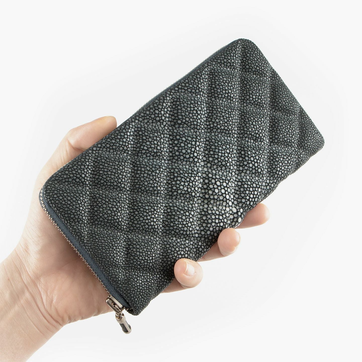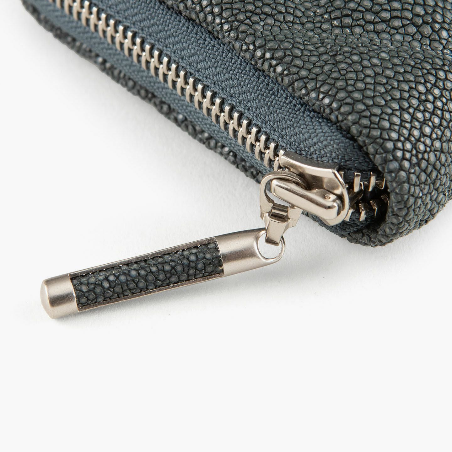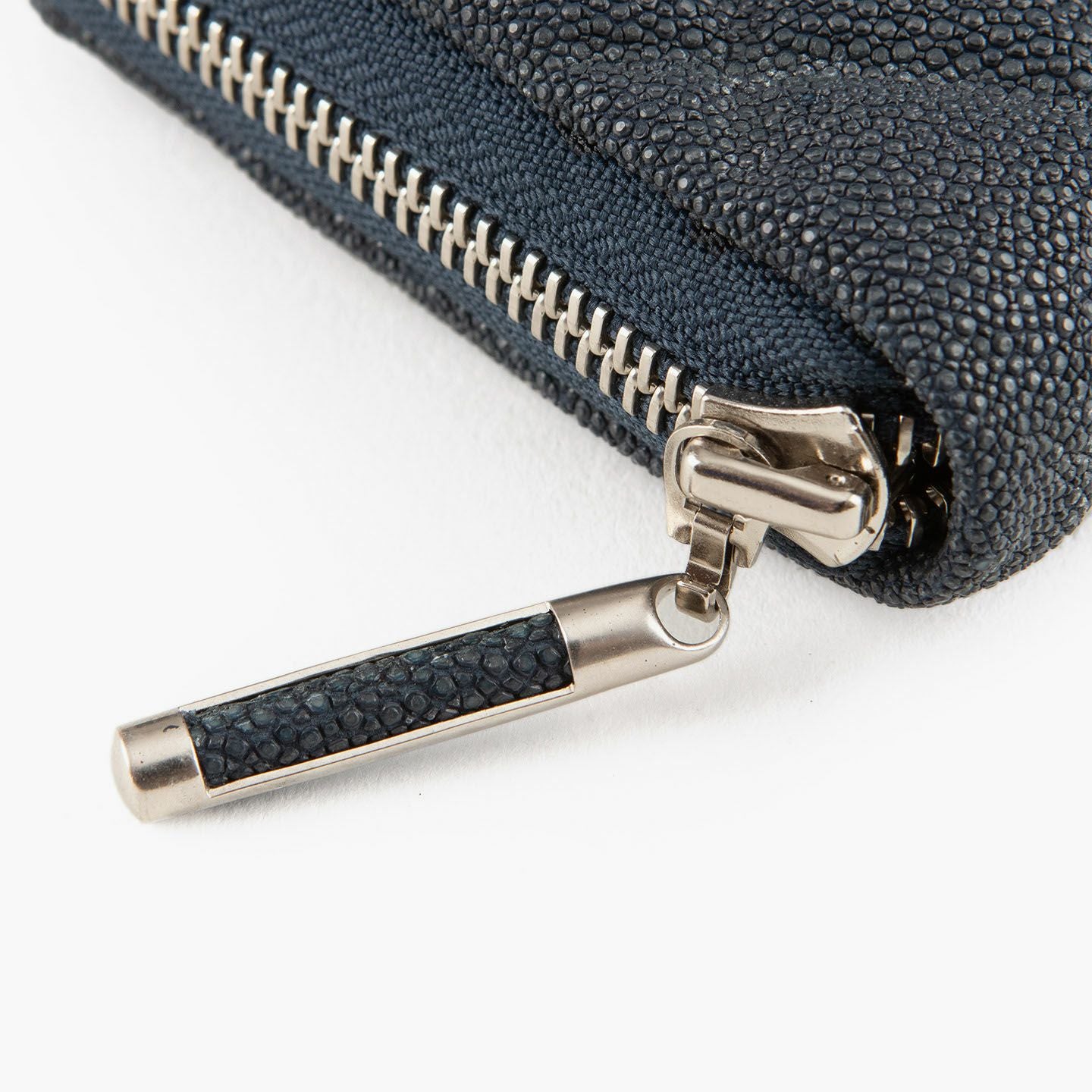 「いつも一緒に人生の旅の時間を刻んでいく革製品でありたい」という、想いを込めているブランド『Atelier AKNAS』のラウンドジップ長財布(ダイヤエンボス)。ガラスビーズを散りばめたような小さな鱗が美しく、縁起が良いと重宝されてきたエイ革「ガルーシャ」の硬い皮革の下に、特殊なクッション材を入れて試行錯誤の末にエンボス加工のダイヤ模様を成功させた、ブランドの真骨頂とも言える独創的なデザインで世界的にも希少なコレクション。贅沢な極上感を纏った高品位でエレガントな外装の魅力とともに、三層に分かれている内装の設計により収納物の整理がしやすい実用性も兼ね備え、大人の感性を満たしてくれる。