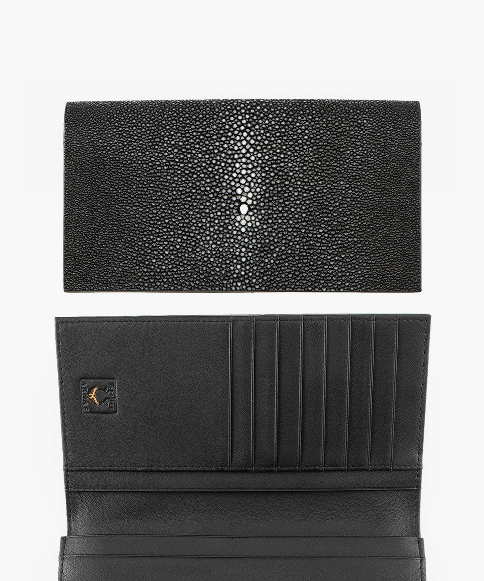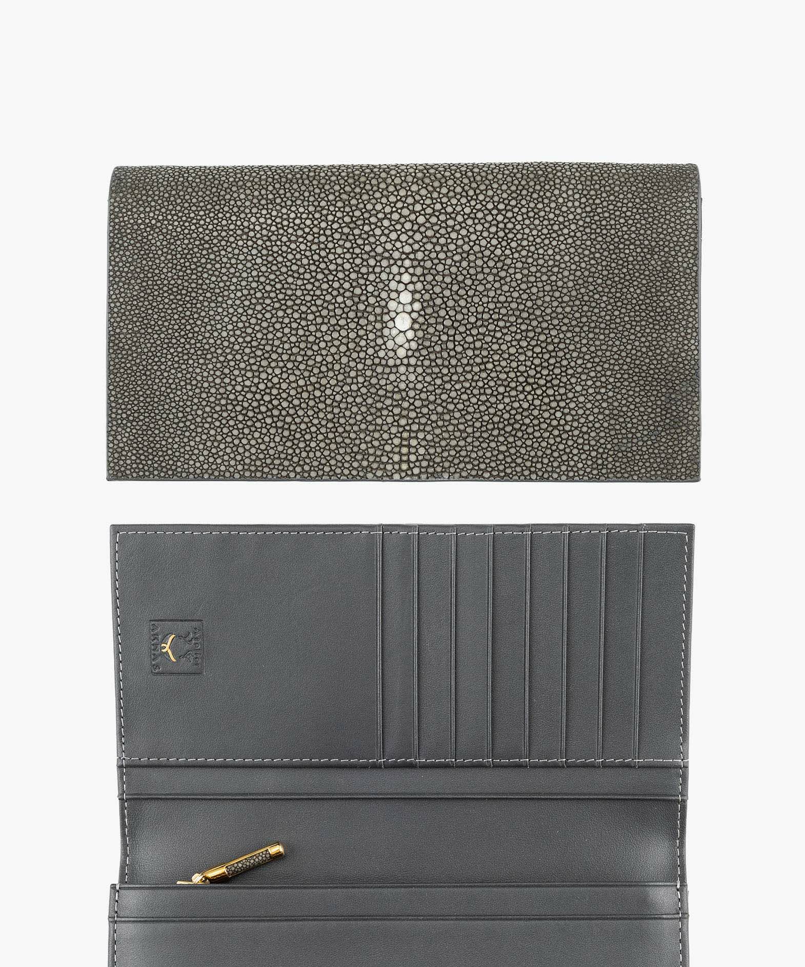 革職人たちの飽くなき探求と努力、クリエイティビティとクオリティが、革製品としての最高のパフォーマンスを実現しているブランド『Atelier AKNAS』の長財布(小銭入れ付き)。圧倒的に堅固で扱いにくい反面、“100年モノ”と言われるくらい強度と耐久性に優れていることでも有名なエイ革「ガルーシャ」が、ガラスビーズを散りばめたような小さな鱗による他とは異なる美しさを放ち、個性を輝かせる大人の魅力を演出。重厚感あふれる外装と相反するほどに繊細な内装は、扱いやすく収納性に優れたポケットの多さも魅力で、スマート&オールインワンの機能美を称えながら、シックでハイセンスな極上感を醸し出させてくれる。