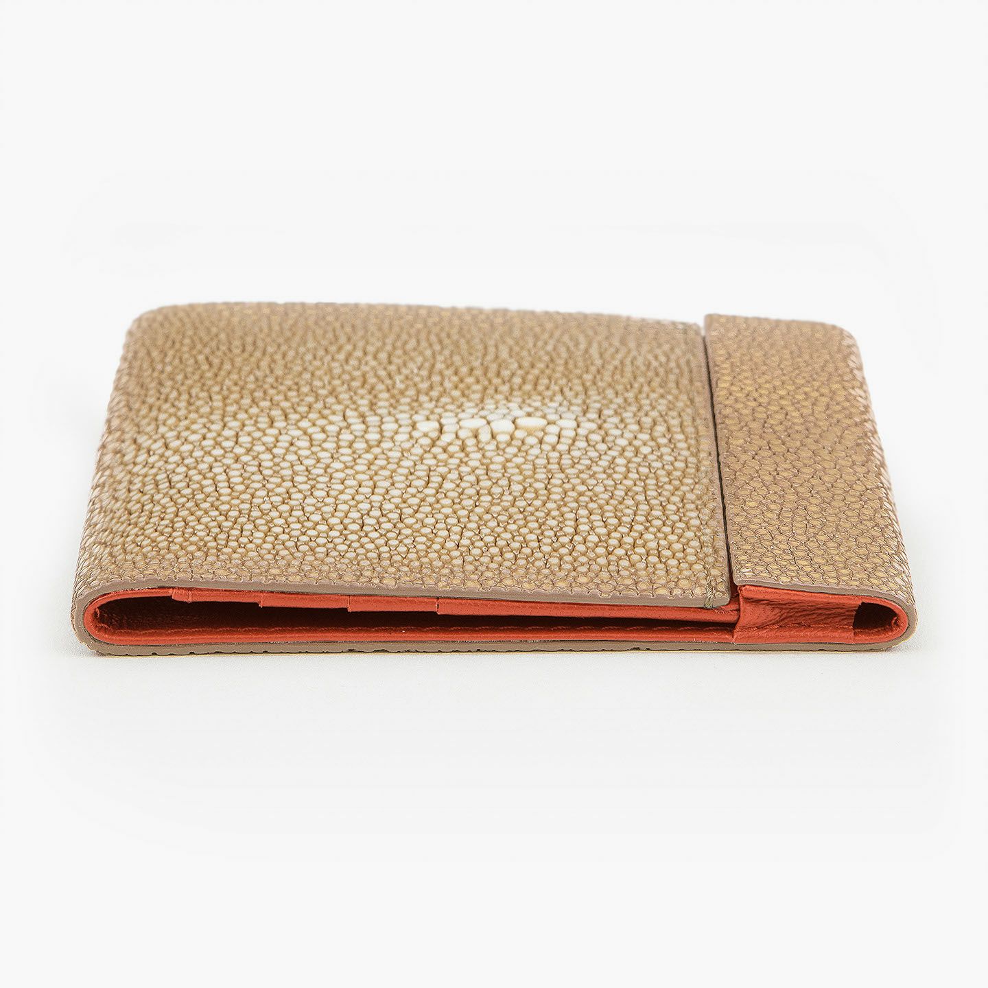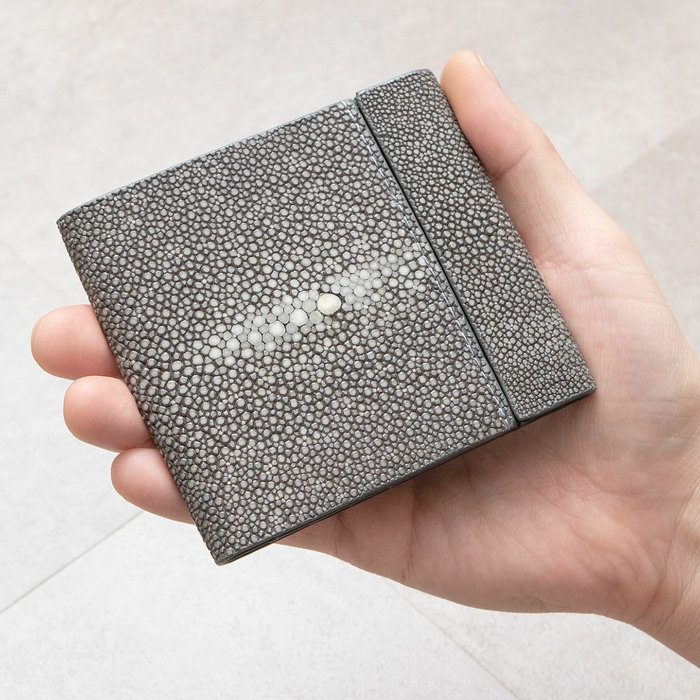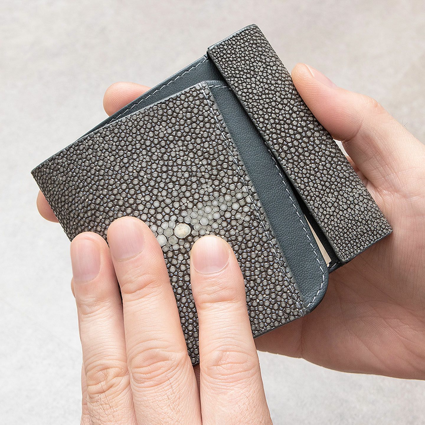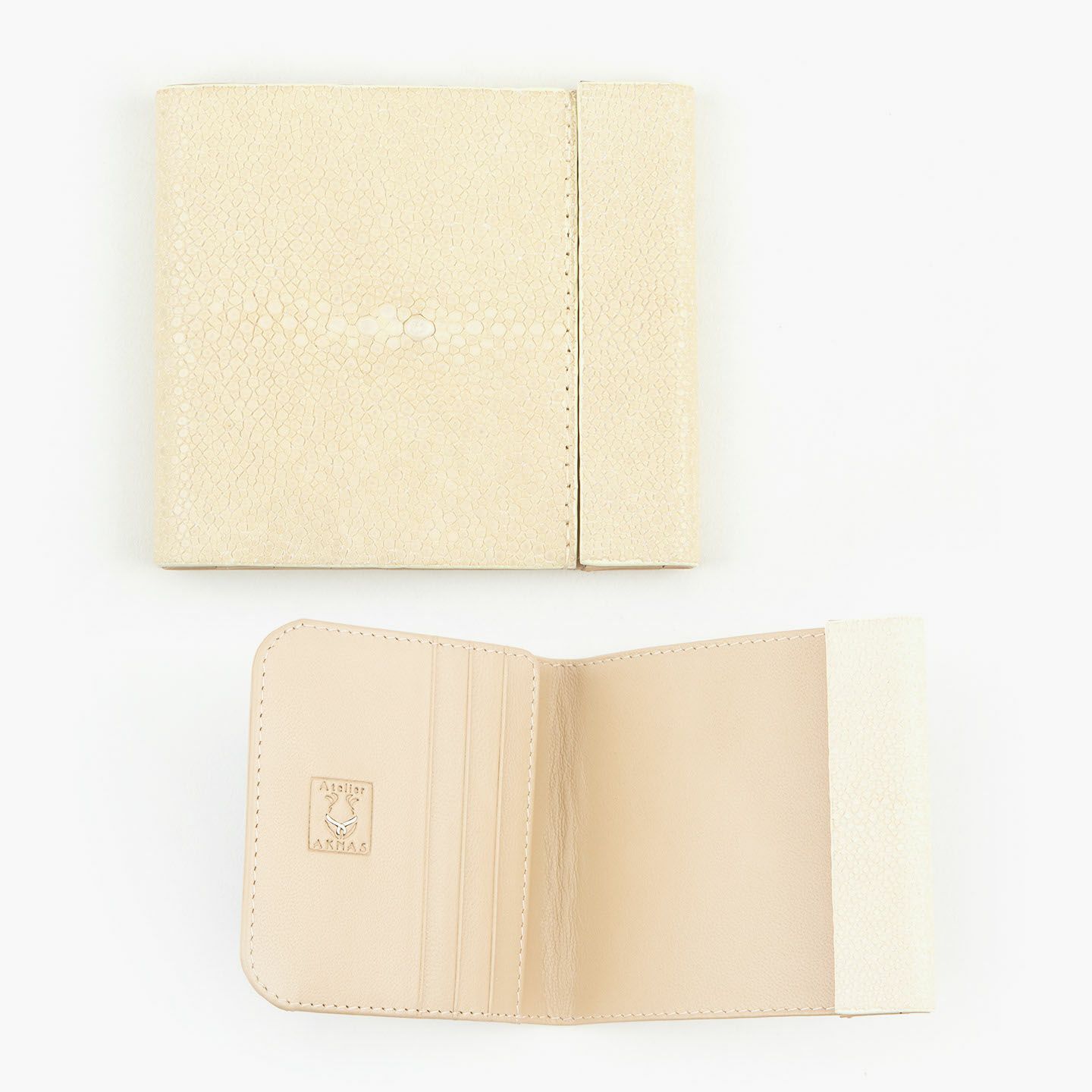 使いやすく永く愛されるフレンチならではの美しいデザインとともに、革製品としての最高のパフォーマンスへと導いているブランド『Atelier AKNAS』のスリムコンパクトウォレット。アカエイの小さな鱗模様で魅せる、ガラスビーズを散りばめたように美しい海の宝石「ガルーシャ」が、この上ない高級感を外装として輝かせながら、唯一無二の魅惑的な味わいを創出。その佇まいを印象づけているシンプルな意匠は、ボタンなどの金具パーツを使わずに、フラットに閉じる独自設計のカブセにより実現。カラフルで豊富なカラーバリエーションをラインナップし、いまの時代性に相応しいジェンダーレスなアイテムとして魅力を高めてくれる。