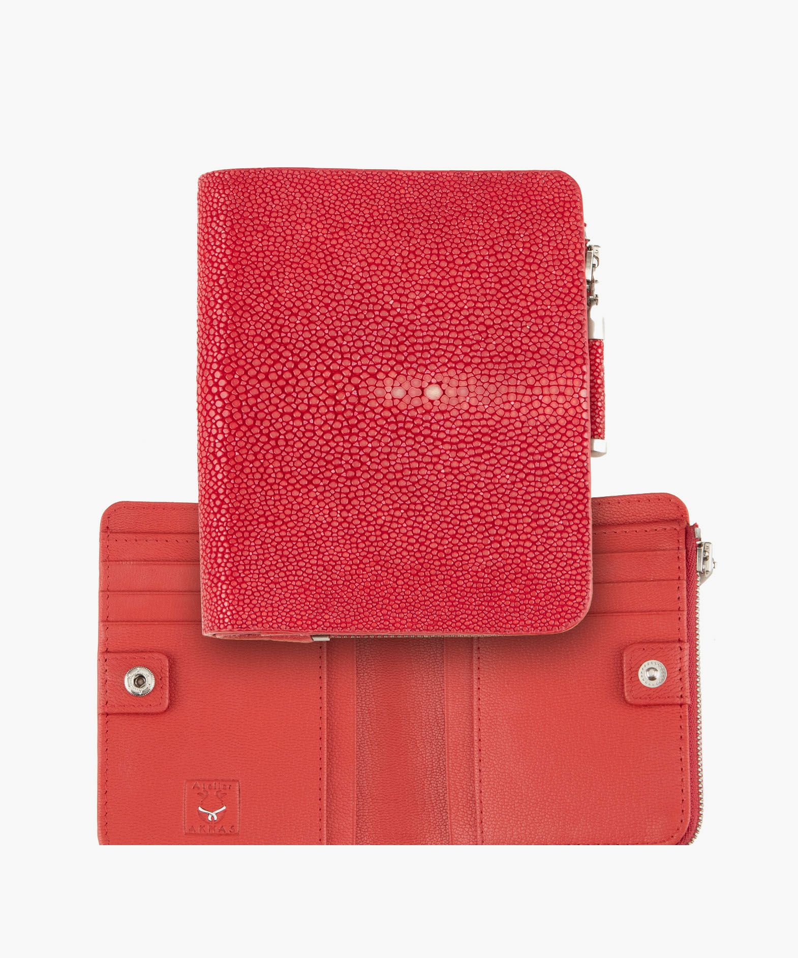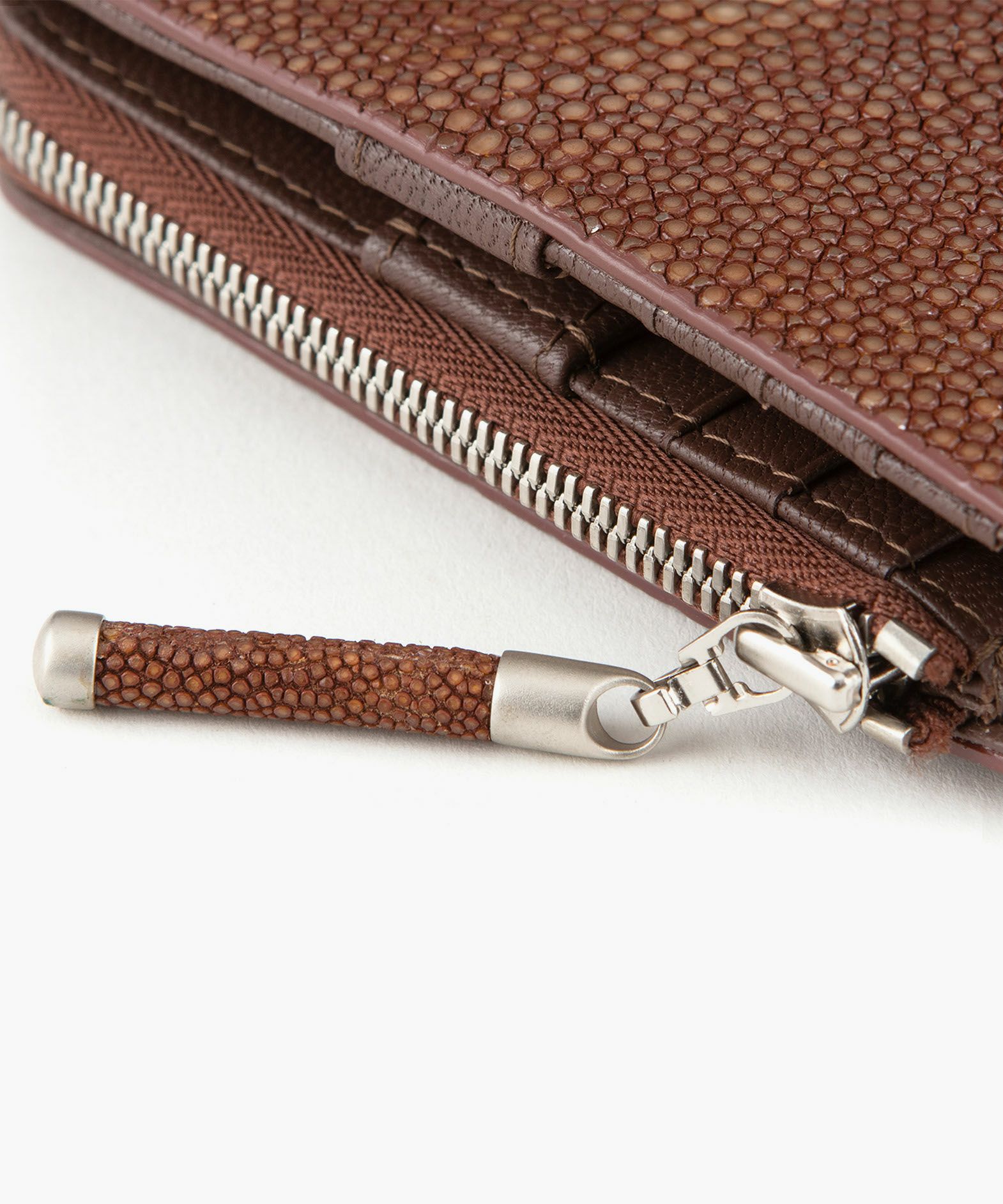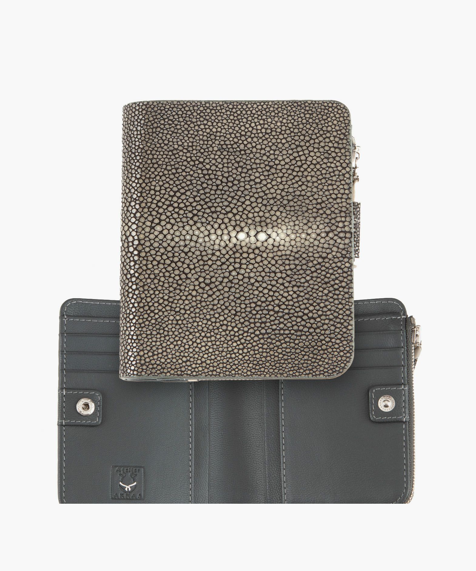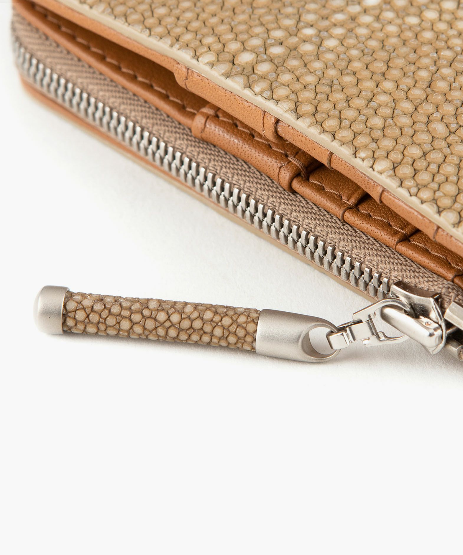 クールで洒落た人生の旅へと誘っていく、“Cuirs D'ailleurs 〜旅するレザー〜”をコンセプトにしている、ブランド『Atelier AKNAS』のミドルウォレット。ジェンダーレスで好まれるラウンドフォルムに、ガラスビーズを散りばめたようなアカエイの小さな鱗が美しい、海の宝石「ガルーシャ」を外装として贅沢に纏わせ、地中海の潮風を指先で感じるような冷んやりとした感触も魅力的。オリジナルの引き手とともにデザインのアクセントにもなっているL字ファスナー式小銭入れのほか、札入れ1つ・フリーポケット4つ・カードポケット6つも備えている充実した収納力で、普段使いにおける機能美へのこだわりも感じさせてくれる。