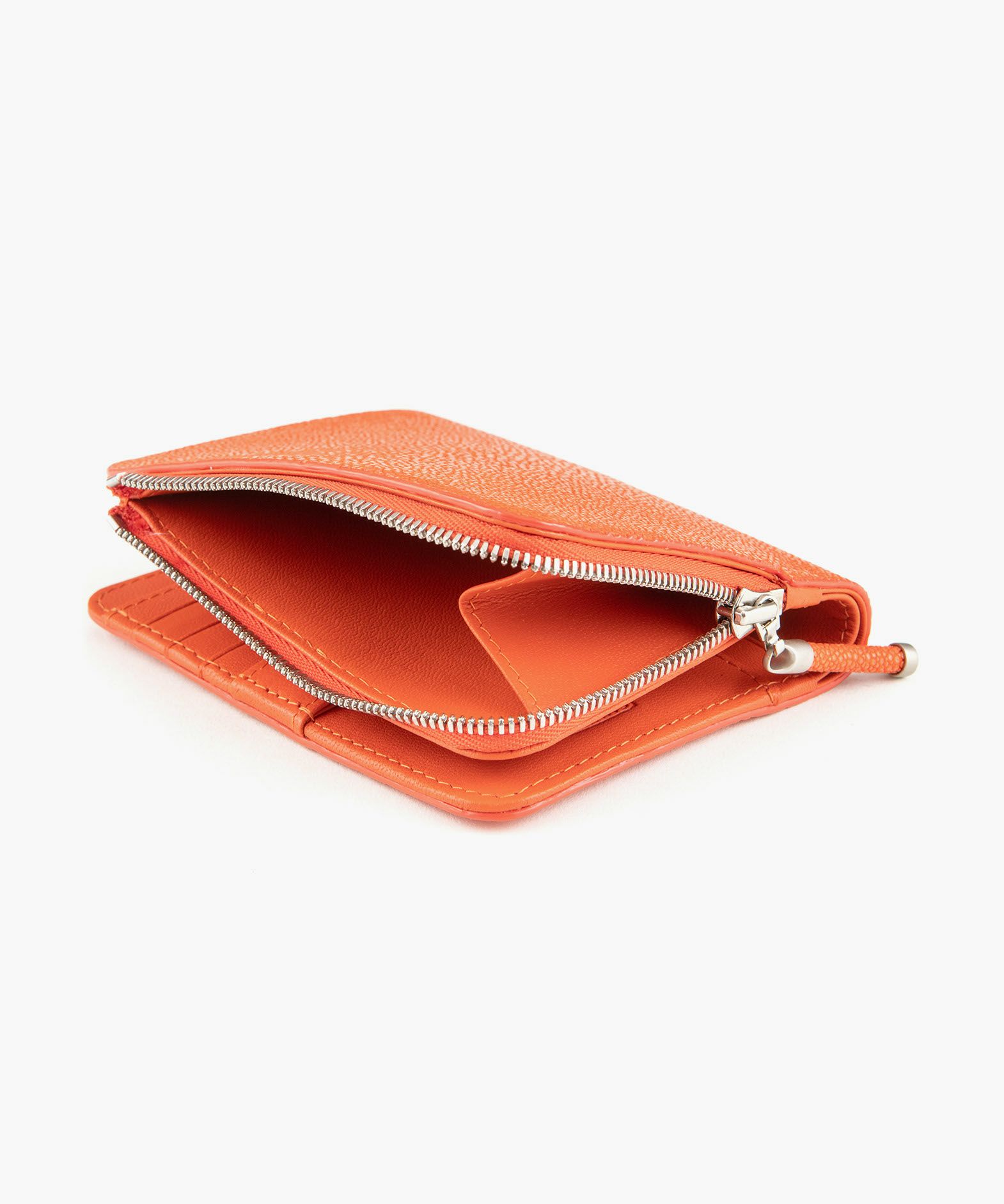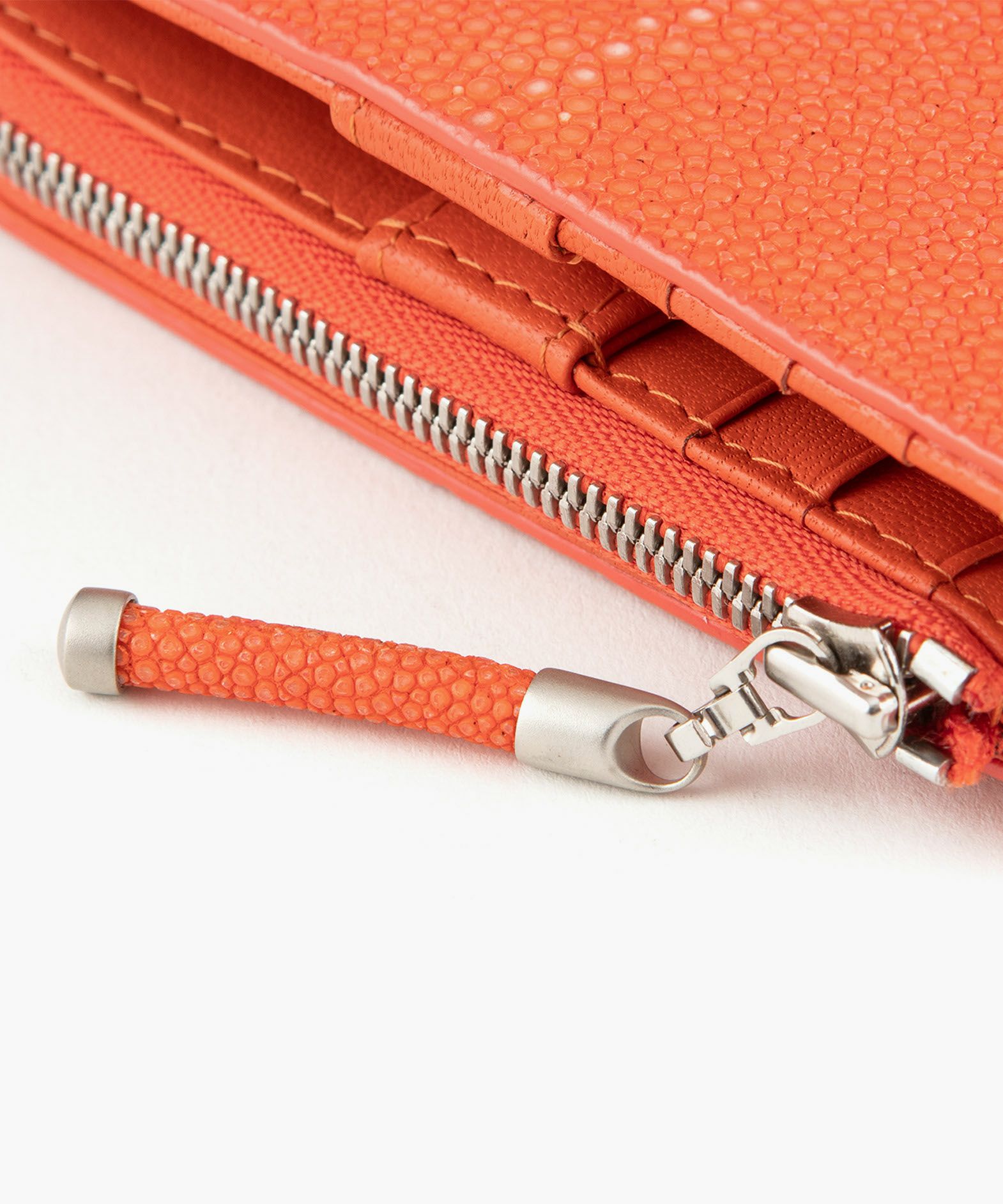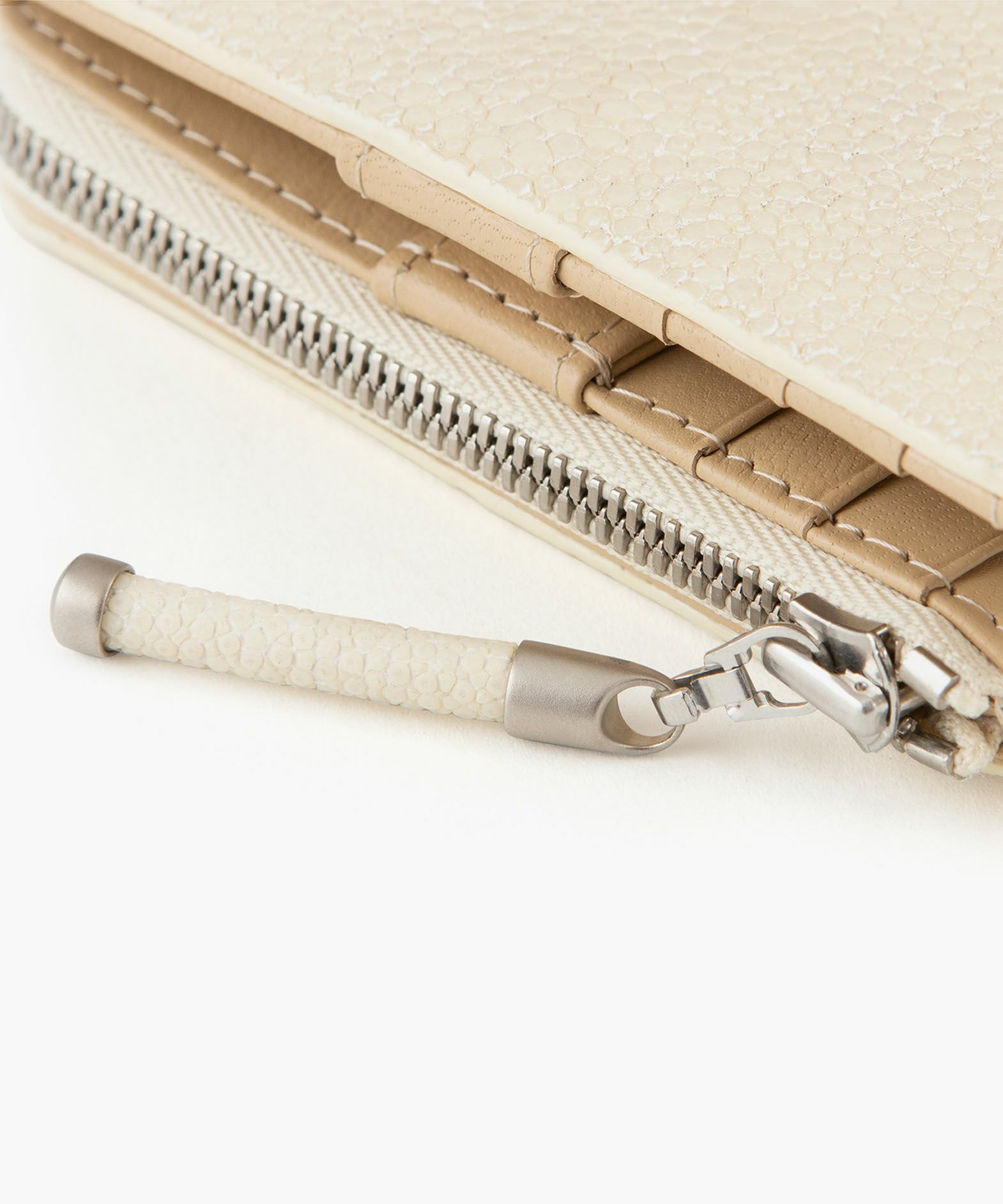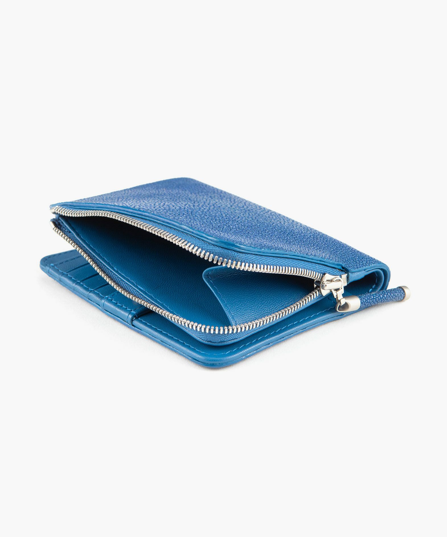クールで洒落た人生の旅へと誘っていく、“Cuirs D'ailleurs 〜旅するレザー〜”をコンセプトにしている、ブランド『Atelier AKNAS』のミドルウォレット。ジェンダーレスで好まれるラウンドフォルムに、ガラスビーズを散りばめたようなアカエイの小さな鱗が美しい、海の宝石「ガルーシャ」を外装として贅沢に纏わせ、地中海の潮風を指先で感じるような冷んやりとした感触も魅力的。オリジナルの引き手とともにデザインのアクセントにもなっているL字ファスナー式小銭入れのほか、札入れ1つ・フリーポケット4つ・カードポケット6つも備えている充実した収納力で、普段使いにおける機能美へのこだわりも感じさせてくれる。