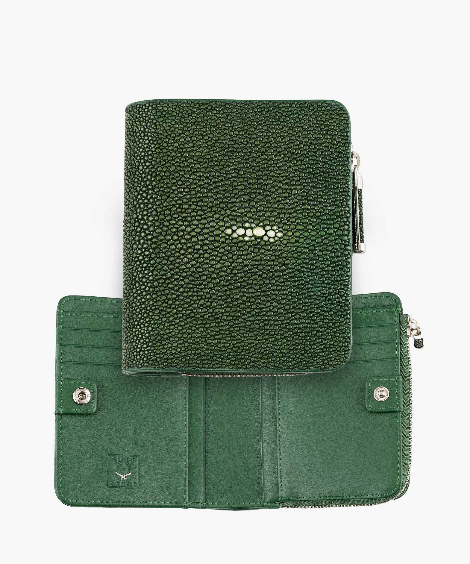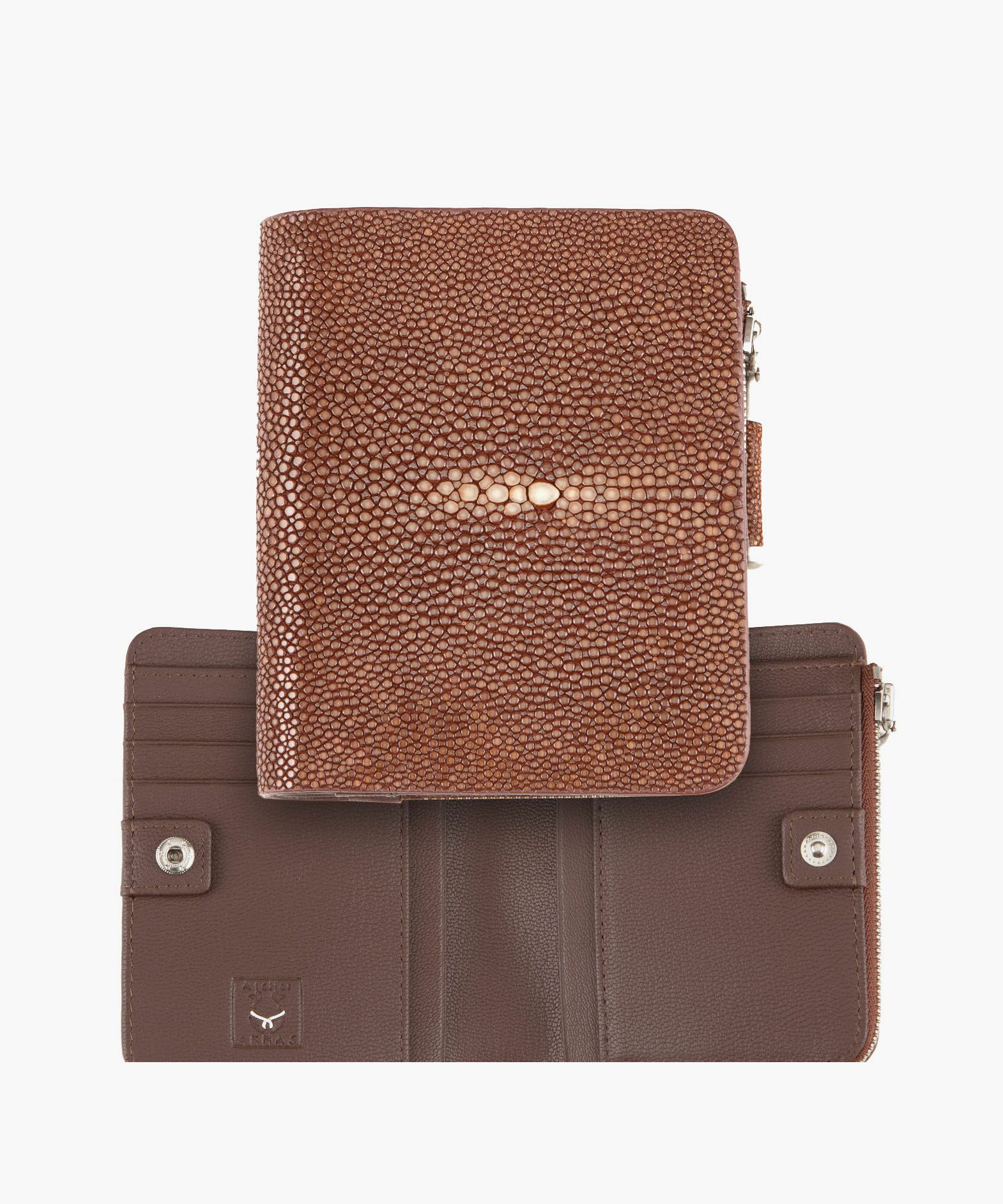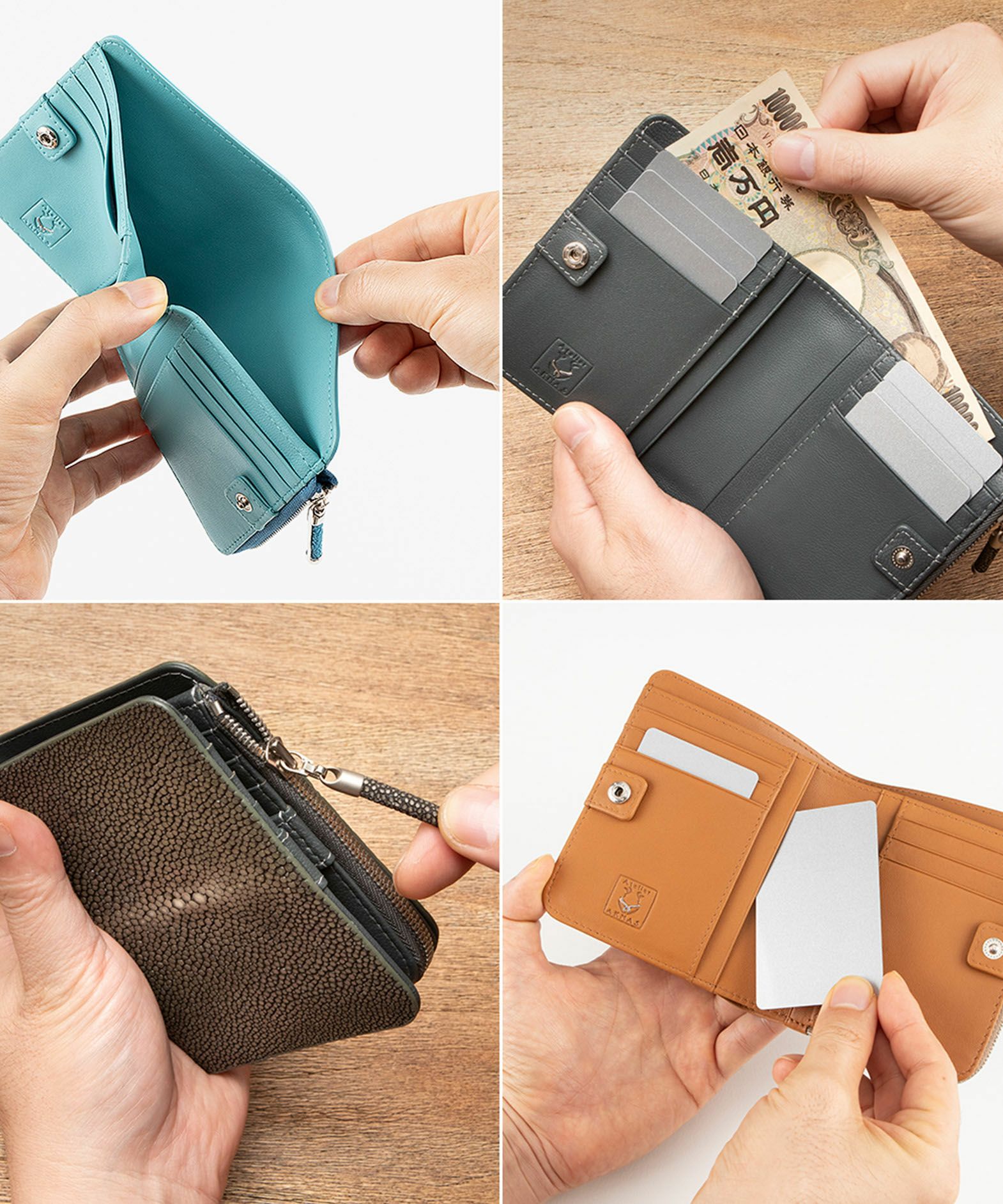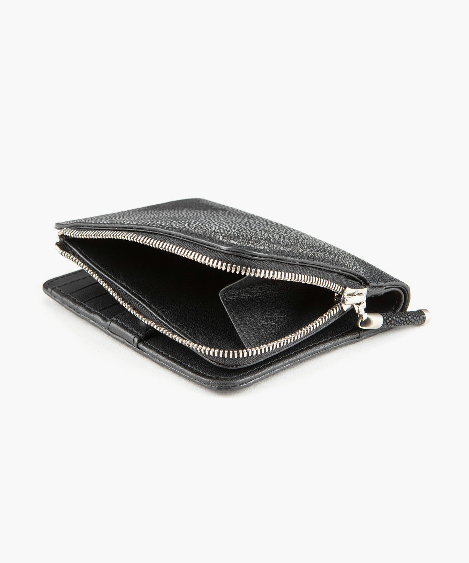 クールで洒落た人生の旅へと誘っていく、“Cuirs D'ailleurs 〜旅するレザー〜”をコンセプトにしている、ブランド『Atelier AKNAS』のミドルウォレット。ジェンダーレスで好まれるラウンドフォルムに、ガラスビーズを散りばめたようなアカエイの小さな鱗が美しい、海の宝石「ガルーシャ」を外装として贅沢に纏わせ、地中海の潮風を指先で感じるような冷んやりとした感触も魅力的。オリジナルの引き手とともにデザインのアクセントにもなっているL字ファスナー式小銭入れのほか、札入れ1つ・フリーポケット4つ・カードポケット6つも備えている充実した収納力で、普段使いにおける機能美へのこだわりも感じさせてくれる。