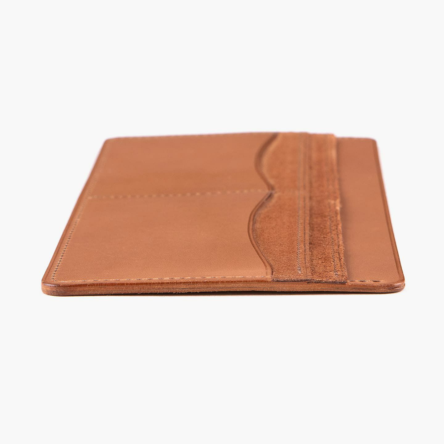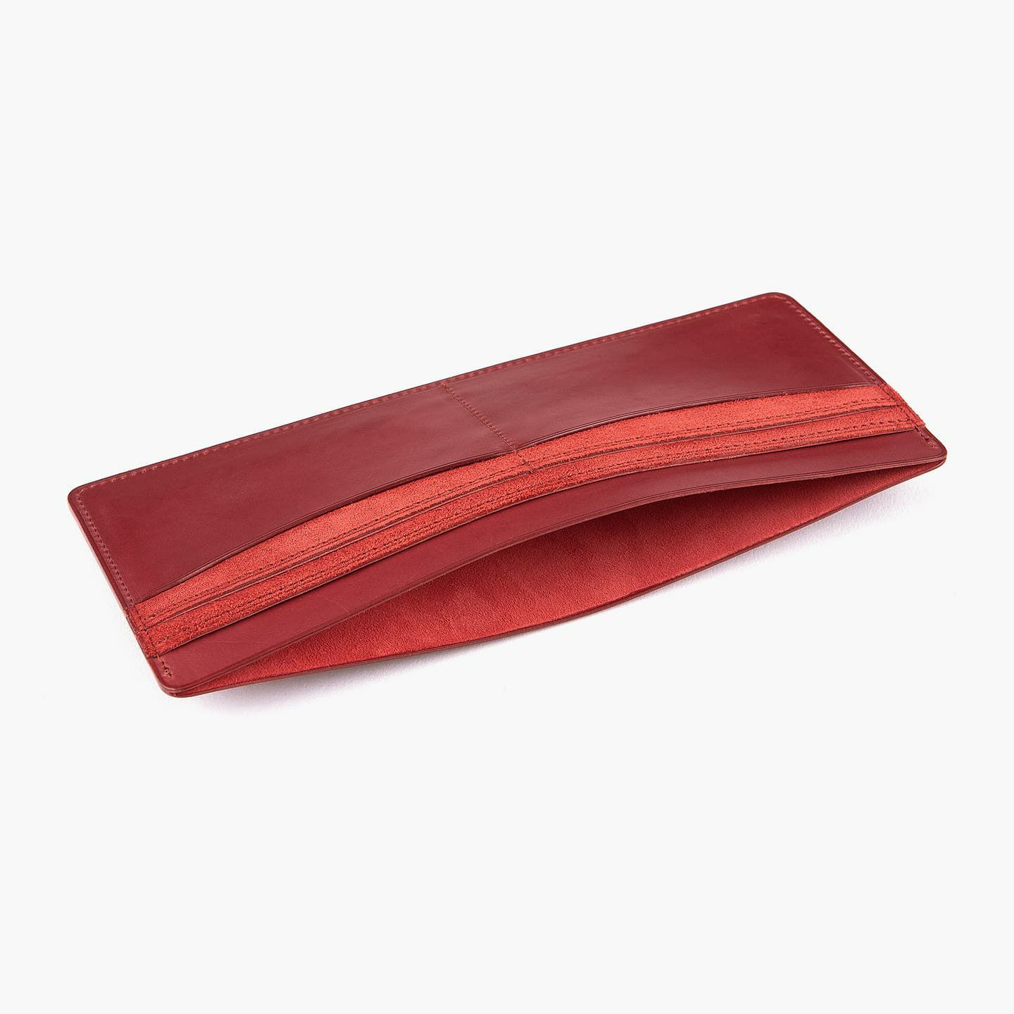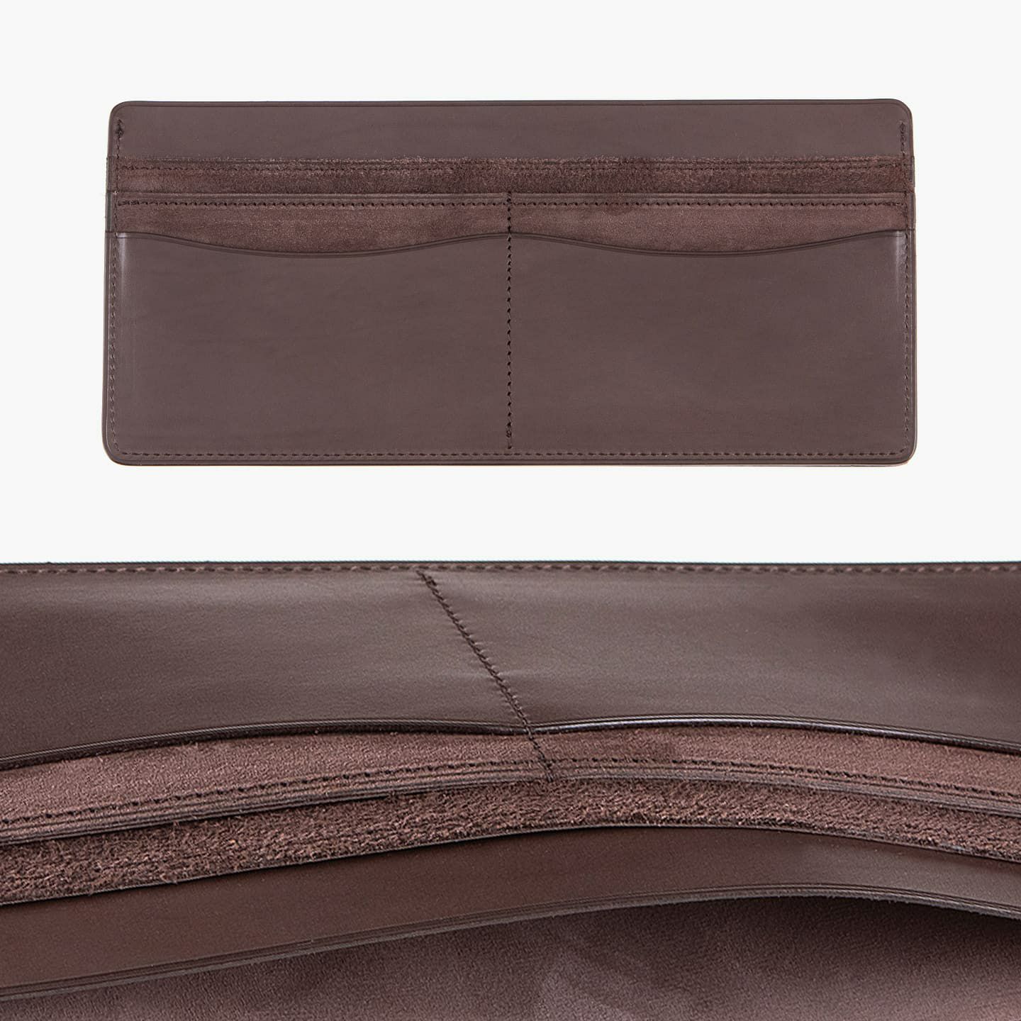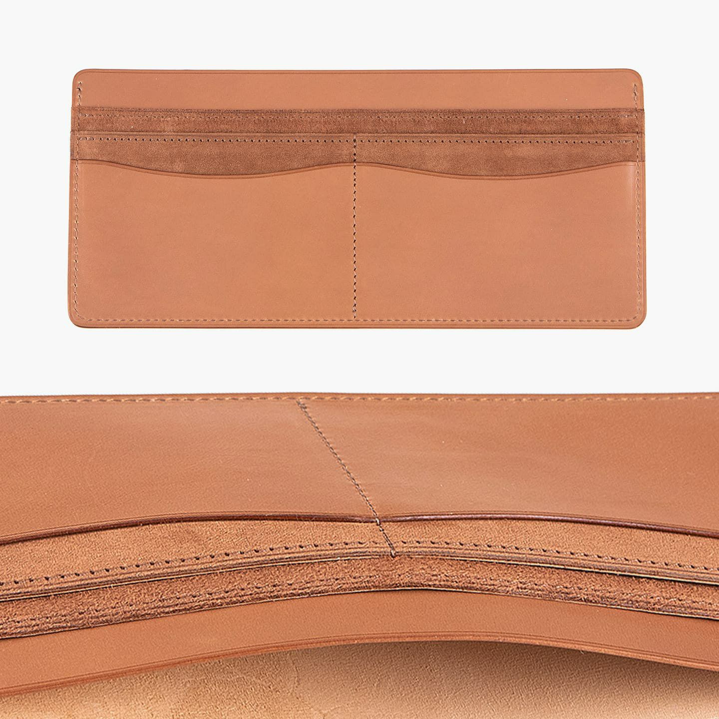 「ベビーカーフ」の滑らかな質感・しなりが感じられるように、不要な縫製を施さずに札入れ・カードポケットを実現。一般的な長財布が備えているカブセがなくても、安心して手軽に使える利便性を追求しています。カードの使用を前提に、指通りの良いカットラインにするなど、使いやすさとデザイン性を兼ね備えたシンプルな設計。また、札入れポケットには、紙幣だけでなくレシート・領収書なども収納できます。