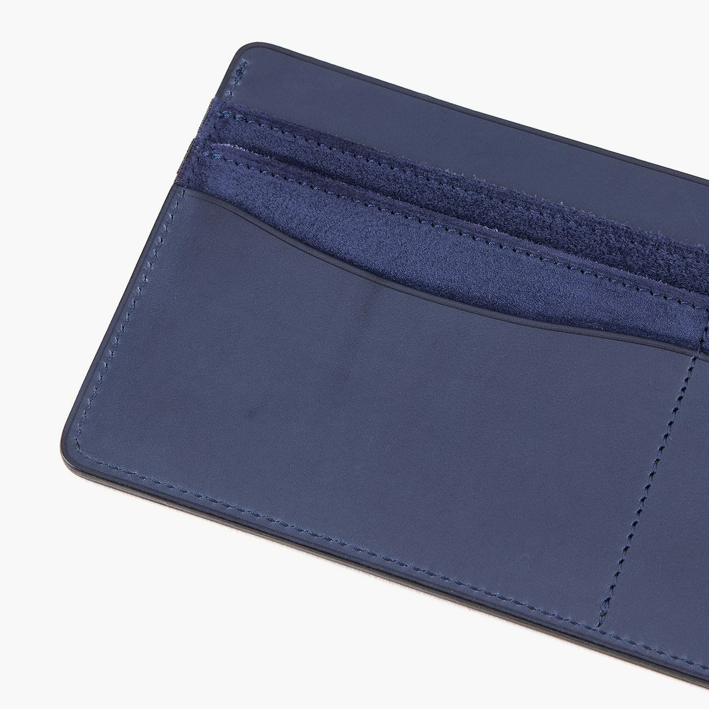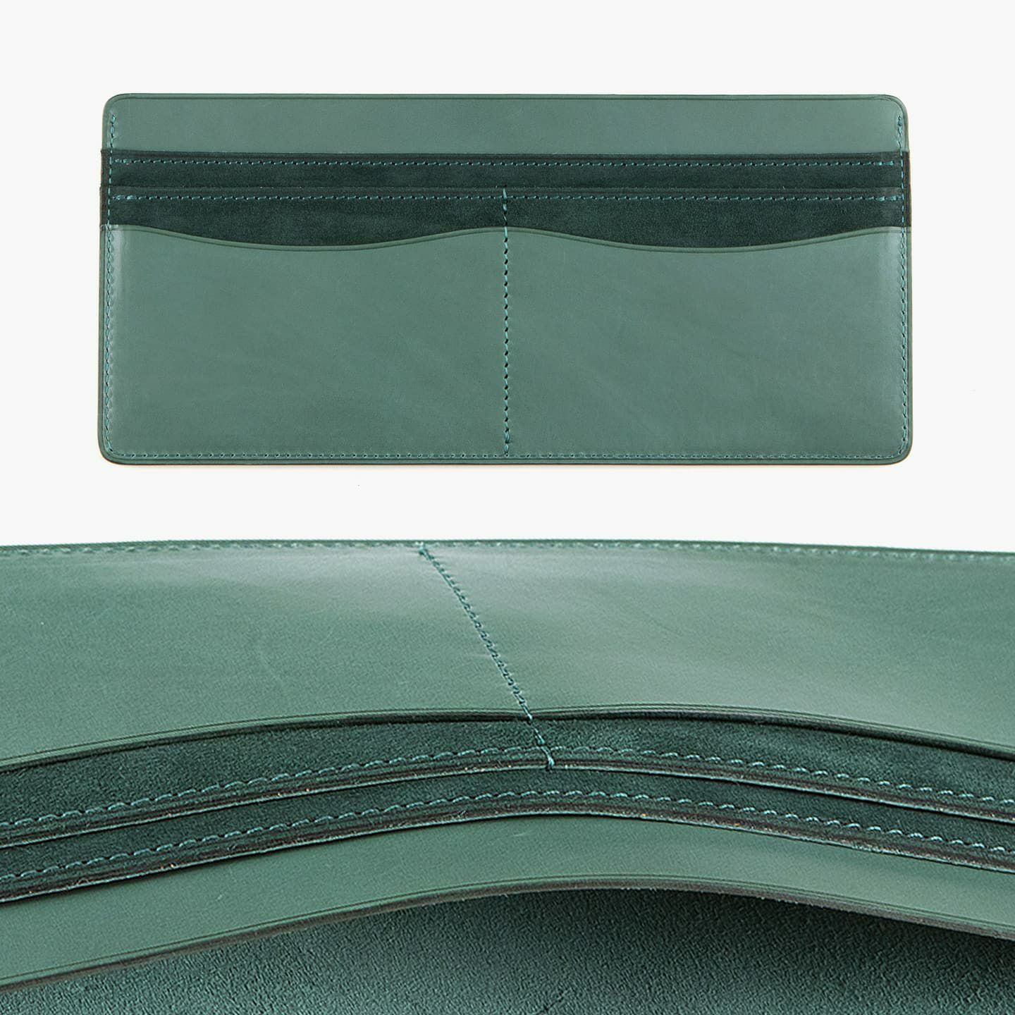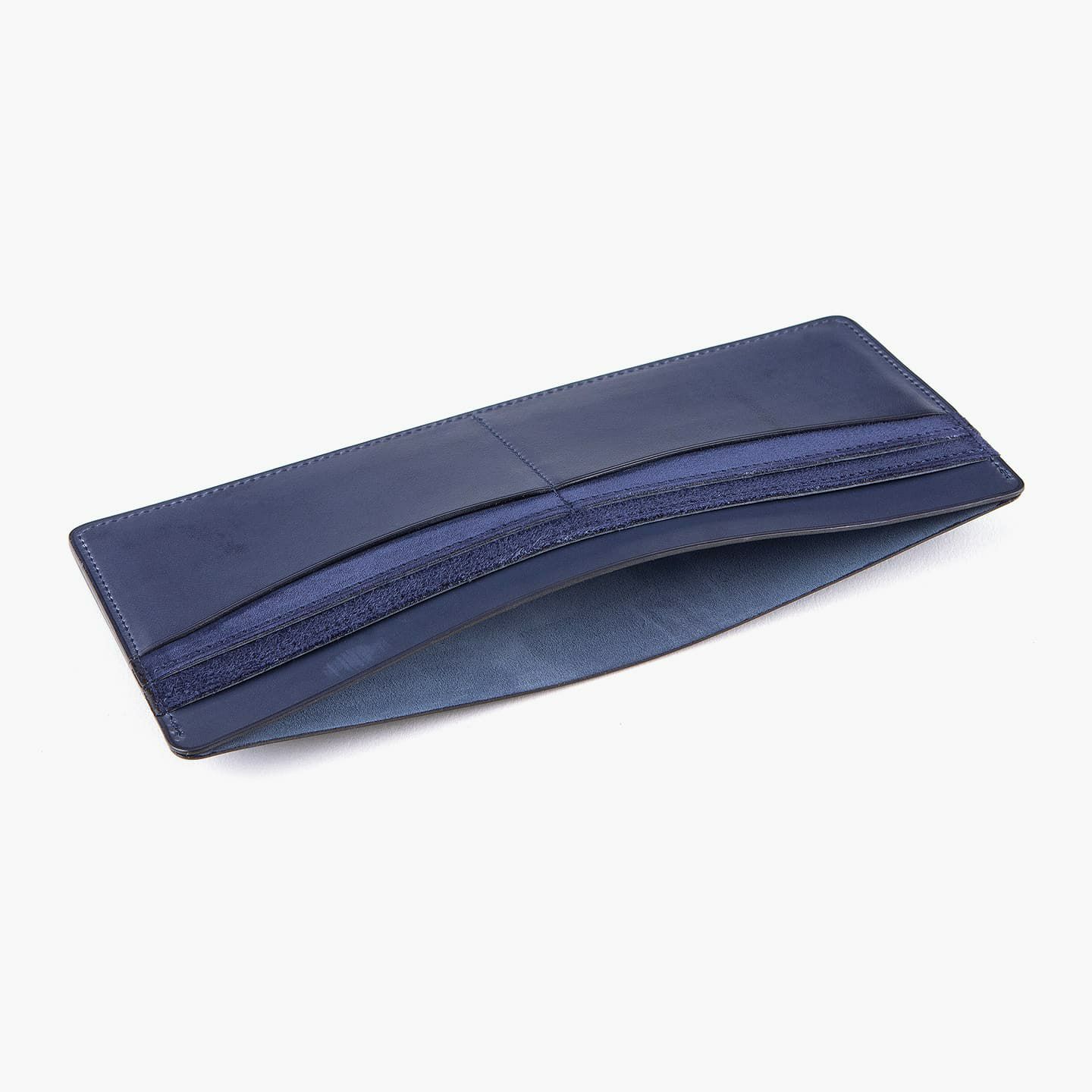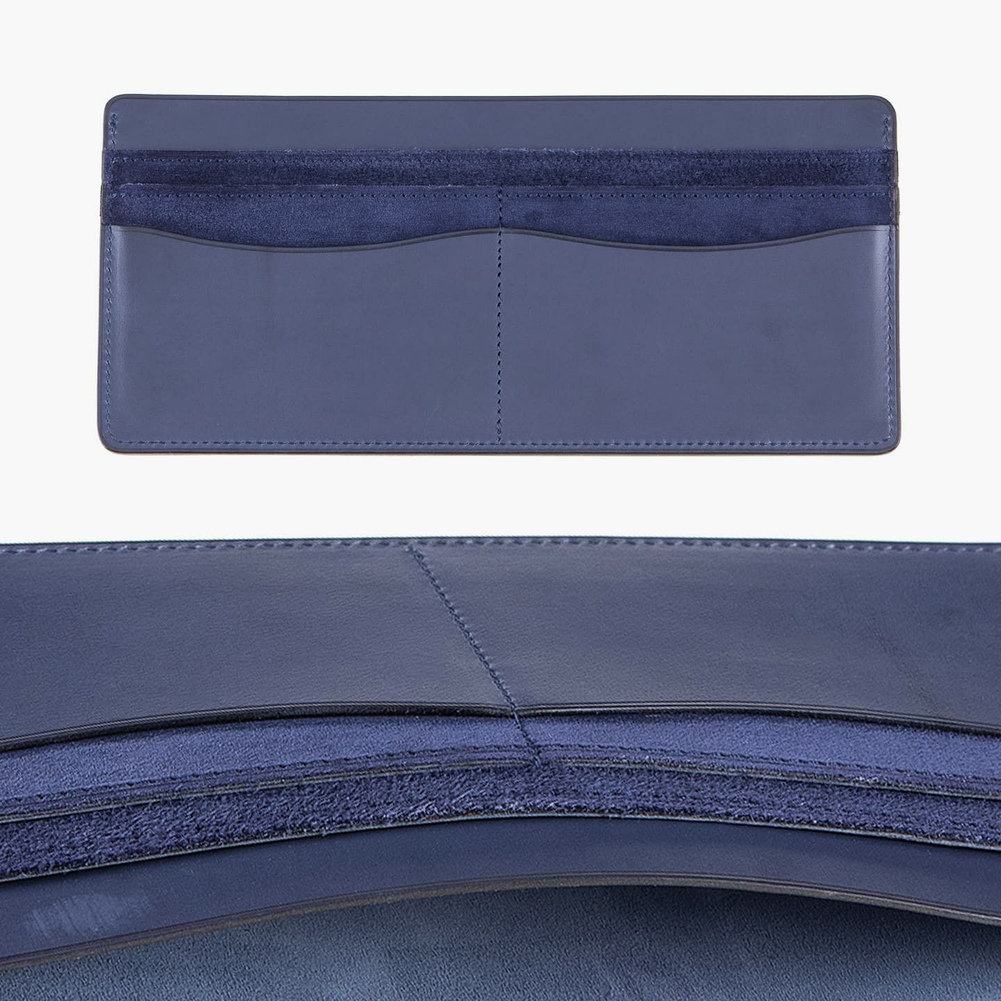 縫製で厚くしない工夫から、裏地も用いずに「ベビーカーフ」の床面を効果的に活用。ツヤのある銀面とスエード調の床面は、色彩に立体感を与えるデザイン性とともに、カードや紙幣などが滑り落ちにくい実用性も兼ね備えています。