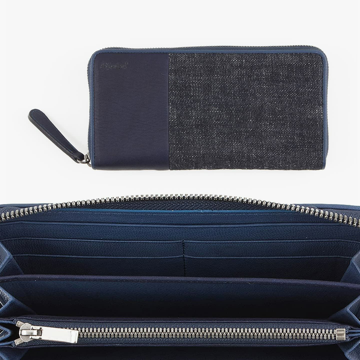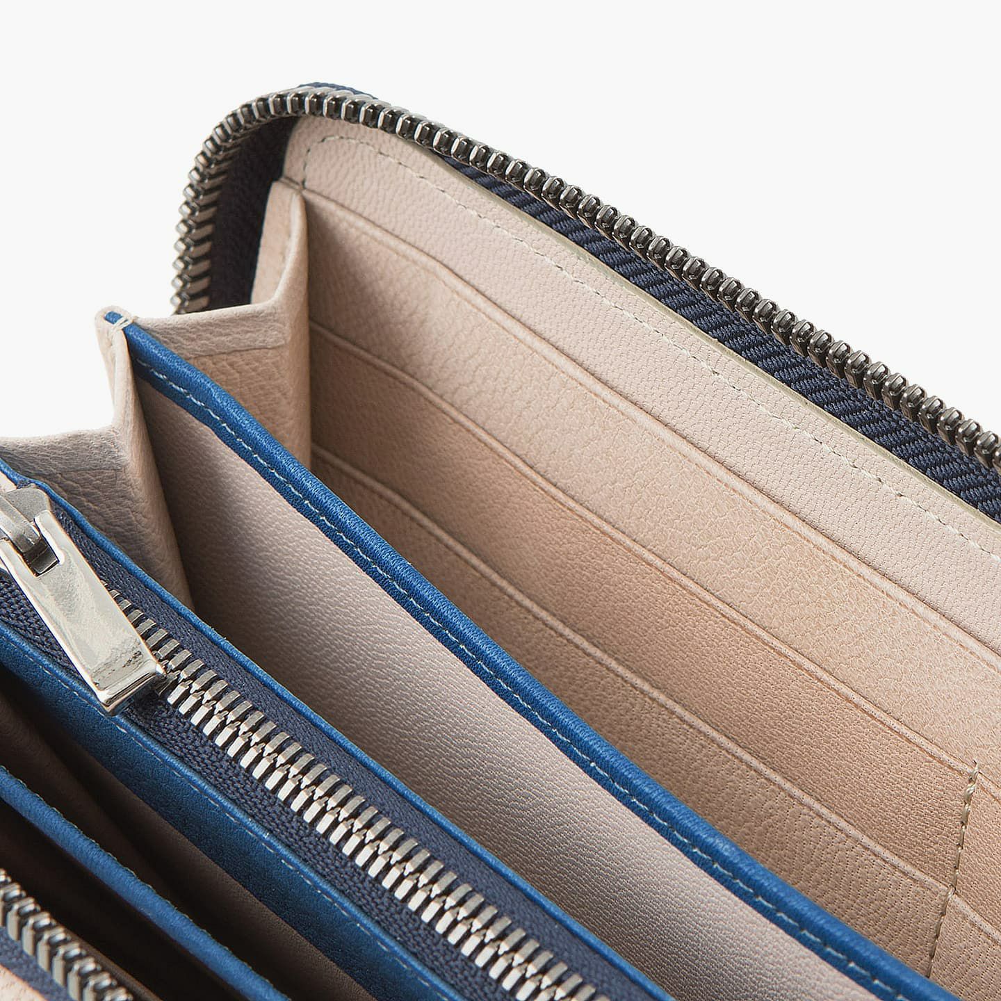 財布の内外ともに素材感があり、デザインの統一性も重視するため、あえてヌバックゴート革の銀面ではない裏面を使用。エイジングにより、手の脂などが染み込み、使うごとに自然なツヤが楽しめます。山羊革自体は、個性的な凹凸をしたシボと、独特な毛穴の形状が特長。薄くても丈夫で、型崩れしにくい特性があるため、高級レザー手袋やブランドのレザーシューズに使われることが多い素材です。また、しなやかで耐久性にも優れているので、身に付けるものやジャケットなどにも多く利用。アメリカ空軍がA-10フライトフローブ、アメリカ海軍がフライトジャケット(M-422)に使っていたことでも知られています。