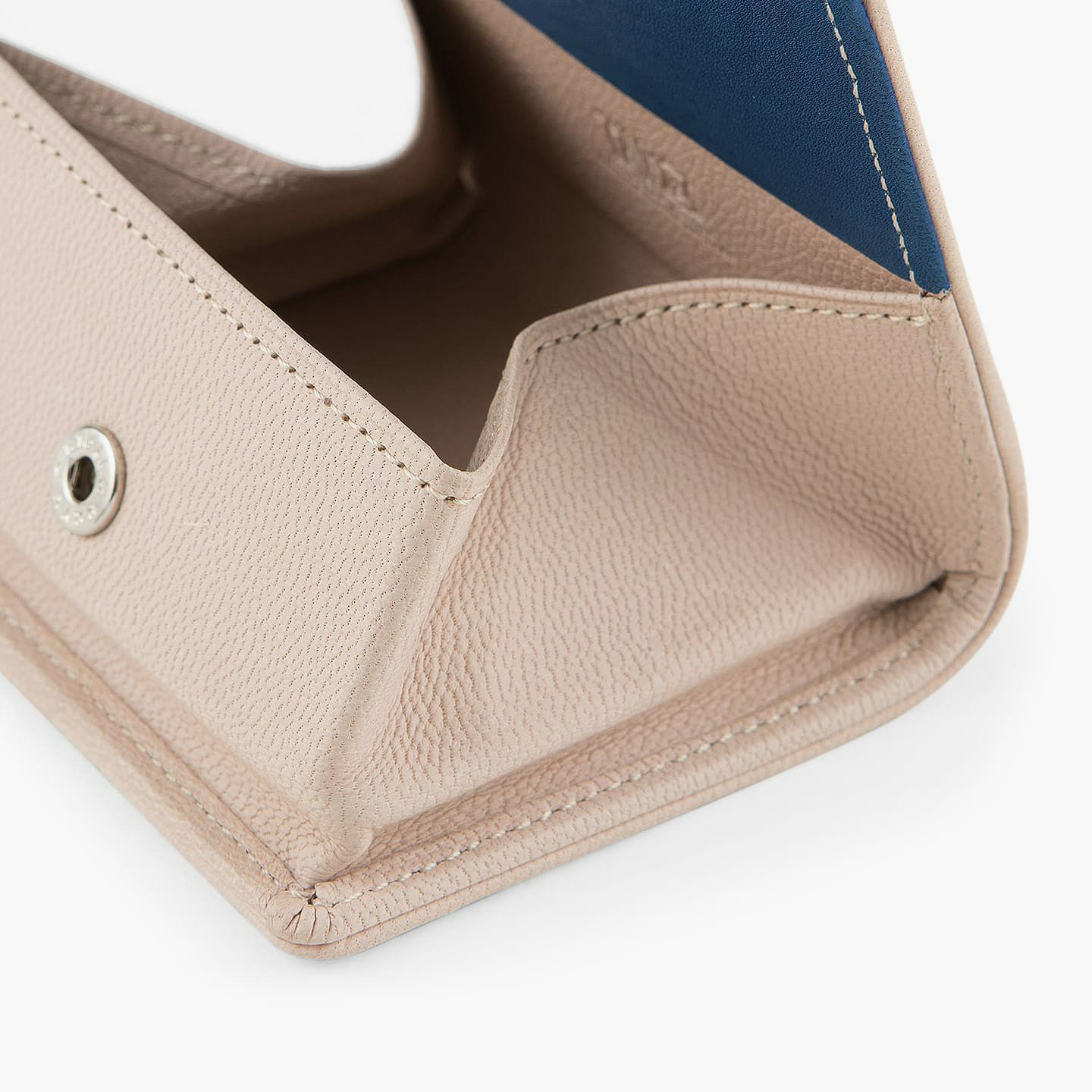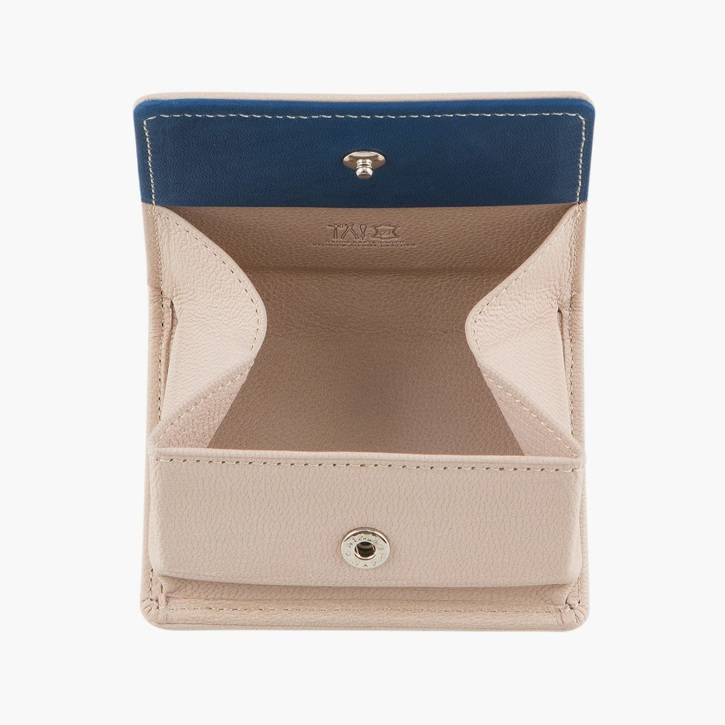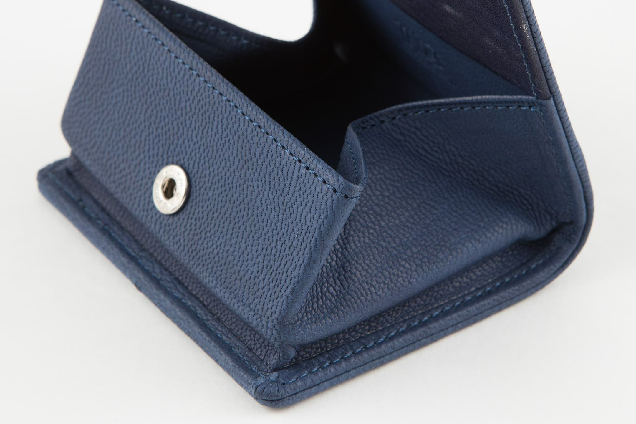 財布の内外ともに素材感があり、デザインの統一性も重視するため、あえてヌバックゴート革の銀面ではない裏面を使用。エイジングにより、手の脂などが染み込み、使うごとに自然なツヤが楽しめます。山羊革自体は、個性的な凹凸をしたシボと、独特な毛穴の形状が特長。薄くても丈夫で、型崩れしにくい特性があるため、高級レザー手袋やブランドのレザーシューズに使われることが多い素材です。また、しなやかで耐久性にも優れているので、身に付けるものやジャケットなどにも多く利用。アメリカ空軍がA-10フライトフローブ、アメリカ海軍がフライトジャケット(M-422)に使っていたことでも知られています。