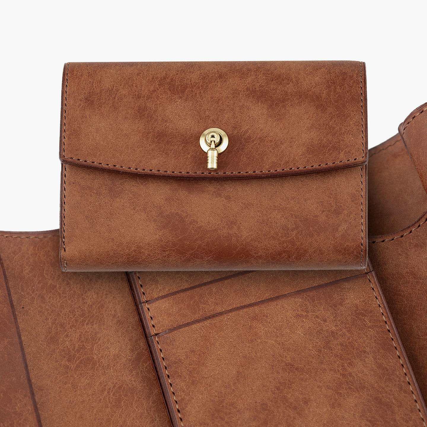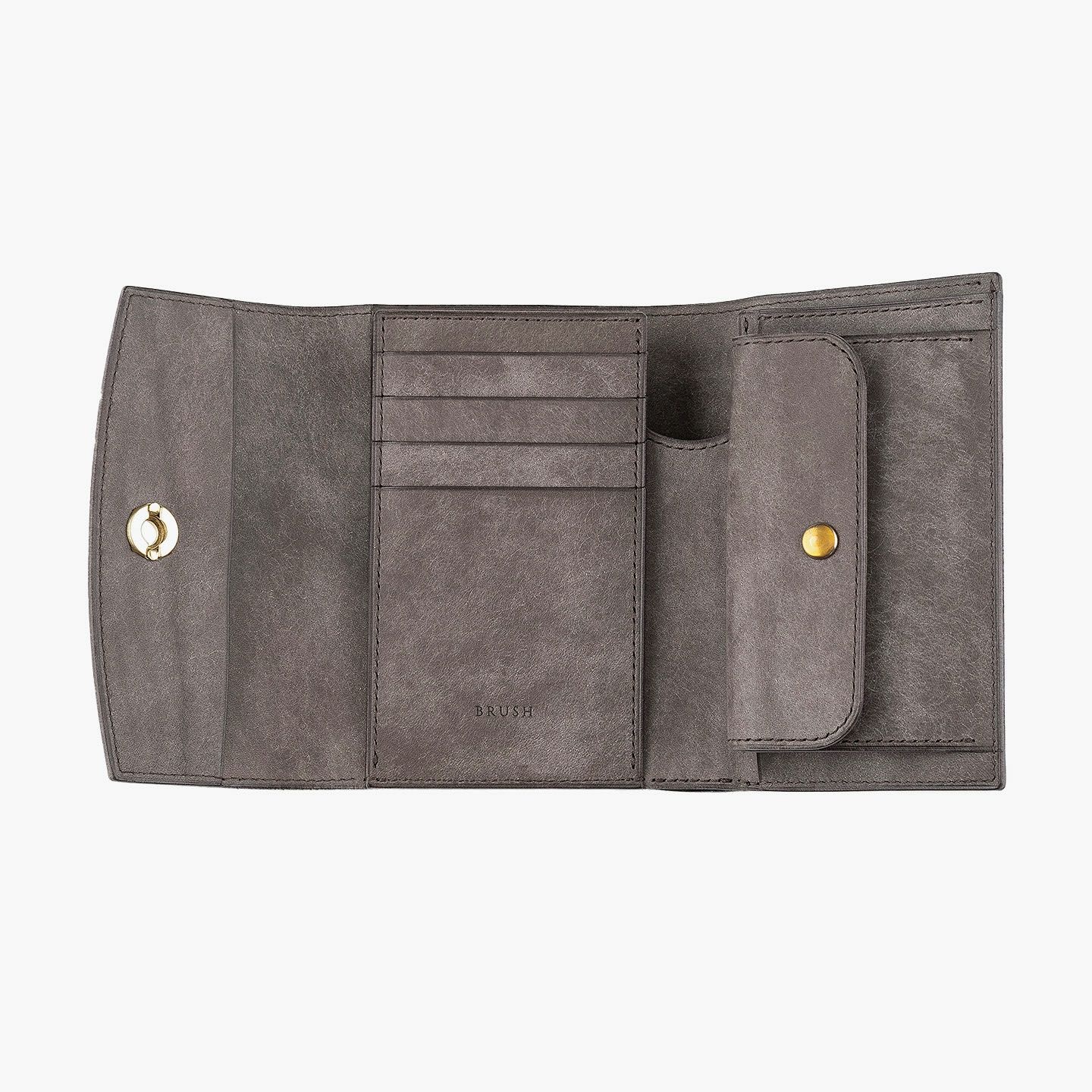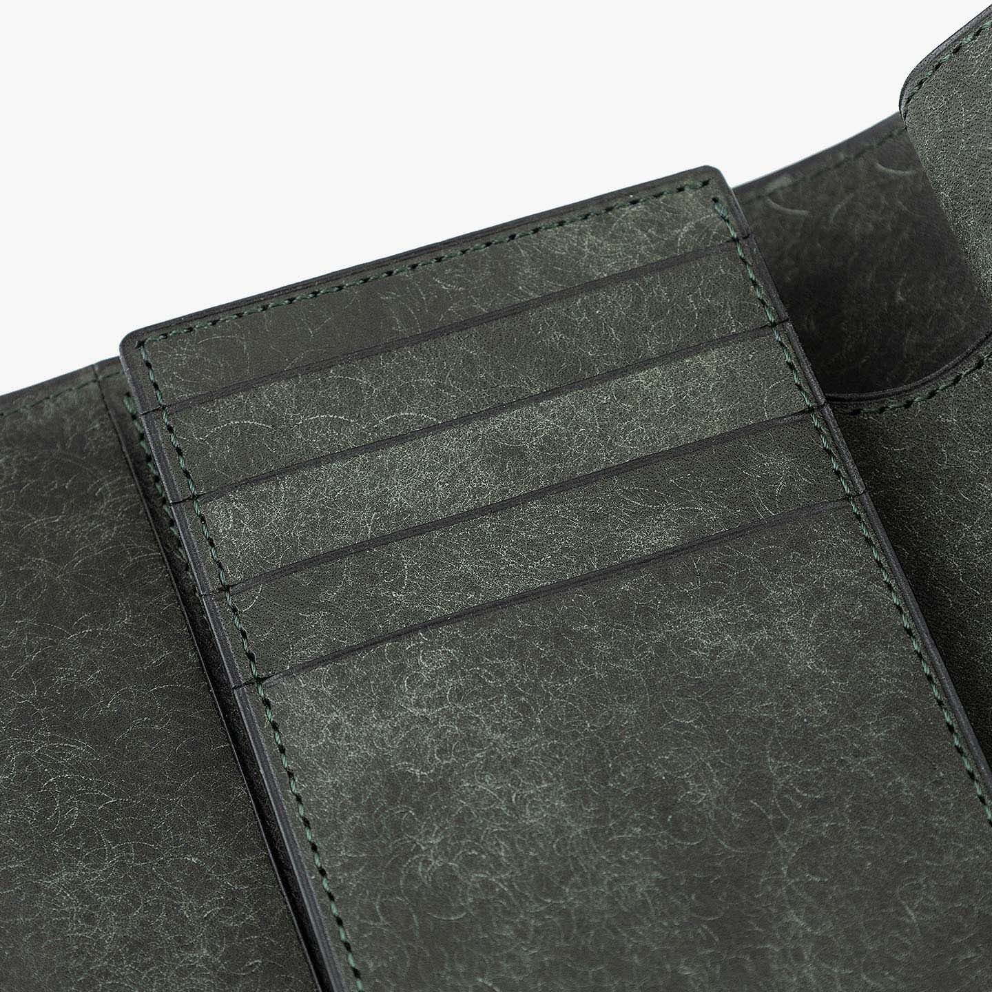 日本の工場にて真鍮の塊を削り出して成型しているフロントのオコシ金具は、丈夫で壊れにくく開閉時の重圧感・本物感も醸し出す挽物。イタリア産レザー「マルゴー」は、MLS別注カラー「Moss Green」とブランドラインナップ3色による、計4色からのセレクトオーダーが可能です。片側をあえて縫い付けていない札ばさみは、大きく開く視認性の良さに加えて、親指を掛けられるU字の窪みを設けることで扱いやすく、窪みの深さも女性の手のサイズに合わせた設計になっているのも魅力。さらに、収納性に優れたコインポケットとともに、カードポケット4つを備えたカード段、そのカード段の裏とコインポケットの裏にフリーポケット1つずつを装備し、充実した収納力も兼ね備えています。