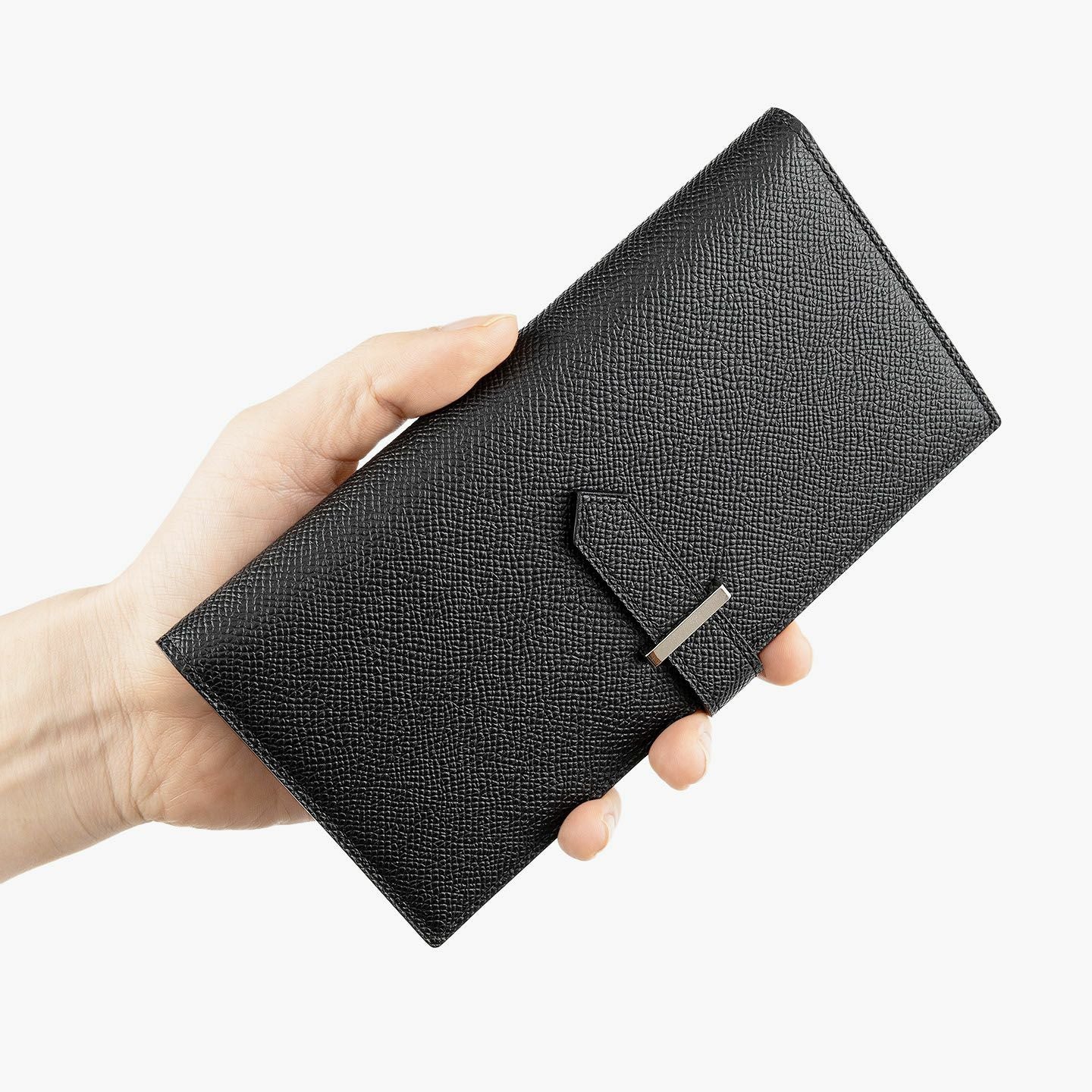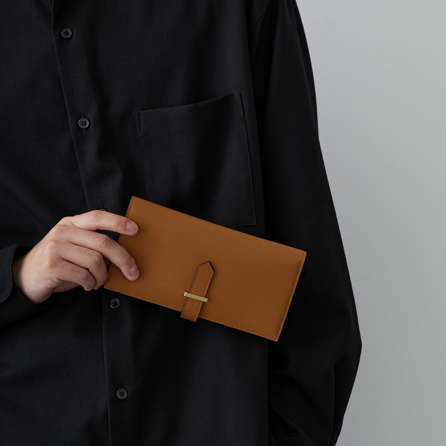 革製品の修理に携わっていた革職人・長谷川青矢が、自分でも使いたくなるような量産品では味わえない上質な革小物を製作している、ブランド『BRUSH』のロングウォレット。フランス語で「ベルト」を意味する“Santure”シリーズのアイテムで、その名の通りスリムな通しベルト&金具によるエレガントなアイコニックが魅力的で、フランス・アース社製の「ダービー」によるマットな型押しの美しい表情との高級感あふれる調和が、大人の感性と所有欲を刺激。ヨーロッパの有名老舗メゾンでも採用されているほどの、しっかりとしたハリ感と手にした瞬間に感じられる革質の極上感が、スタイリッシュなデザインとともに、日常使いの気分を上げてくれる。
