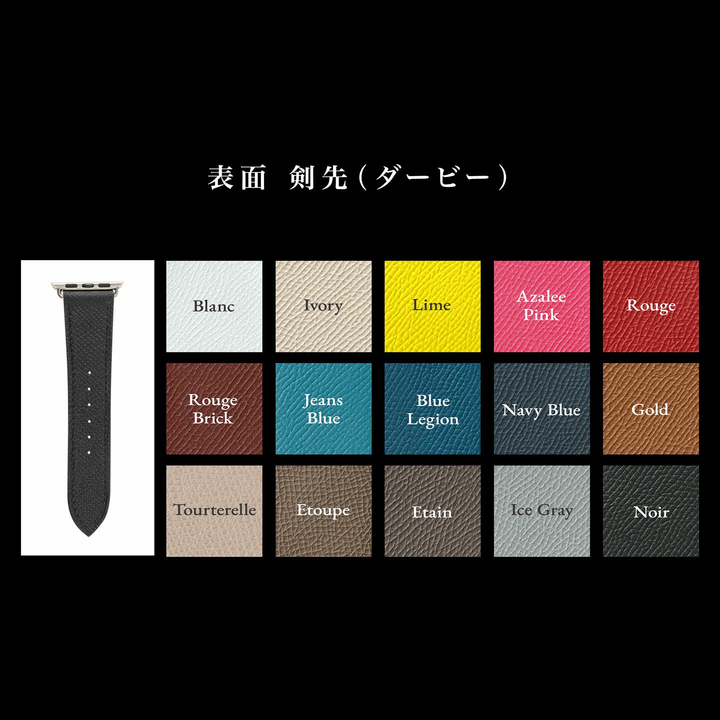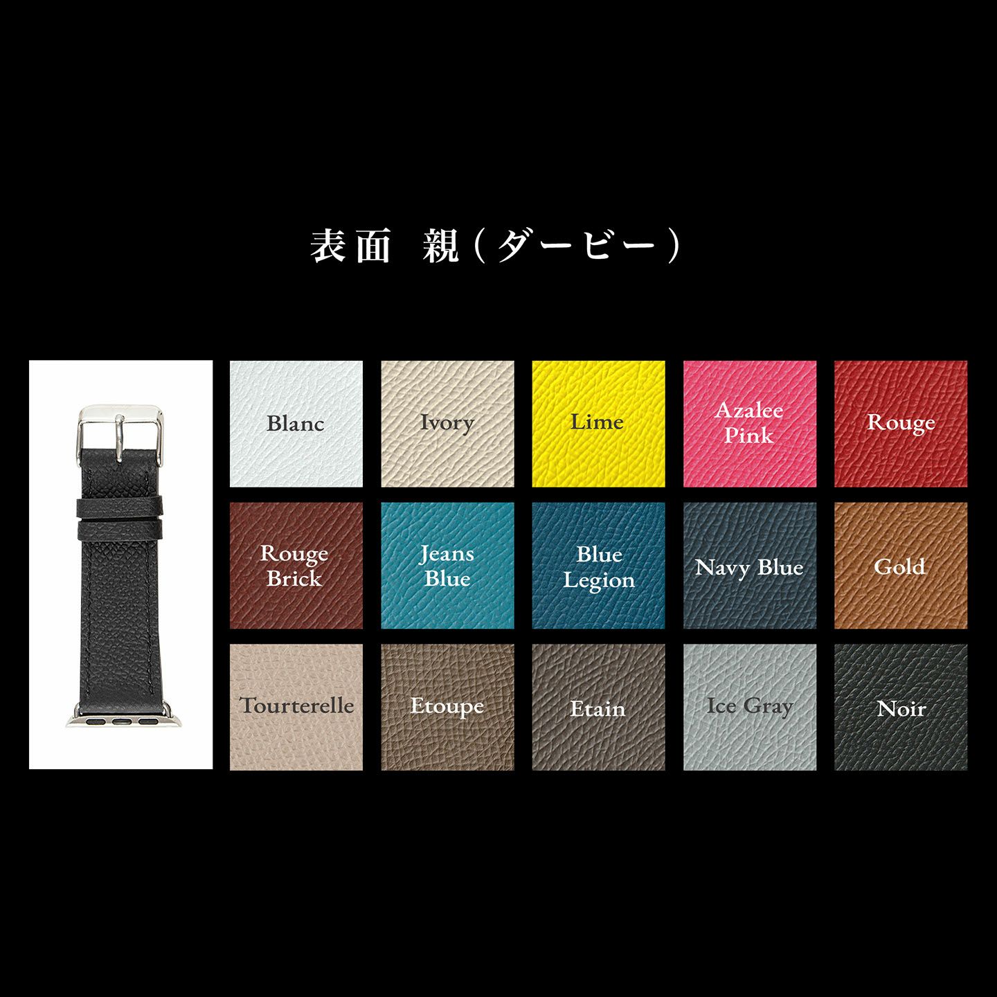 美しいシャープラインによる、シンプルにしてエレガントなデザインが魅力。凹凸のあるマットな質感が、腕周りのアクセサリー感を引き立てる表革「ダービー」は、親(尾錠)サイド・剣先サイドそれぞれ6色からセレクトでき、糸色7色からのセレクトと組み合わせて、両サイドで異なるバイカラーを楽しめるなど、バリーション豊かなカラーリングで仕立てられます。肌が直接触れる裏革には、通気性・防水性・耐アレルギー性を備え、時計ベルトのライニング素材として最適な「ツェルマット」を採用。バンドアダプターと腕周りは、それぞれ2サイズから選ぶことができ、カラーとともに自分にぴったりなスタイルで飾れます。