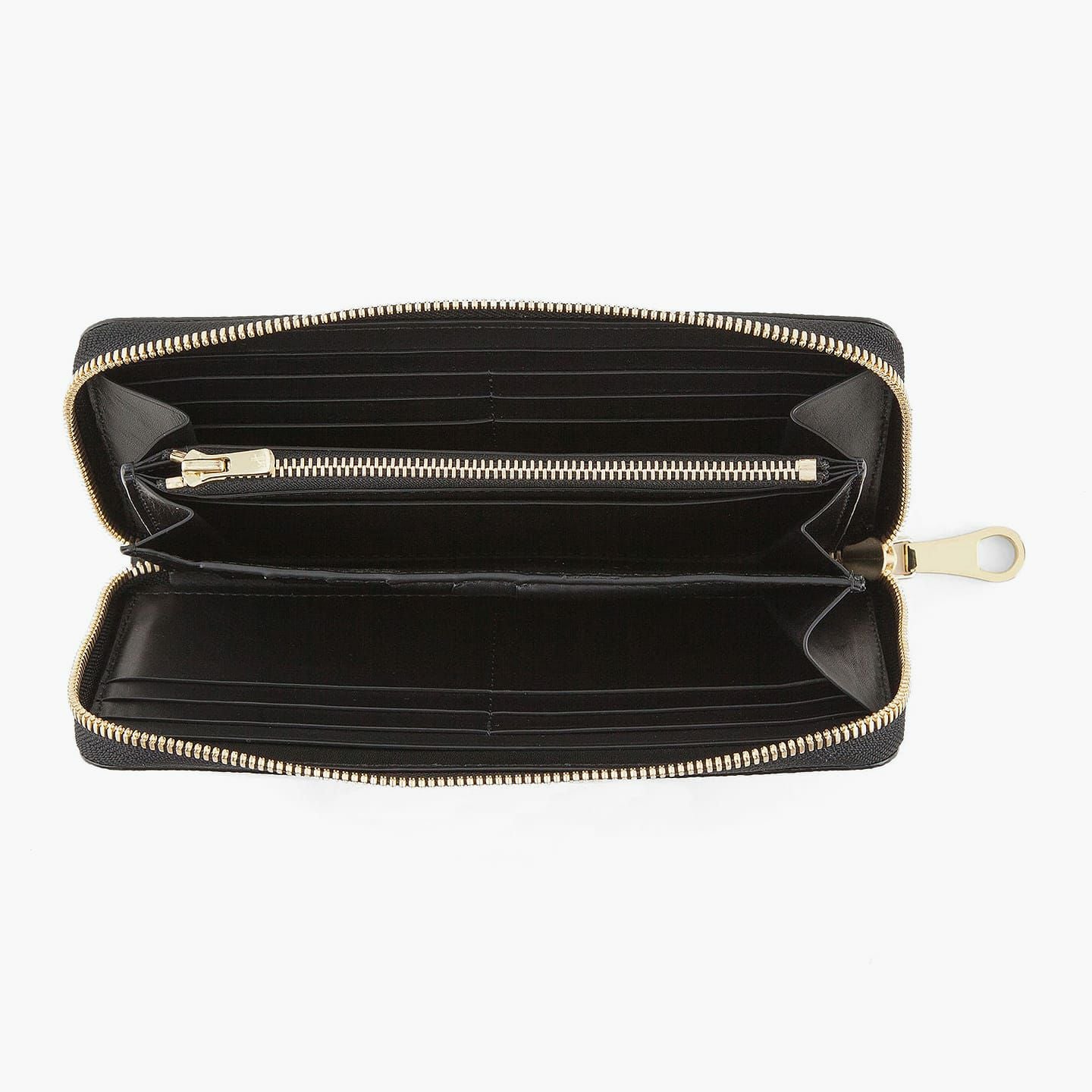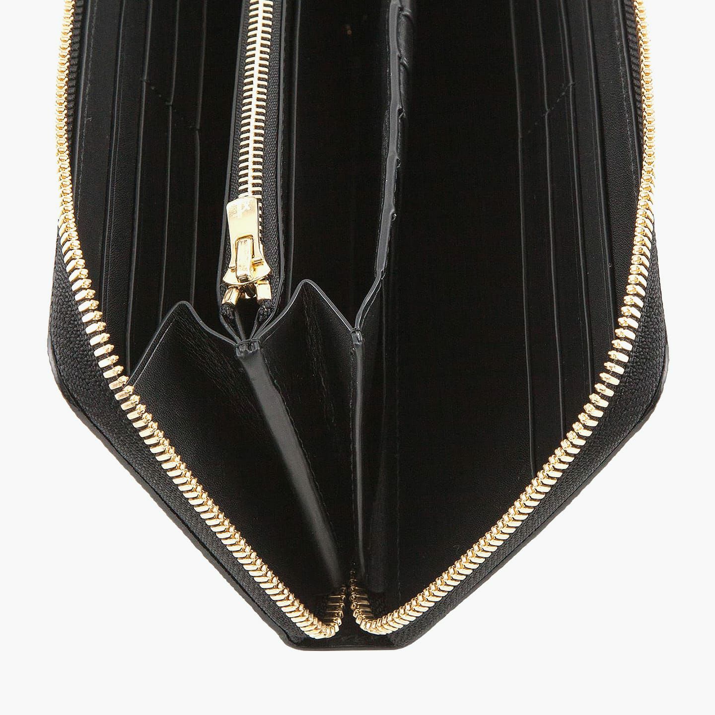 漆塗りシボ型押しレザーは、小さな黒ダイヤの粒が無数に散りばめられたような表情が魅力。また、経年変化による影響を最小限に抑えて、美しいツヤ肌を維持することが可能。本体の切れ目は角を滑らかに削ぎ落とし、漆と親和性の高い漆黒の顔料を塗装。そして、匠の職人が磨き上げたコバは、ボリューム感のある立体感とツヤを実現。