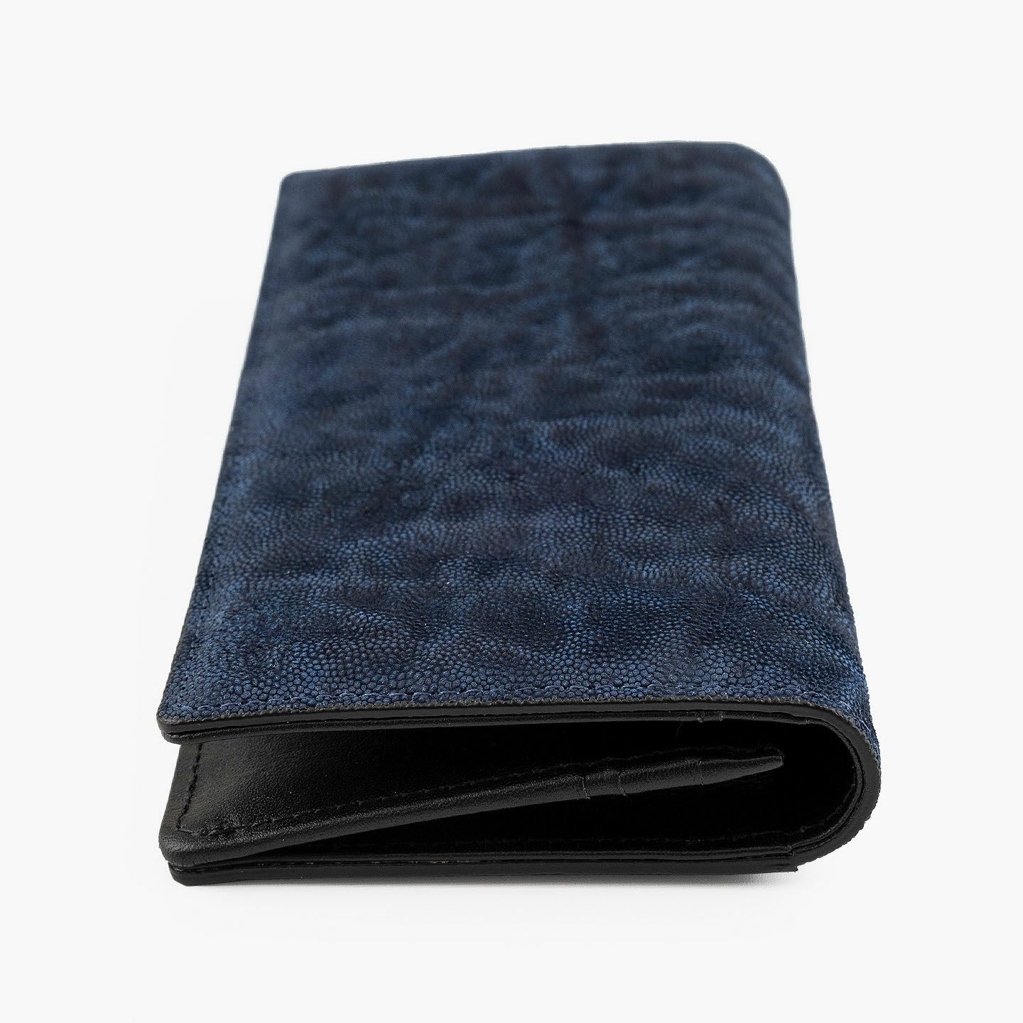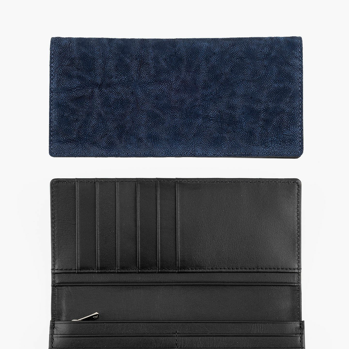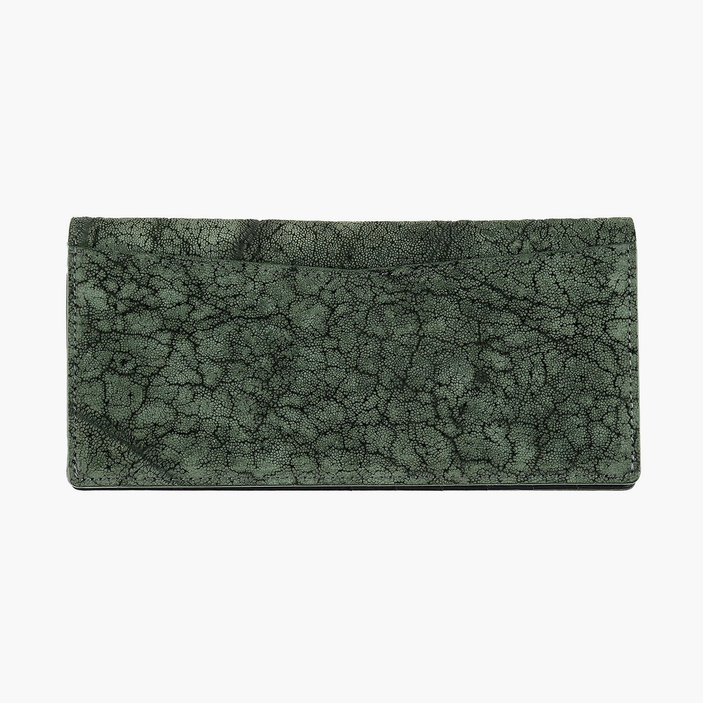 厳格な条件のもと国際取引が認められている、ジンバブエに生息するアフリカゾウの鼻・喉の部分のみを使用した、とても希少な「エレファントレザー」。エキゾチックレザーのひとつでもあるゾウ革は、非常に丈夫であるとともに、キズに対する耐性や撥水性に優れ、厚みがありながらも柔軟性にも富んでいます。また、表面には、細かい粒状の凹凸が広がっていて、部位により不規則なシワが入った表情が、惹きつけられる魅力にもなっています。さらに、ゾウ革においては、表皮を擦り取って起毛させた、ヌバック調に仕立てているのが一般的。細かい粒状隆起や大ぶりなシボ・トラ(スジ状のシワ)などが、複雑に絡み合って織り成すワイルドな風合いも特長的です。そして、それらの表情は、不規則なので同じように見えるものがなく、オンリーワンの個性を創出。使い込むほどにツヤ・色味が増していく、魅力的なエイジングも楽しめます。