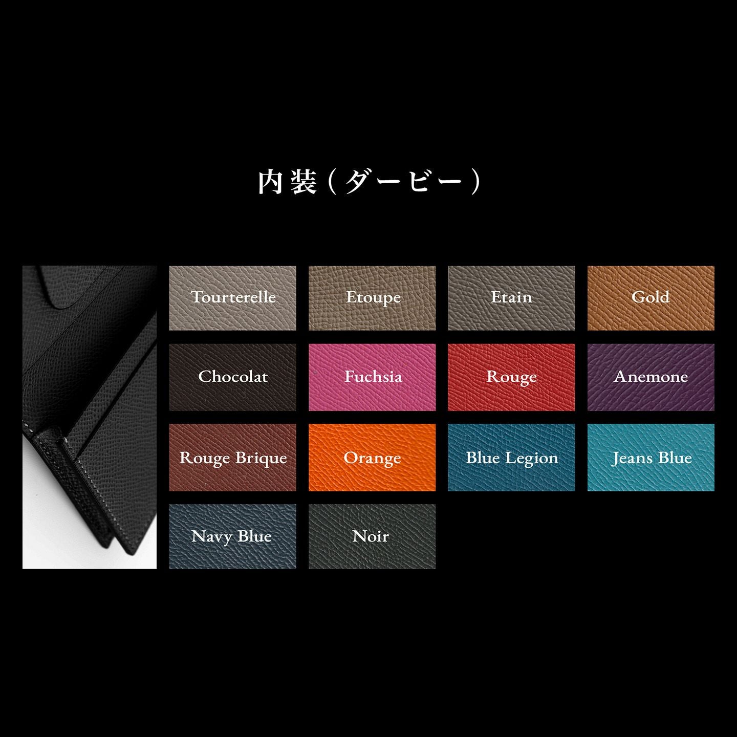 名刺を30〜40枚ほど収納できる通しマチメインポケット1つと、カードポケット2つ・アオリポケット1つを備えた名刺入れ。外装の「ナイルクロコダイル」は6色からセレクトでき、オプションでカブセ裏にある内装のアオリポケットを、外装と同じ素材・カラーに変更することも可能です。内装の「ダービー」は豊富な16色から選ぶことができ、総手縫いによる緻密なステッチの糸色、手間暇をかけている高品質なコバの色、ファスナーテープの色は、セレクトした革色に合うカラーをブランドがチョイス。さらに、ブランドロゴ刻印(箔押し)も、Silver・Goldのいずれかからセレクトでき、カラーオーダーやオプションなどとともに、自分オリジナルの1点もののような受注生産ができます。