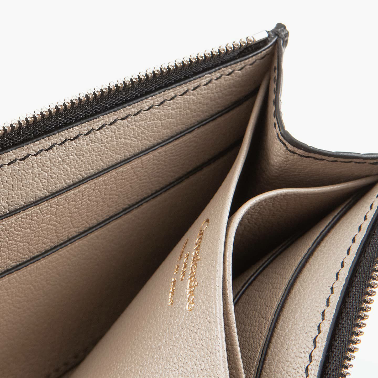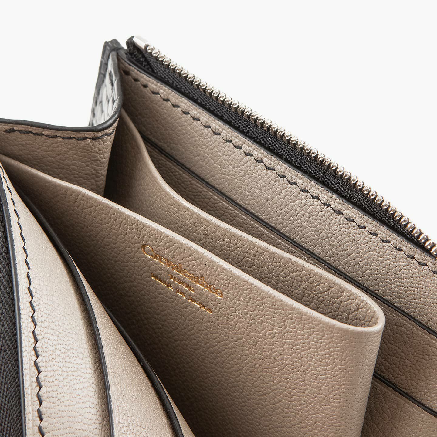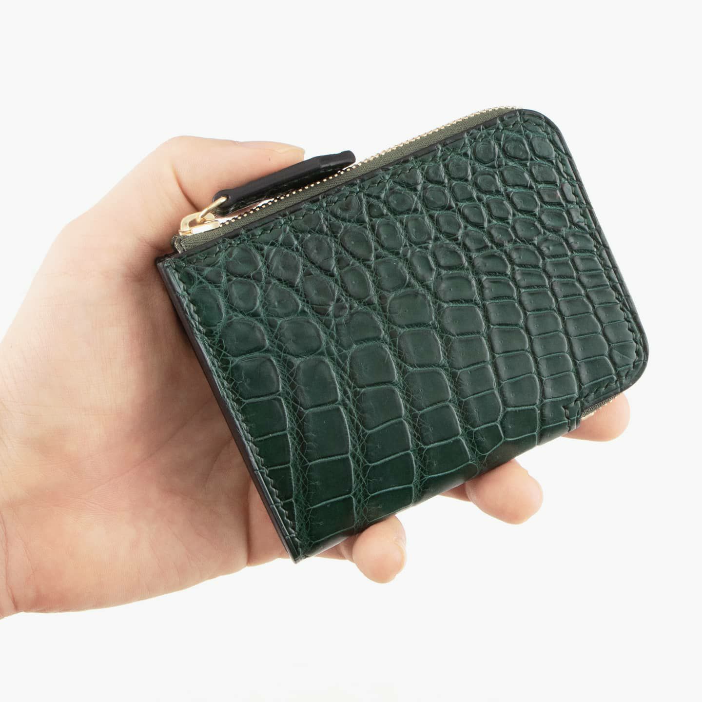 ポロサス/スモールクロコダイル(イリエワニ)・ラージクロコダイル(ニューギニアワニ)・シャムクロコダイル(シャムワニ)の他の3種類のクロコダイルに比べ、「ナイルクロコダイル(ナイルワニ)」は鱗が細かく、長方形の鱗板が腹部全体に整然と並んでいて、横腹の鱗は丸みのある長方形をしており、その幅は他の種類より狭いのが特長。鱗のバランスとしては、ポロサスとラージクロコダイルの中間くらいのイメージです。また、「ナイルクロコダイル」は、アフリカが原産で、一匹のナイルワニから採れる革の面積が小さいうえに、ヨーロッパの高級メゾンを中心に非常に需要が高く、とても希少価値が高い素材です。染色・質感・風合いの3つのこだわりを追求するために、鞣しや仕上げに至るまで日本国内のタンナーで行っています。