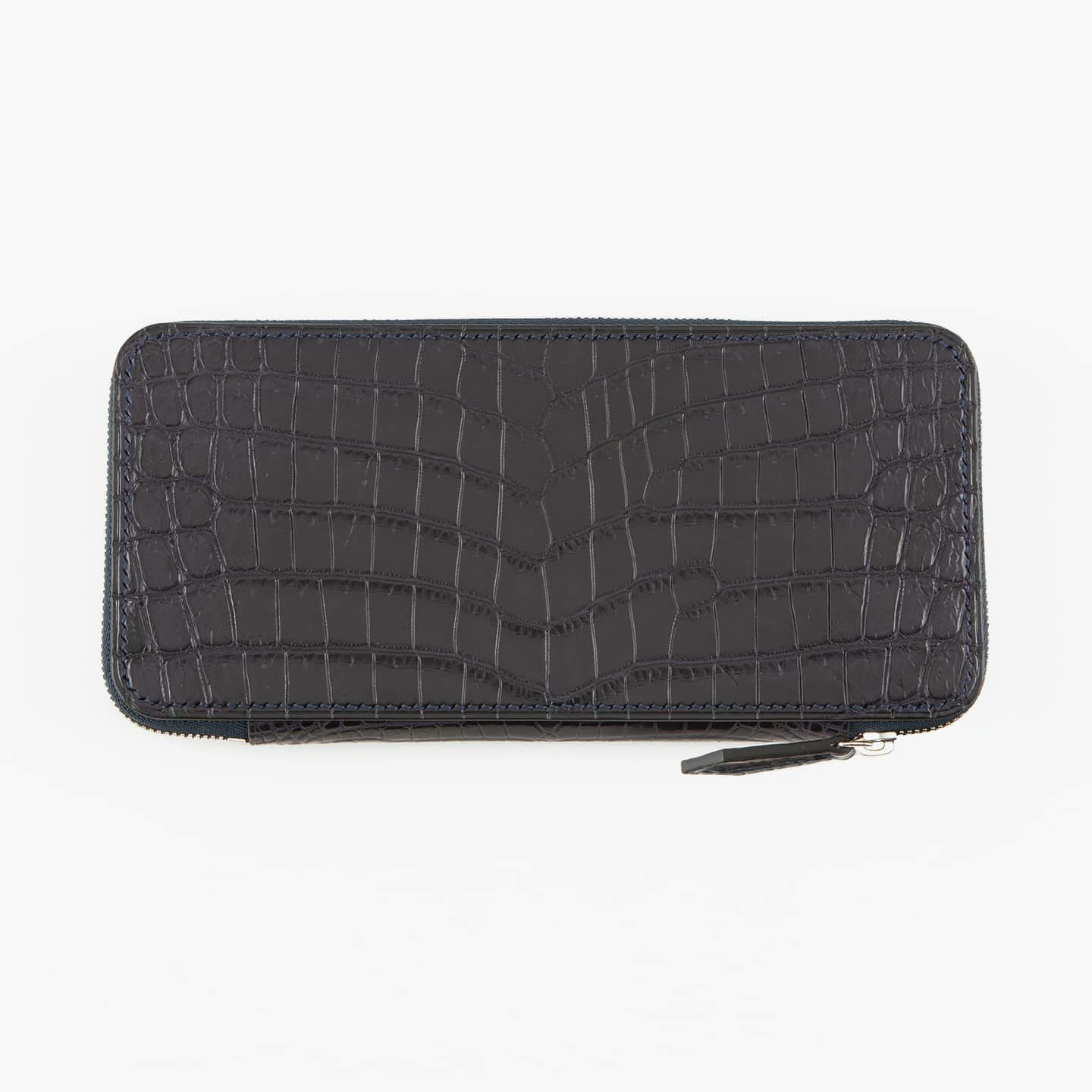 外装「ナイルクロコダイル」と内装「シェーブル」の上質なマテリアル2種による、内部構造とファスナーを挟み込むような特別なサンドイッチ構造を実現した、異素材により生み出されるエレガントな融合。マットに輝く魅惑的な「ナイルロコダイル」は、革職人・西森裕矢が自ら厳選したこだわりが込められており、色気のある大人のステイタスを創出。さらに、マットブラックのコバが、額縁効果をもたらすことで、引き締まった印象を高めています。