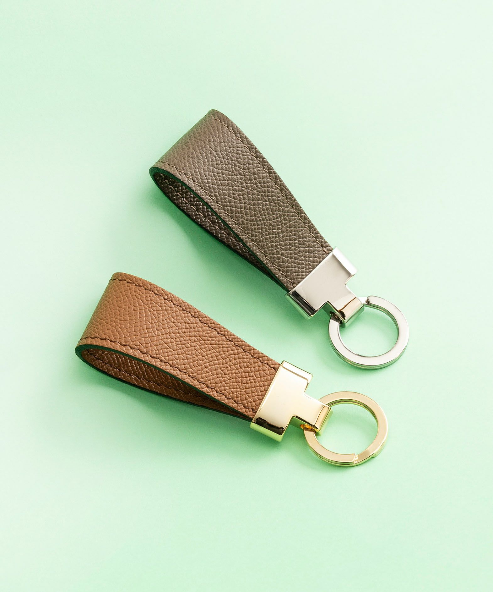 世界の名だたるハイブランドも使っている、ドイツ・ワインハイム社の高級カーフ「ワープロラックス」のエレガントなシボを添えた、SOキーリング。小キズが目立ちにくく、キレイな状態で長く使い続けられるアンチエイジングレザーで、独自のコシや美しい発色も魅力。ポケットやミニバッグにも入れやすいコンパクトなショートと、バッグチャームやベルトループ使いにも最適なロング(オプション)の2サイズをラインナップ。どちらも、家の鍵や車のスマートキーなどをまとめやすい、バランスの取れた設計が特長。オプションで名入れ刻印にも対応し、自分用としてもギフト用としても、名前やメッセージを入れてオンリーワンのアイテムへ。さりげなく洒落た日常使いが、洗練された大人のスタイルを満たしてくれる。