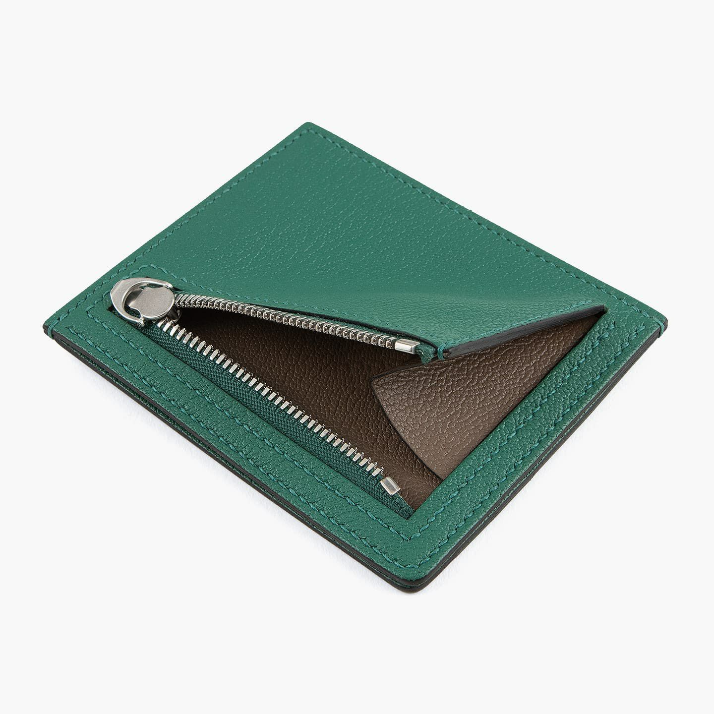 表面のカードポケットは、カードを3枚収納していてもスマートな佇まいを保つために、なるべく厚くならないようにデザイン。裏面の小銭入れは、全体的なスリムさを維持しつつ、小銭を出し入れしやすくするために、小さなマチでありながらも最大限に開くように設計。ファスナーテープは、外装のカラーと合わせて調和させながら、金具をYKKエクセラのシルバーを採用することで高級感を演出しています。
