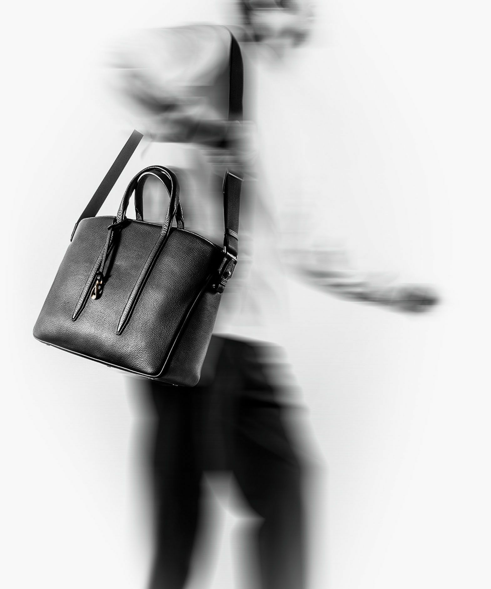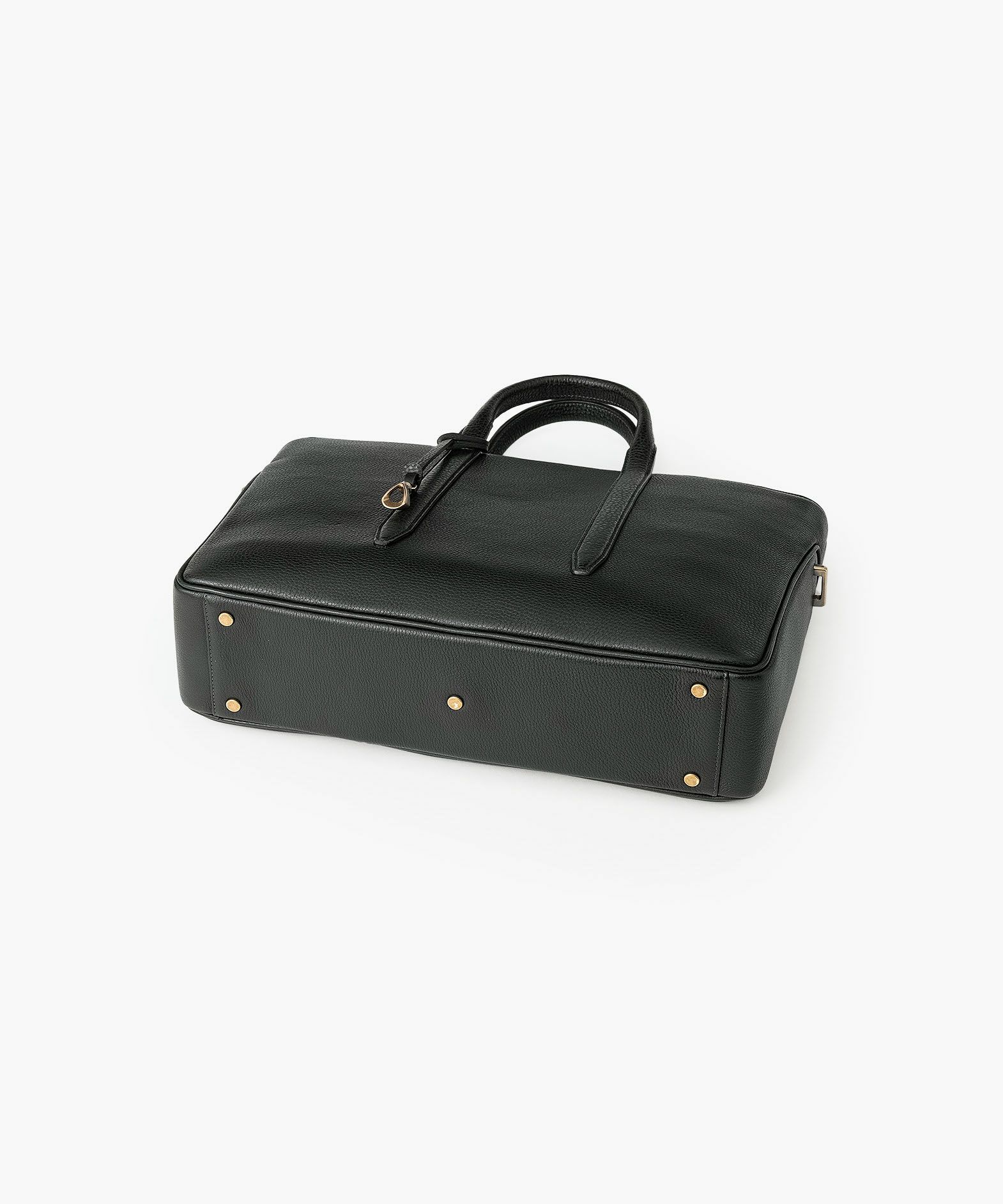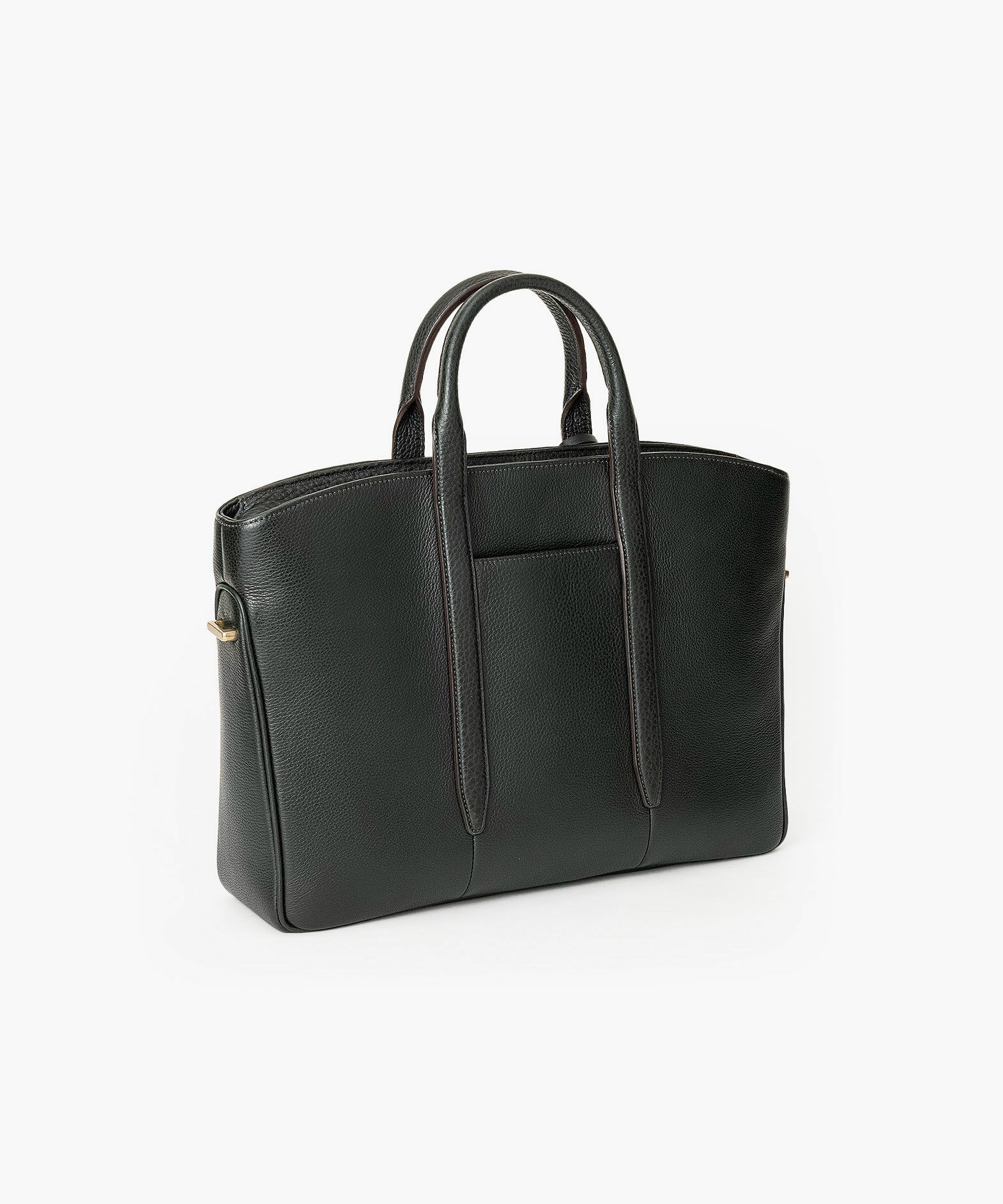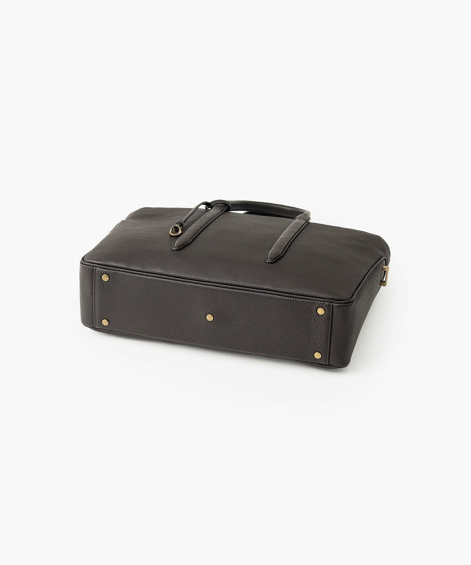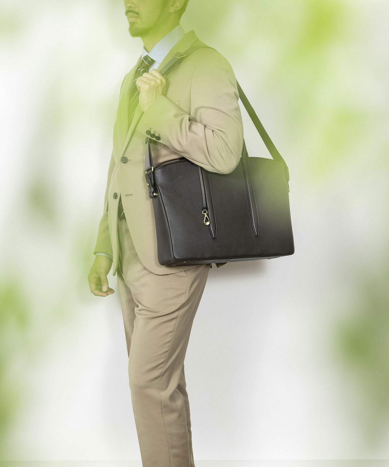 カジュアルなビジネススタイルにも似合う、凛とした佇まいと柔らかな曲線を併せ持つ、スタイリッシュなブリーフケース“Glide”。出し入れしやすい広めの上辺と、コンパクトに見える狭めの下辺が、滑らかに携えて行けるシルエットを実現。上面のファスナーを一段下げて、小さいカーブを描く両端のデザインにすることで、「シュリンクレザー」のボディとの隙間から中身が見えない細かな配慮も。間を狭くして緊張感のある2つのハンドルは、二つ折りのグリップ部分で握りやすく、手首にも掛けやすい長さを追求。スリムなマチの上部にある真鍮金具に、付属のショルダーベルトを装着すれば、スマートな2Wayも叶えてくれる。