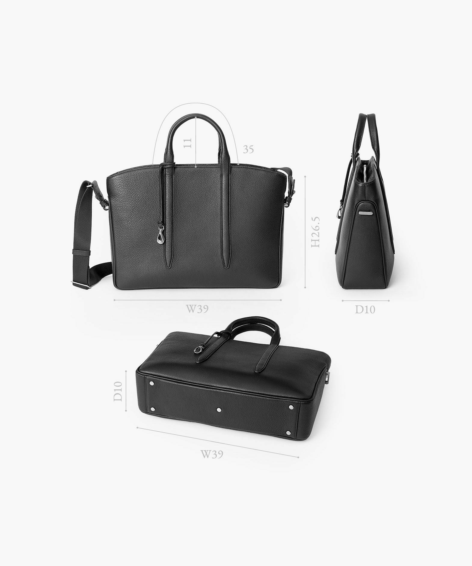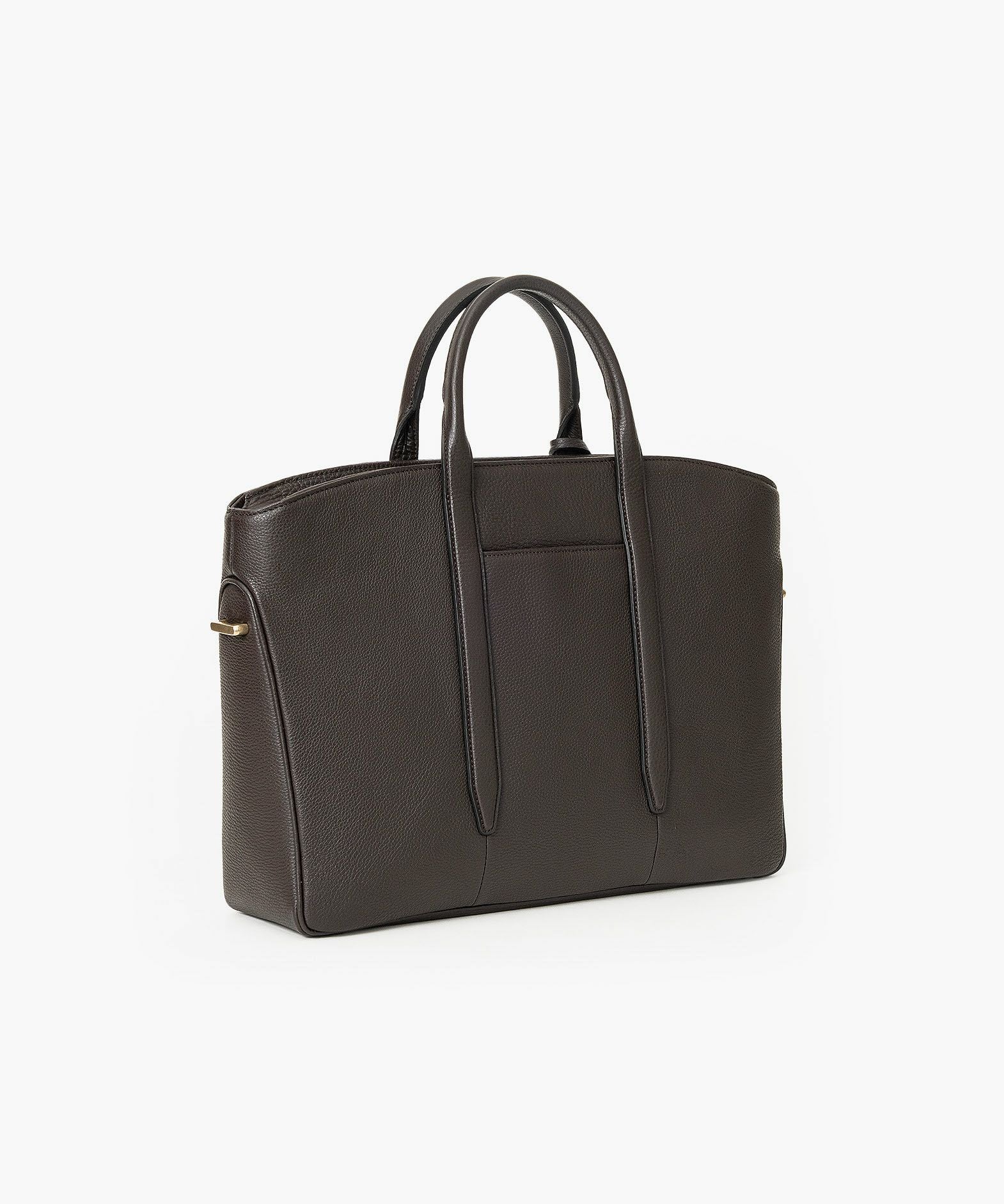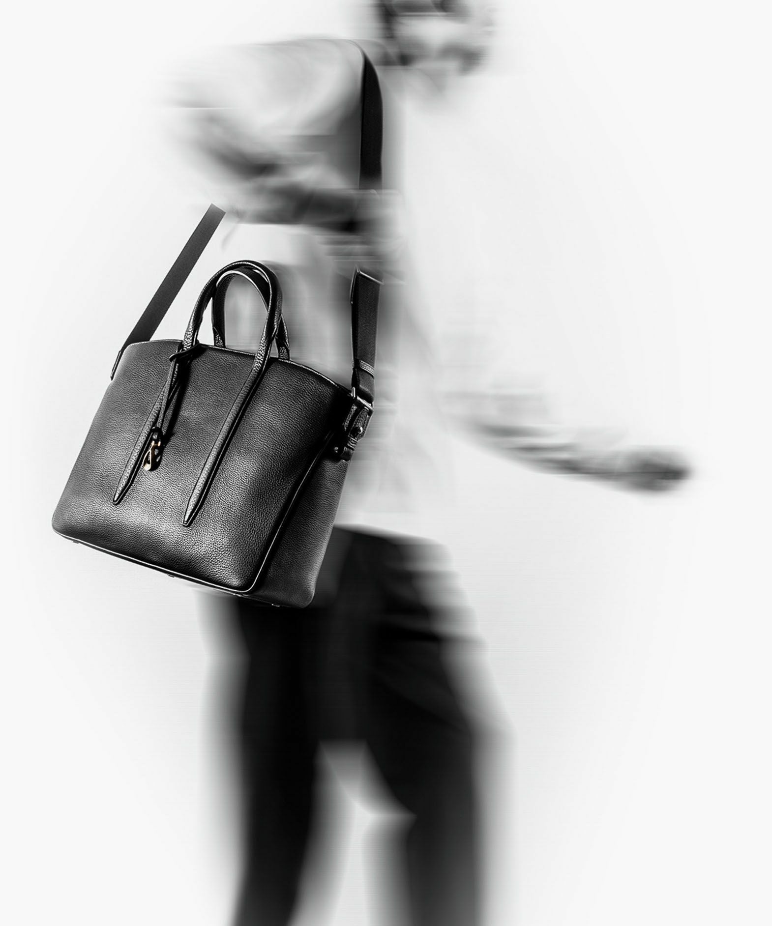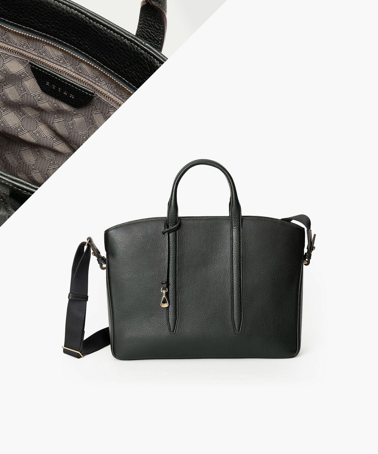 カジュアルなビジネススタイルにも似合う、凛とした佇まいと柔らかな曲線を併せ持つ、スタイリッシュなブリーフケース“Glide”。出し入れしやすい広めの上辺と、コンパクトに見える狭めの下辺が、滑らかに携えて行けるシルエットを実現。上面のファスナーを一段下げて、小さいカーブを描く両端のデザインにすることで、「シュリンクレザー」のボディとの隙間から中身が見えない細かな配慮も。間を狭くして緊張感のある2つのハンドルは、二つ折りのグリップ部分で握りやすく、手首にも掛けやすい長さを追求。スリムなマチの上部にある真鍮金具に、付属のショルダーベルトを装着すれば、スマートな2Wayも叶えてくれる。