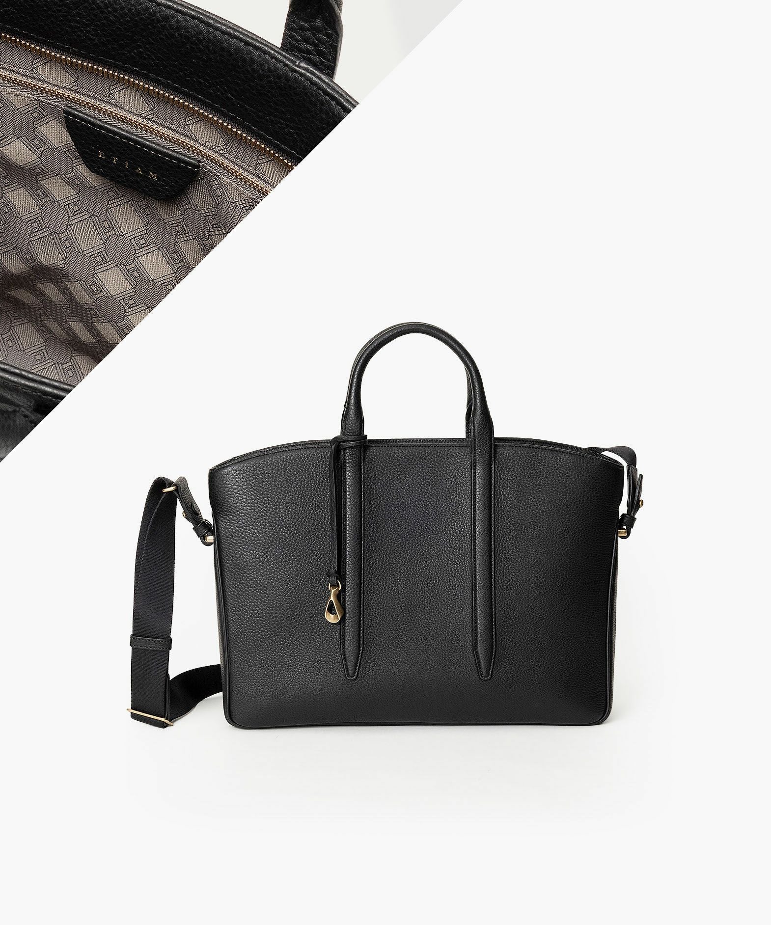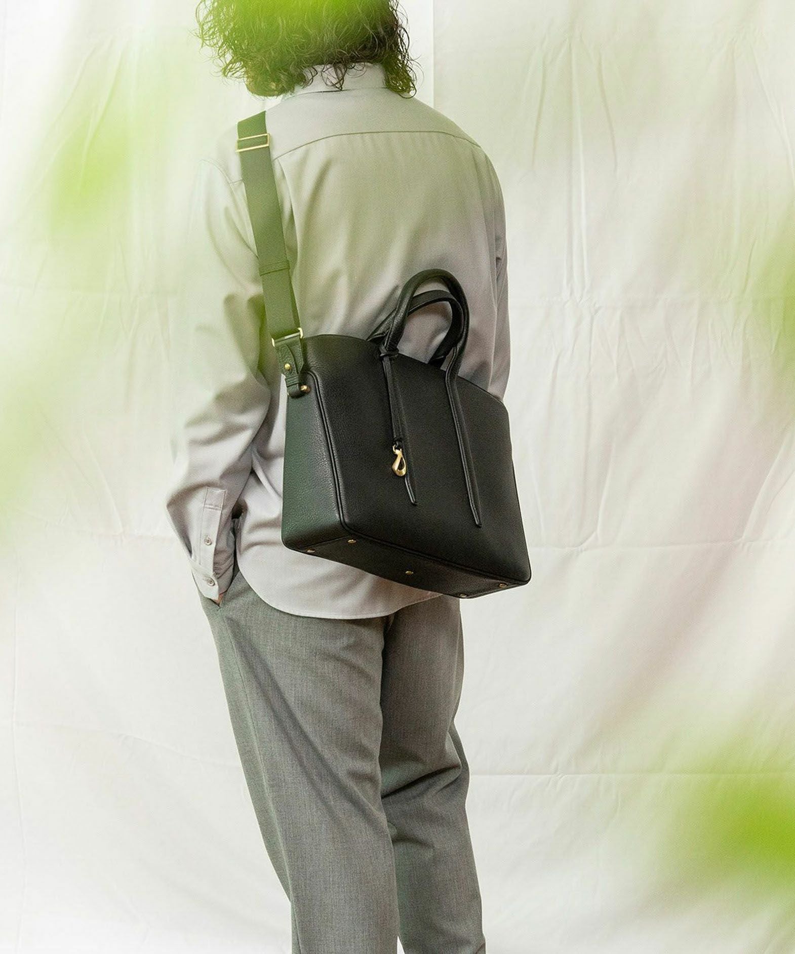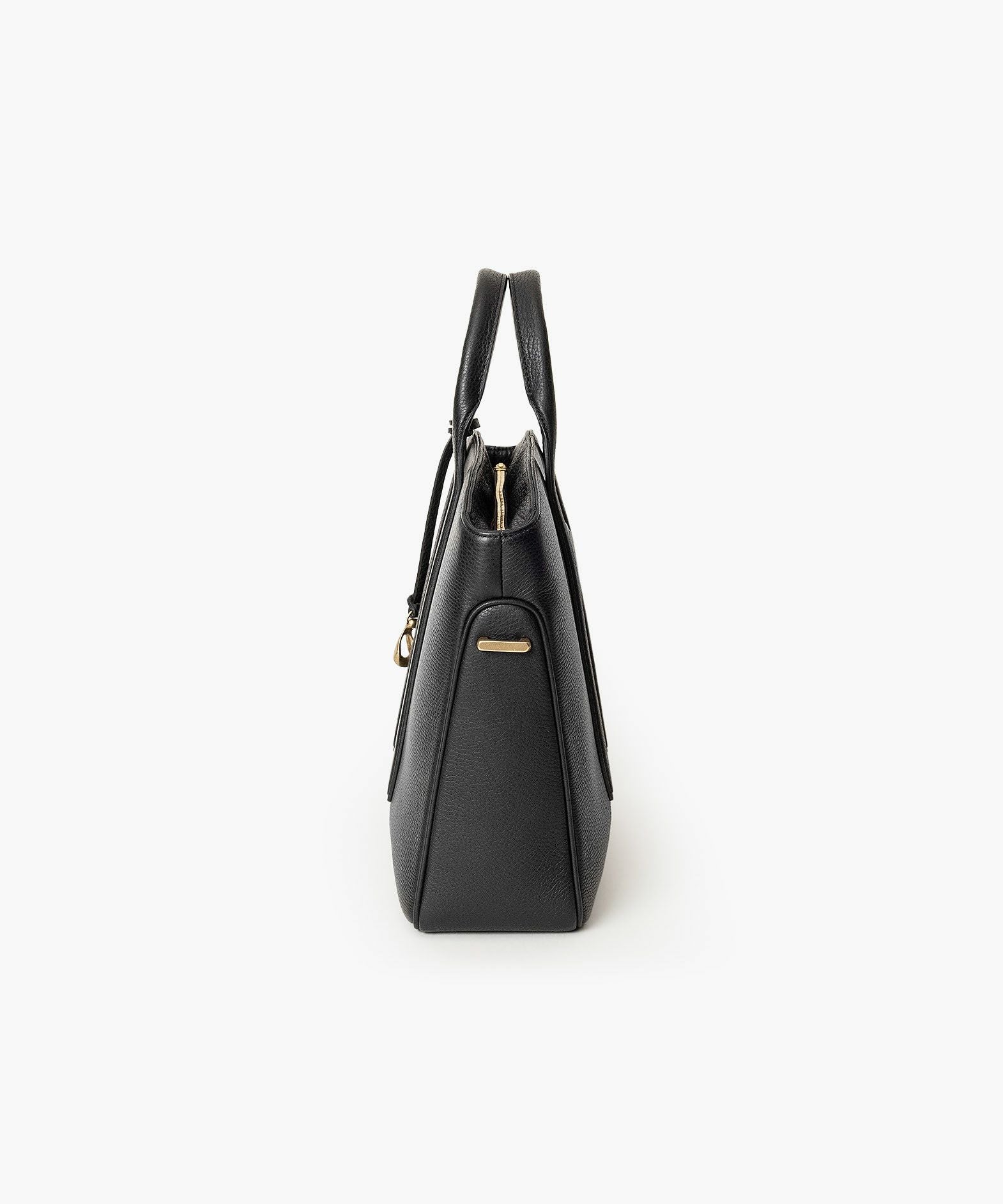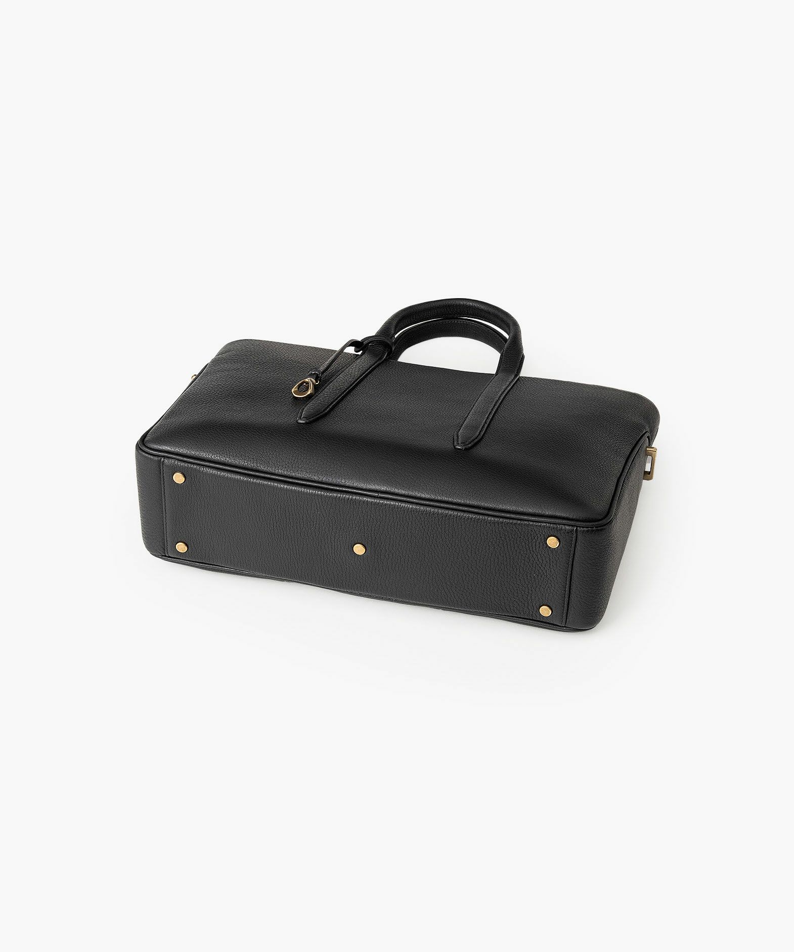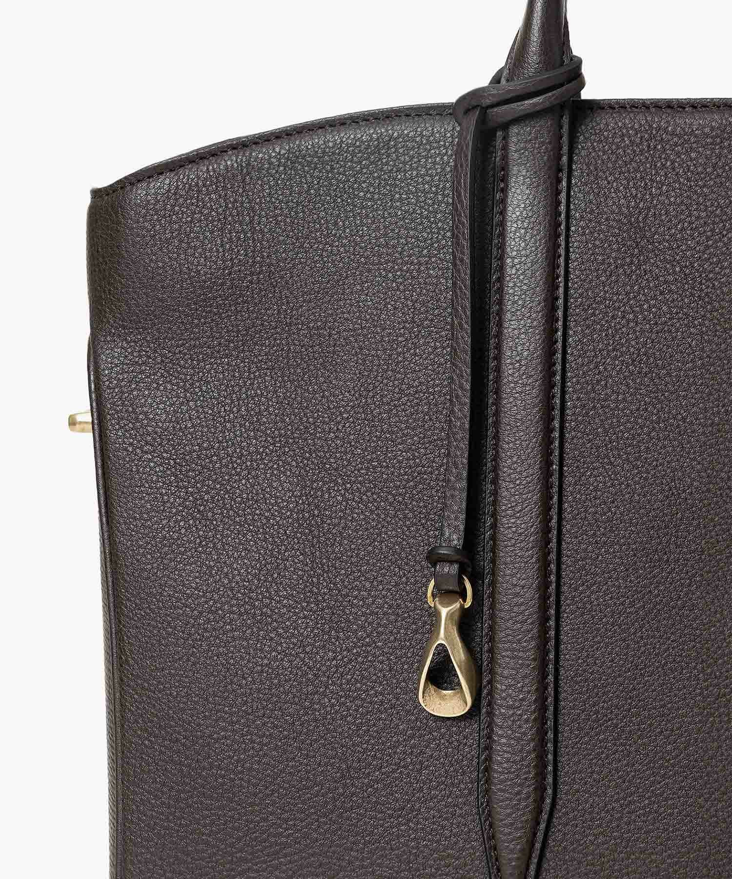 カジュアルなビジネススタイルにも似合う、凛とした佇まいと柔らかな曲線を併せ持つ、スタイリッシュなブリーフケース“Glide”。出し入れしやすい広めの上辺と、コンパクトに見える狭めの下辺が、滑らかに携えて行けるシルエットを実現。上面のファスナーを一段下げて、小さいカーブを描く両端のデザインにすることで、「シュリンクレザー」のボディとの隙間から中身が見えない細かな配慮も。間を狭くして緊張感のある2つのハンドルは、二つ折りのグリップ部分で握りやすく、手首にも掛けやすい長さを追求。スリムなマチの上部にある真鍮金具に、付属のショルダーベルトを装着すれば、スマートな2Wayも叶えてくれる。