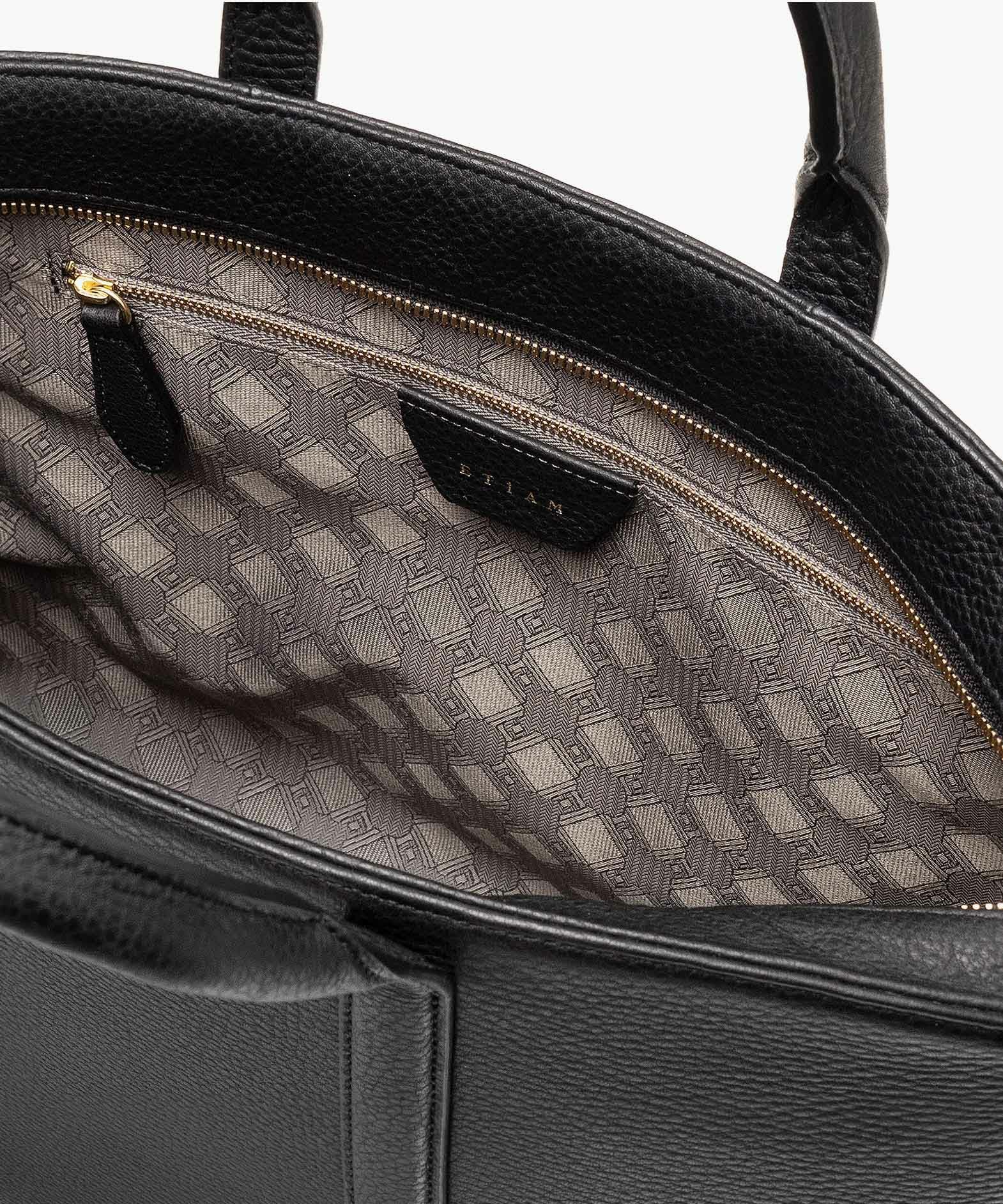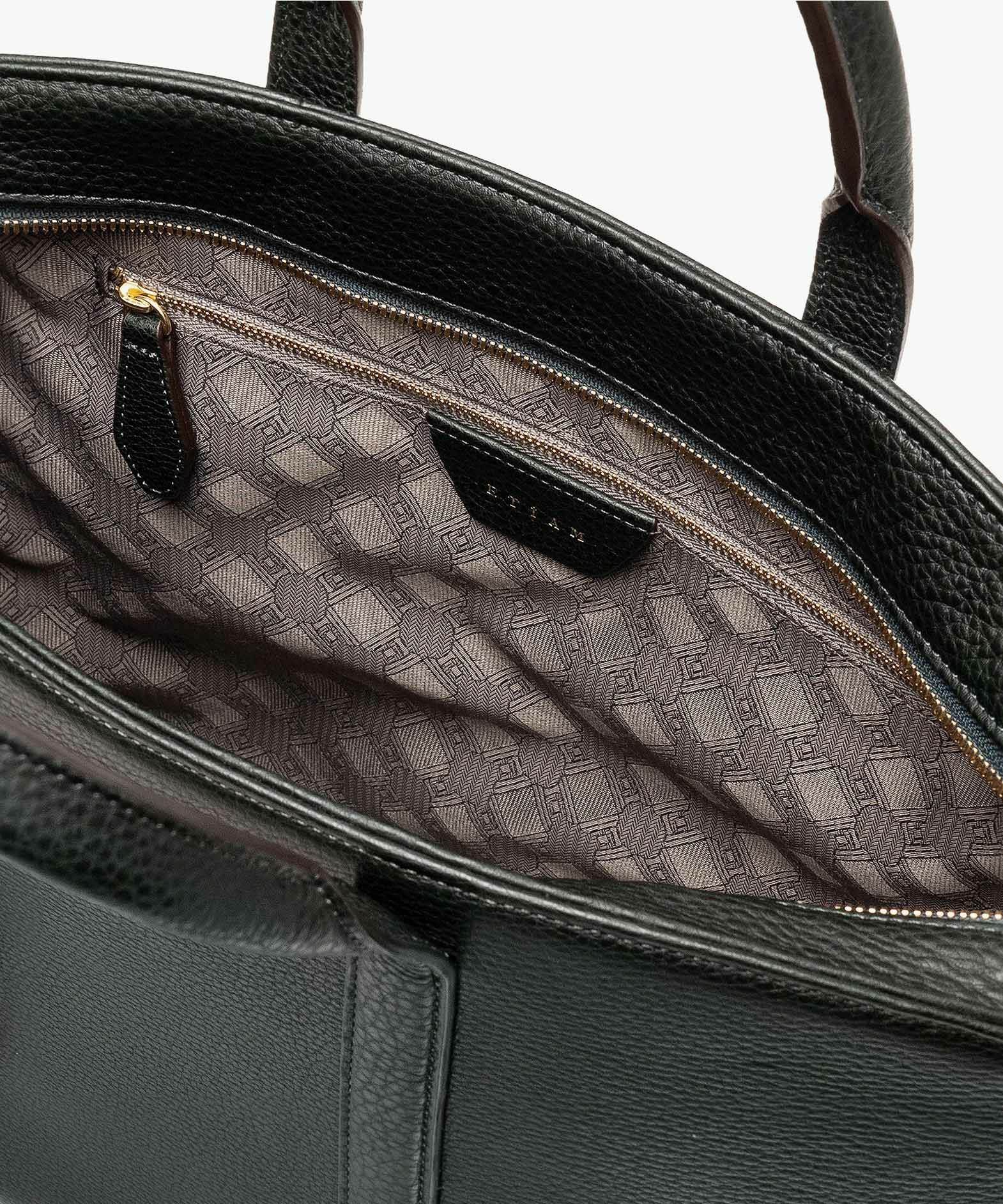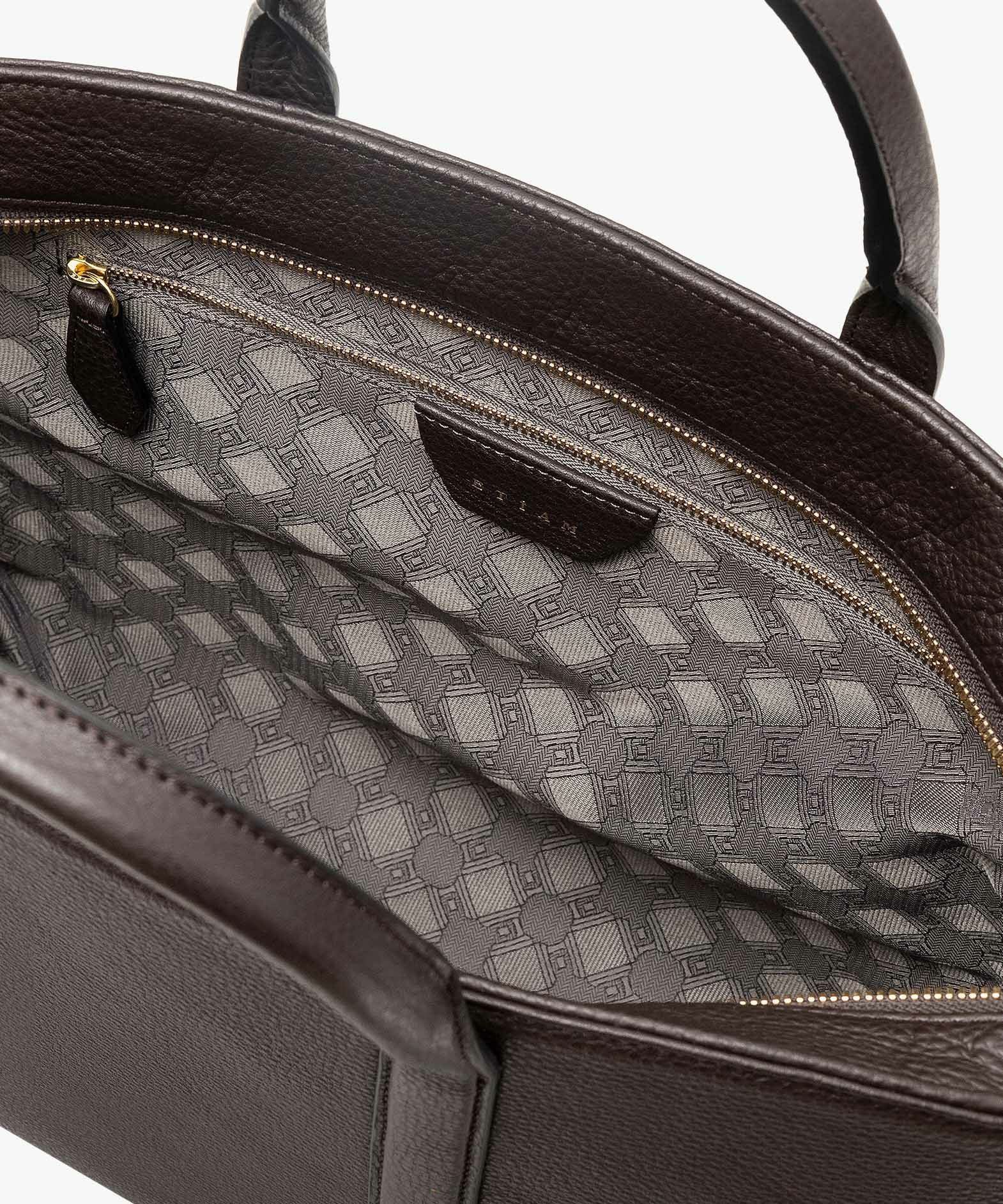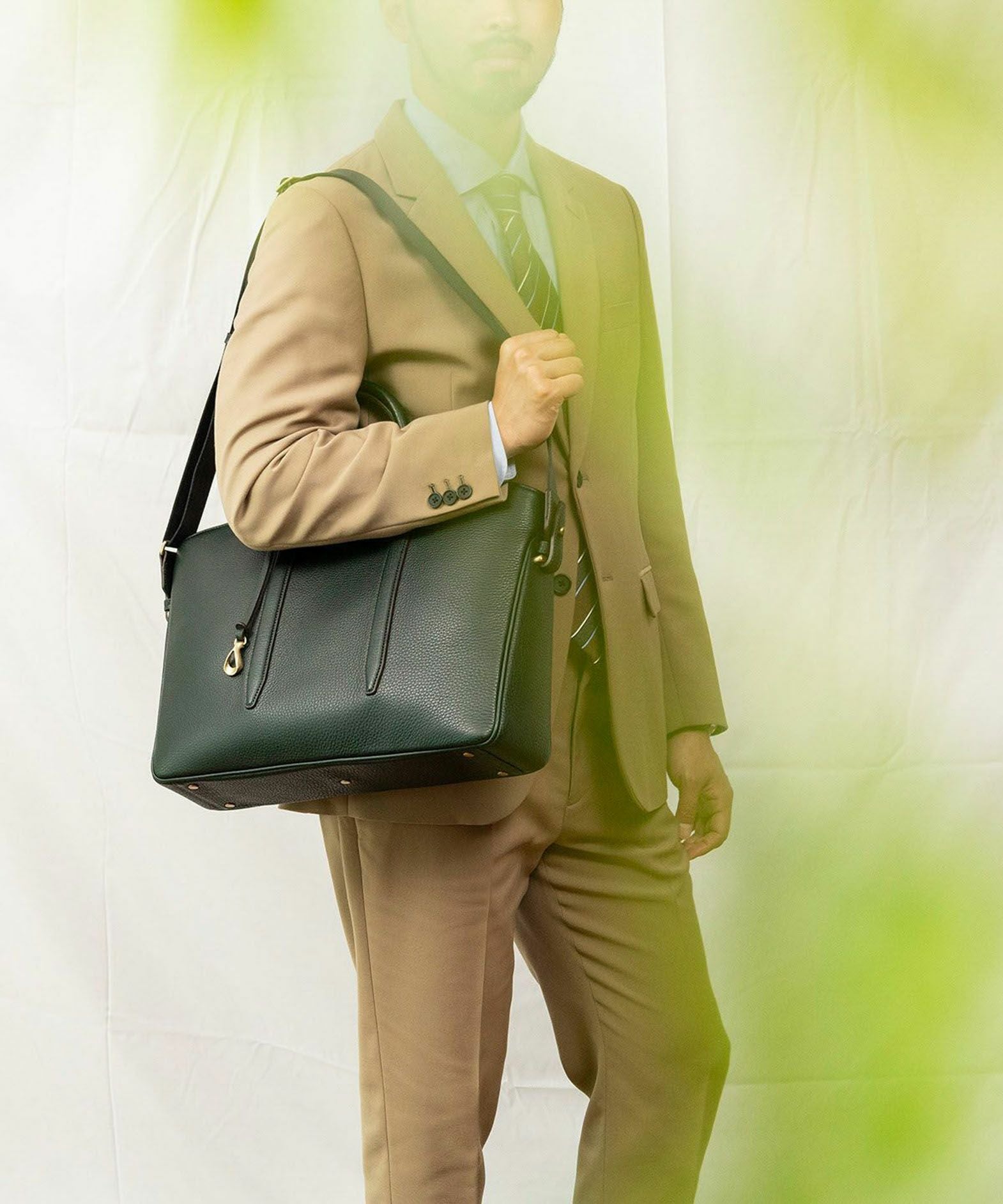 カジュアルなビジネススタイルにも似合う、凛とした佇まいと柔らかな曲線を併せ持つ、スタイリッシュなブリーフケース“Glide”。出し入れしやすい広めの上辺と、コンパクトに見える狭めの下辺が、滑らかに携えて行けるシルエットを実現。上面のファスナーを一段下げて、小さいカーブを描く両端のデザインにすることで、「シュリンクレザー」のボディとの隙間から中身が見えない細かな配慮も。間を狭くして緊張感のある2つのハンドルは、二つ折りのグリップ部分で握りやすく、手首にも掛けやすい長さを追求。スリムなマチの上部にある真鍮金具に、付属のショルダーベルトを装着すれば、スマートな2Wayも叶えてくれる。