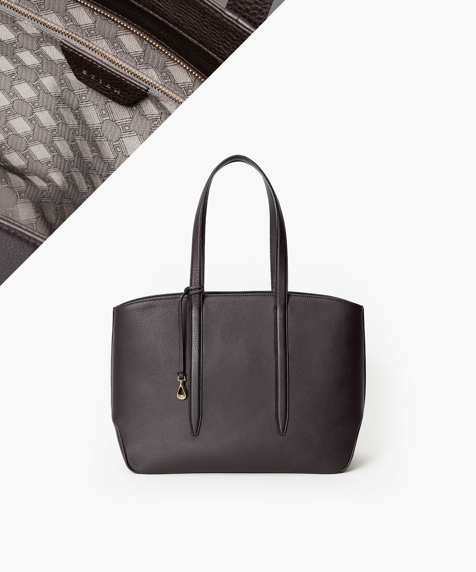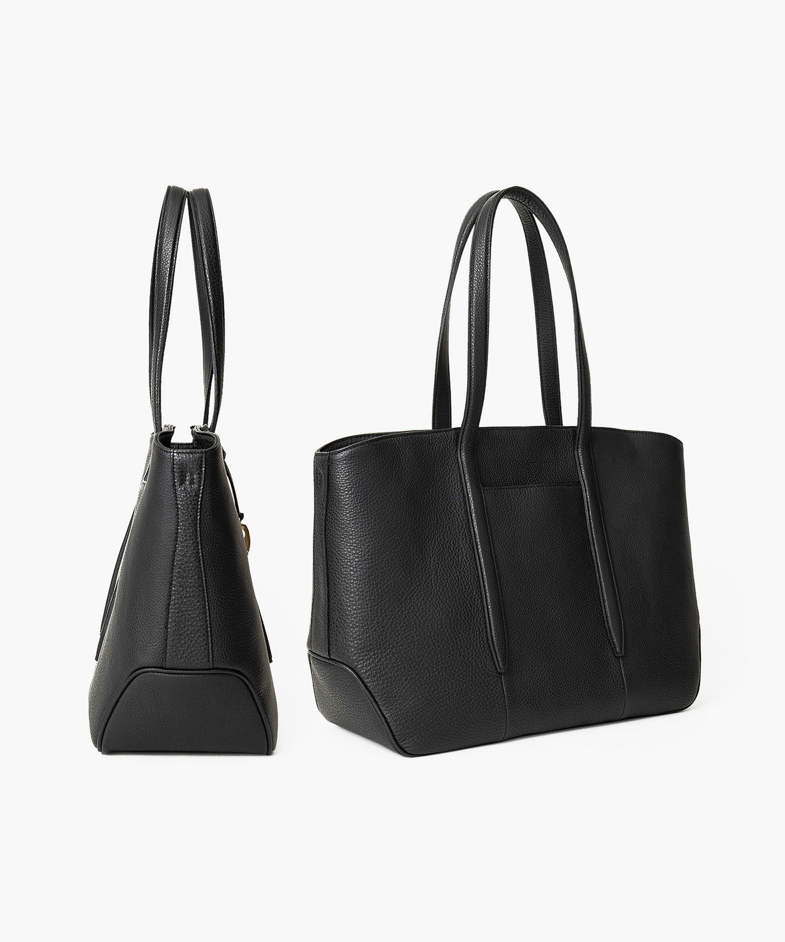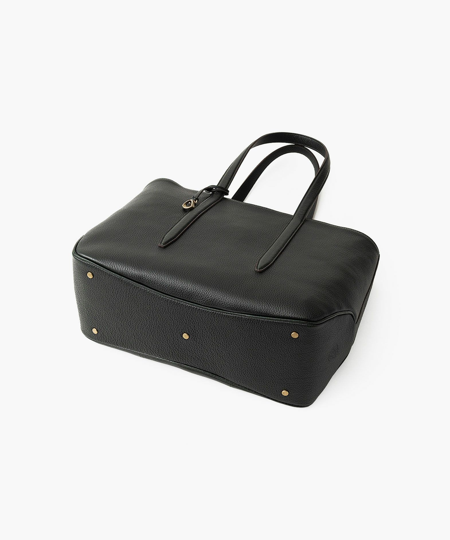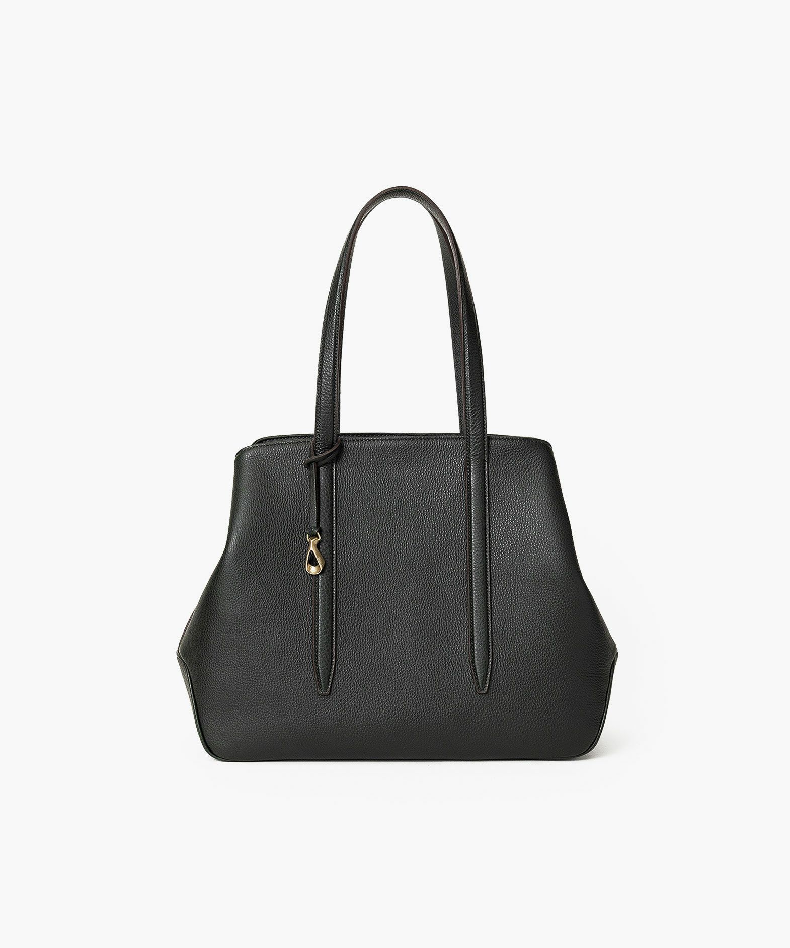 ファスナー開閉式で、B4サイズ・15インチのノートパソコンが収納可能。マチを内側に折り畳んでコンパクトにすることができ、用途に合わせて2通りのシルエット・サイズを楽しめます。また、バッグの上部を、左右のマチに向かって下がっていくラインにすることで、マチを内側に折り畳んでも天ファスナーがぶつからない機能性と、個性的でエレガントな見た目の美しさを両立。さらに、くびれをセンターに施した底マチは、肩掛けするときに体にフィットしてスムーズに持ち歩ける実用性と、独特のライン&フォルムがアクセントになるデザイン性を兼ね備えています。