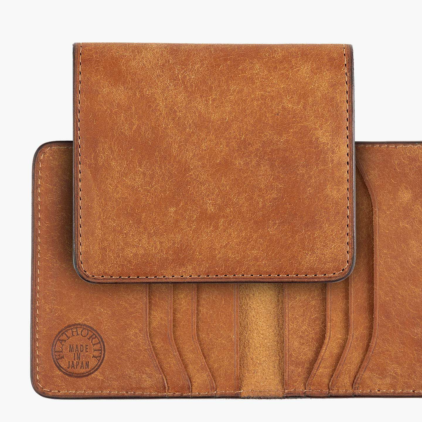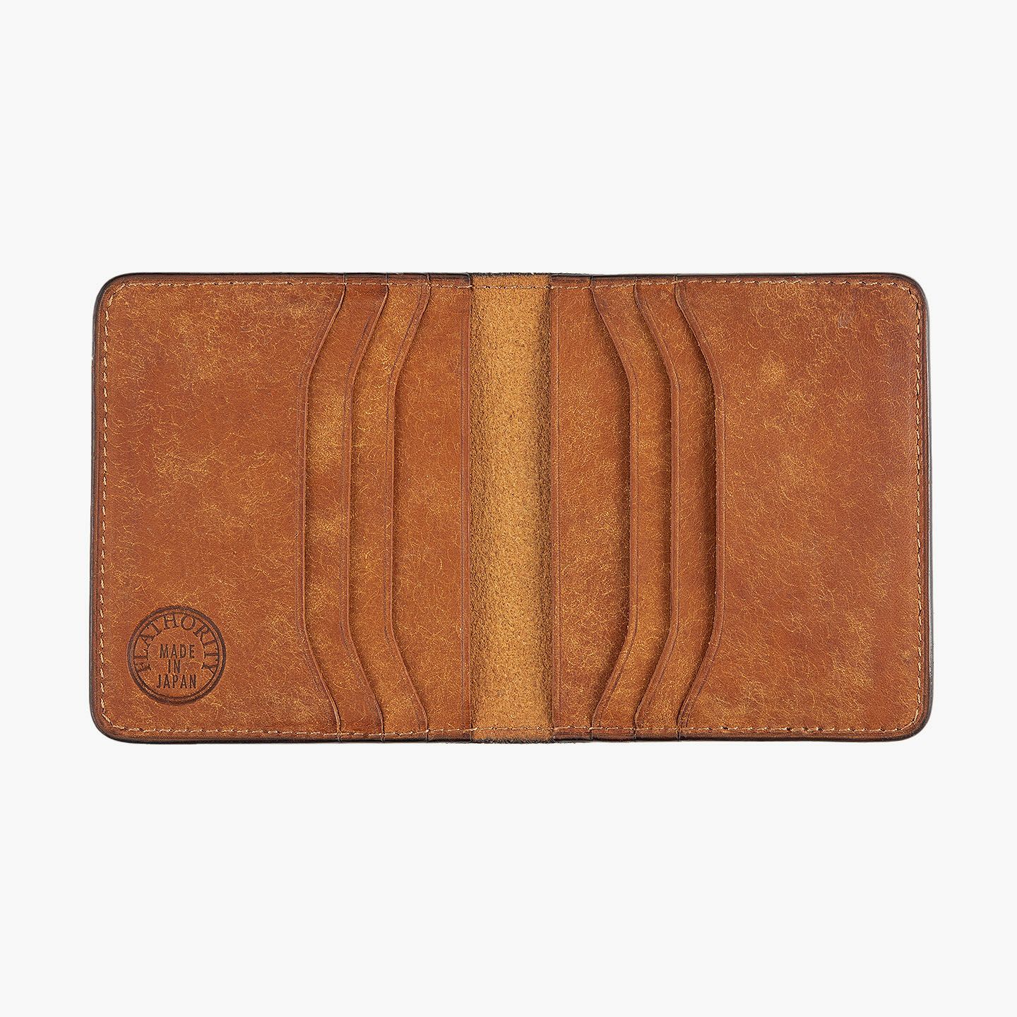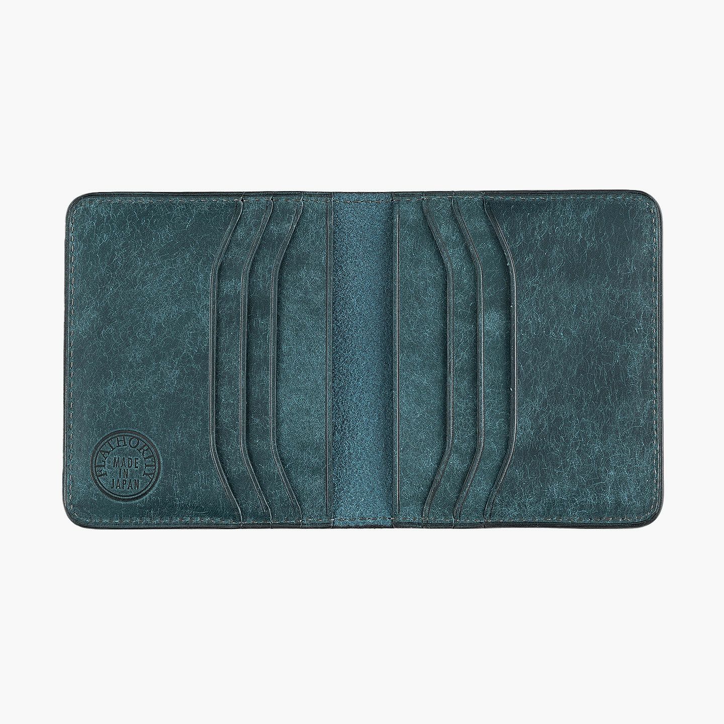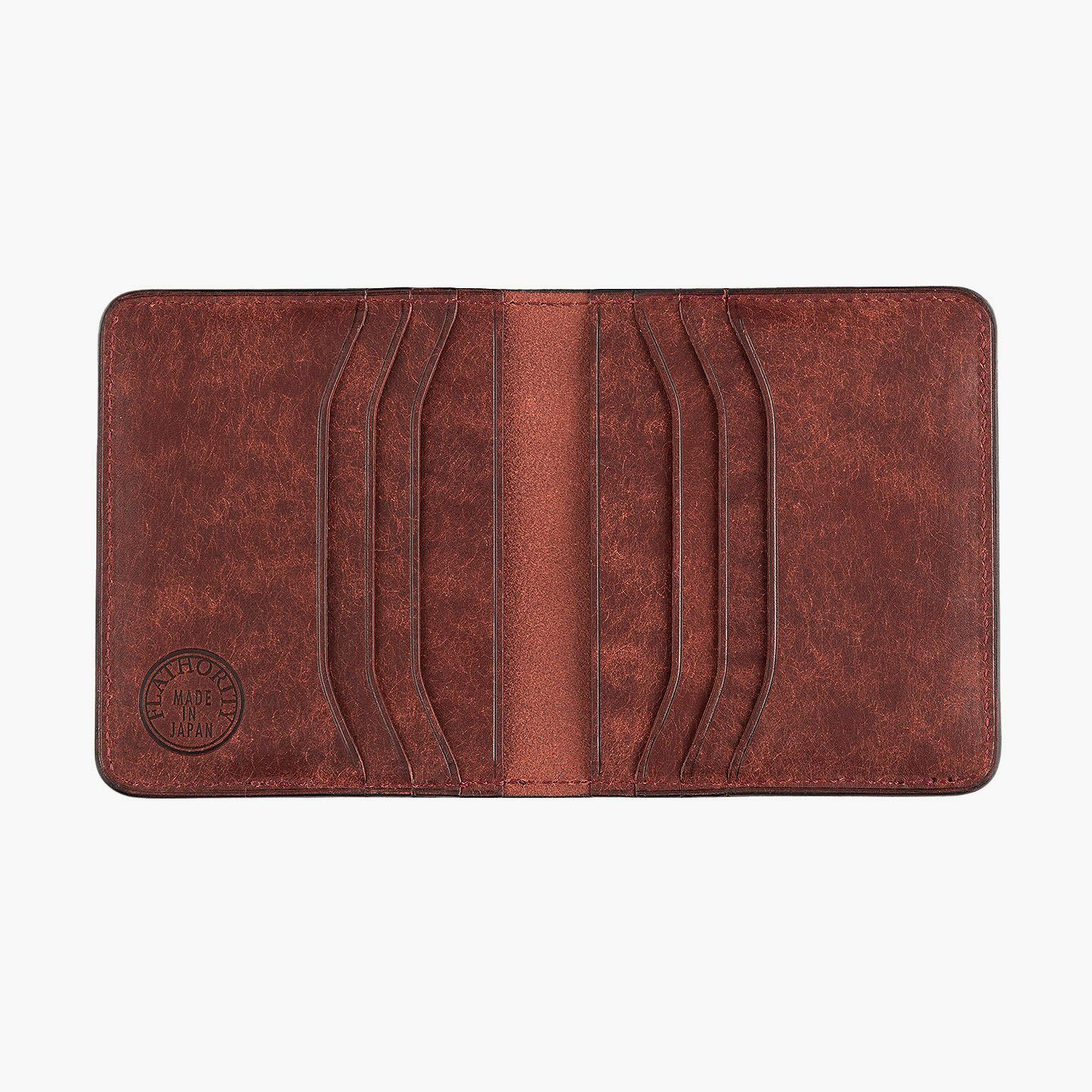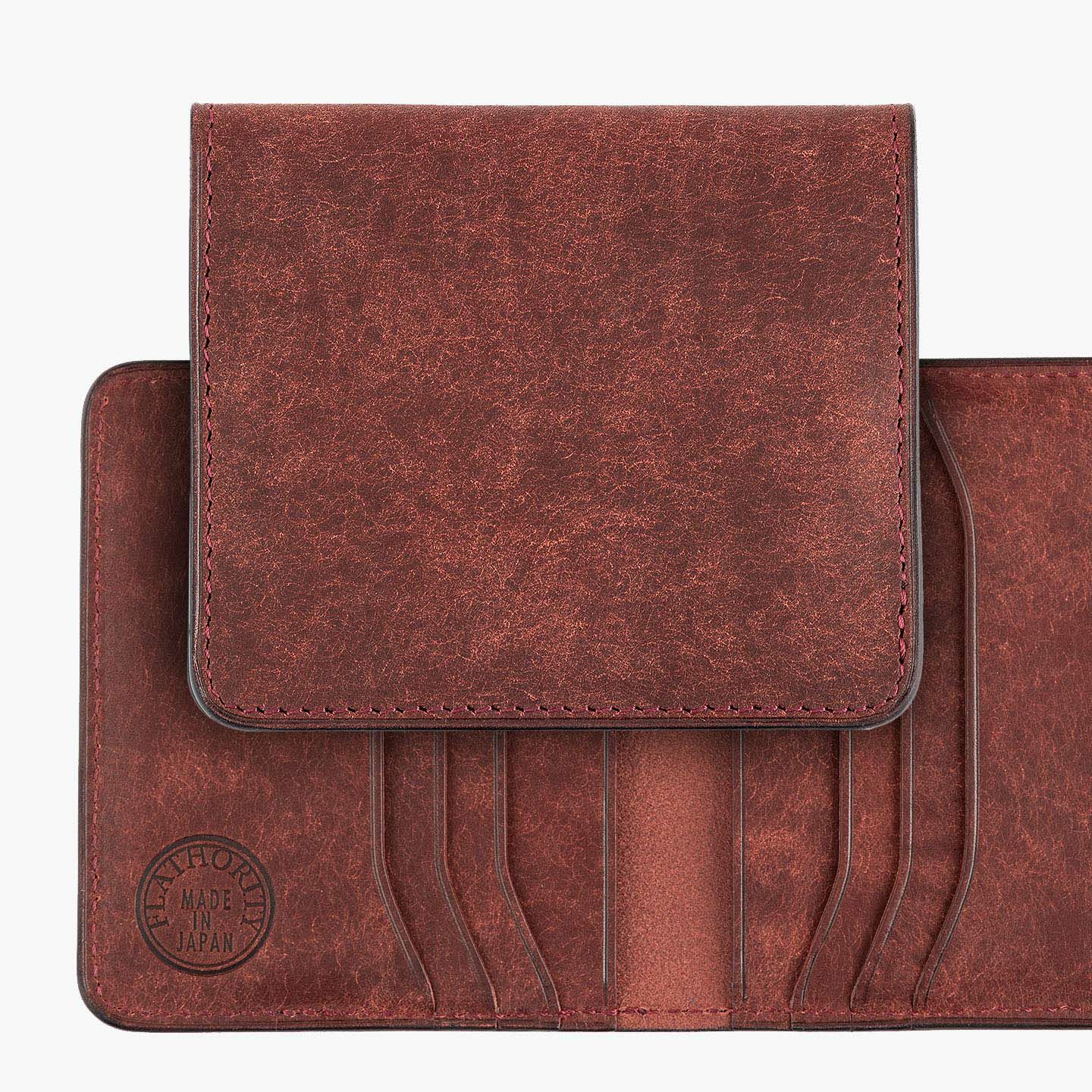ハイクオリティで量産できる鞄メーカー岩瀬が、どこにも真似のできないレザー製品を生み出したい想いを込めている、ファクトリーブランド『Flathority』のカードケース。和紙のように表面を起毛させた外装・内装の「プエブロレザー」が、ザラザラした独特の風合いから、ツルツルした美しいツヤ肌へと経年変化していく楽しさと、ふっくらとしたフォルムやジェンダーレスなデザインも魅力。スリムな手のひらサイズを追求しながら、左右シンメトリーで向かい合わせたカードポケット6つは、その数よりも出し入れのスムーズさにこだわり、折り畳んだ紙幣も収納できるマルチポケット2つとともに、扱いやすい気軽さをもたらしてくれる。