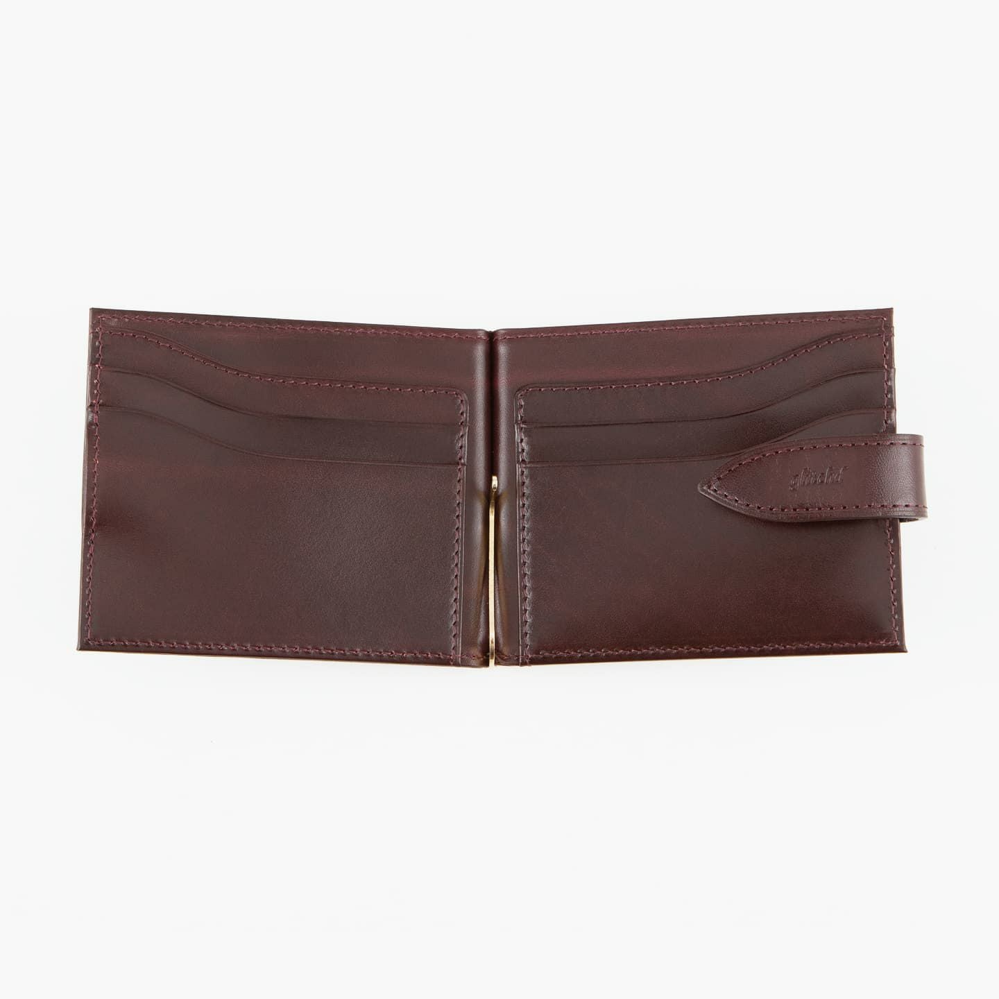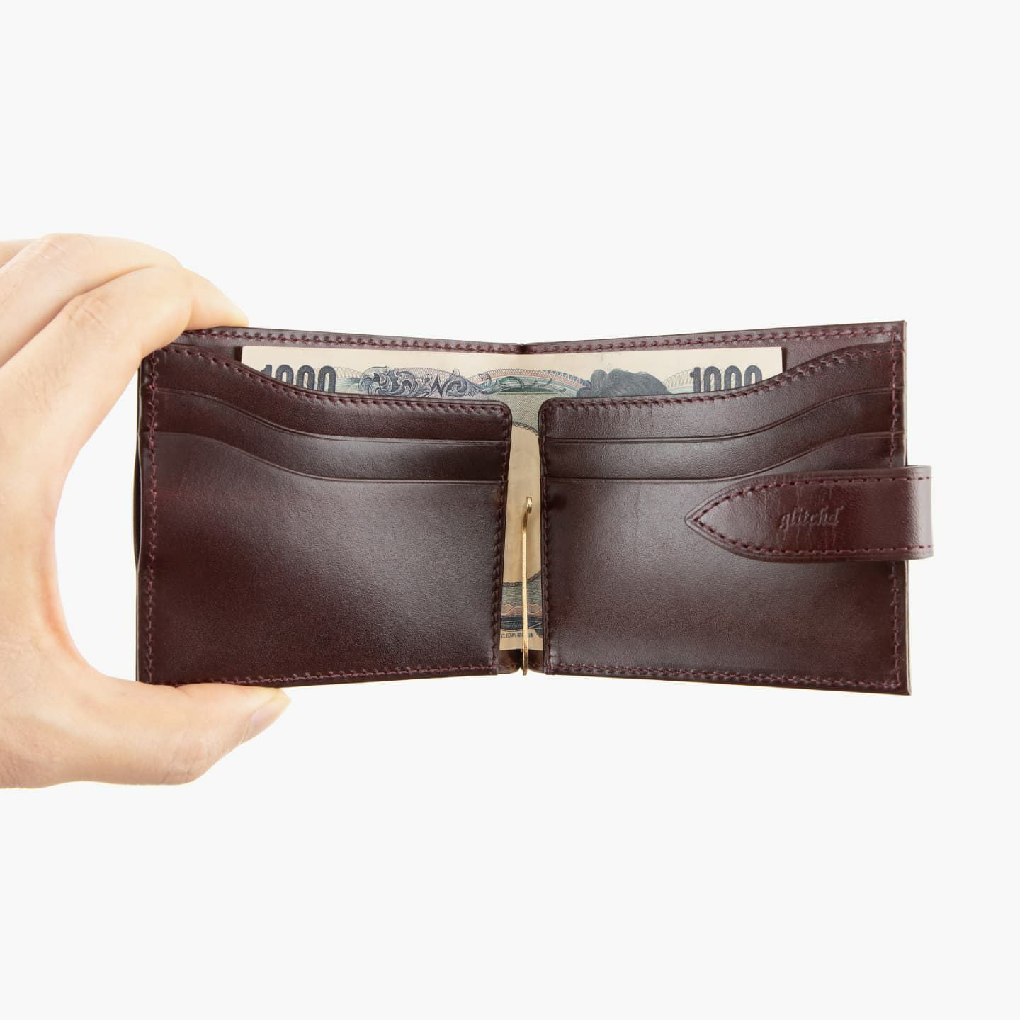 素材選定・設計・生産において、通例とされてきたものを再度検証し、独自の視点でプロダクトを追求している『glitchd』のマネークリップ。“トラ”と呼ばれる革本来のシワが、味わい深い魅力的な模様として輝く、ベルギー産の最高級レザー「ルガトー」による、同じ表情が存在しない特別感。光の角度により見た目が変化していく、飽きさせることのない美しさと、その光沢に目を奪われないように存在感を放つゴールドのクリップが、コンパクトな使いやすさとともに、ツールとしての魅力を奏でてくれる。