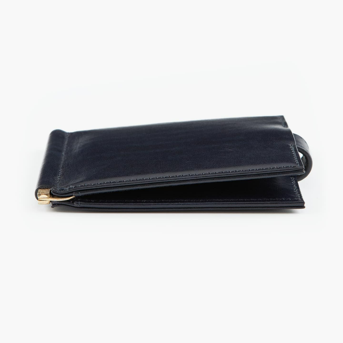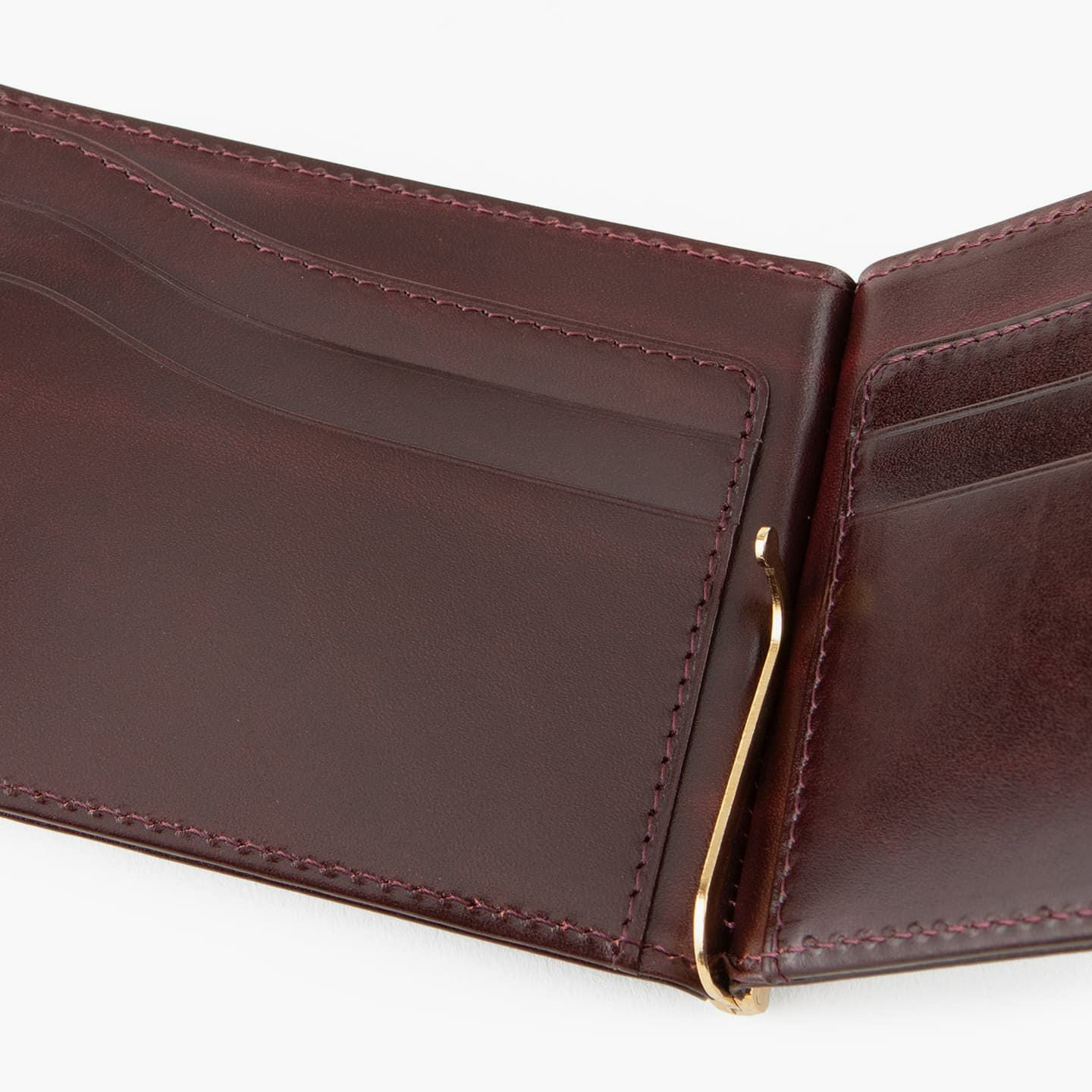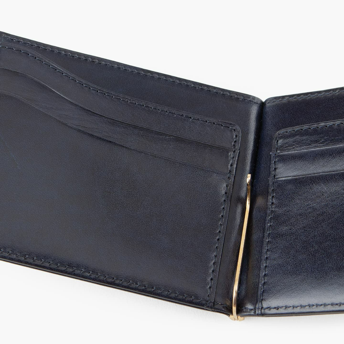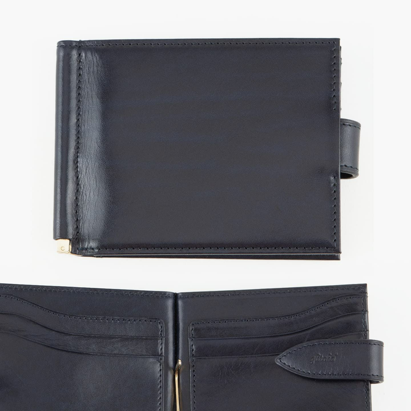 紙幣をクリップする金具だけでなく、両サイドにフラップのカードポケットを装備。これにより、カード段の背面に、紙幣と領収書を分けて収納することも可能。また、マネークリップとしてのスリムさを追求しながらも、強度を維持するために、コバの処理は返し合わせで仕上げています。角の丸まりを抑えるとともに、表革のアタリを極力出さないようにしながら、芯材を2枚入れて強度を保持。さらに、二つ折り財布に近い使用感を追求し、オン・オフ問わずに愛用できるデザインにしています。