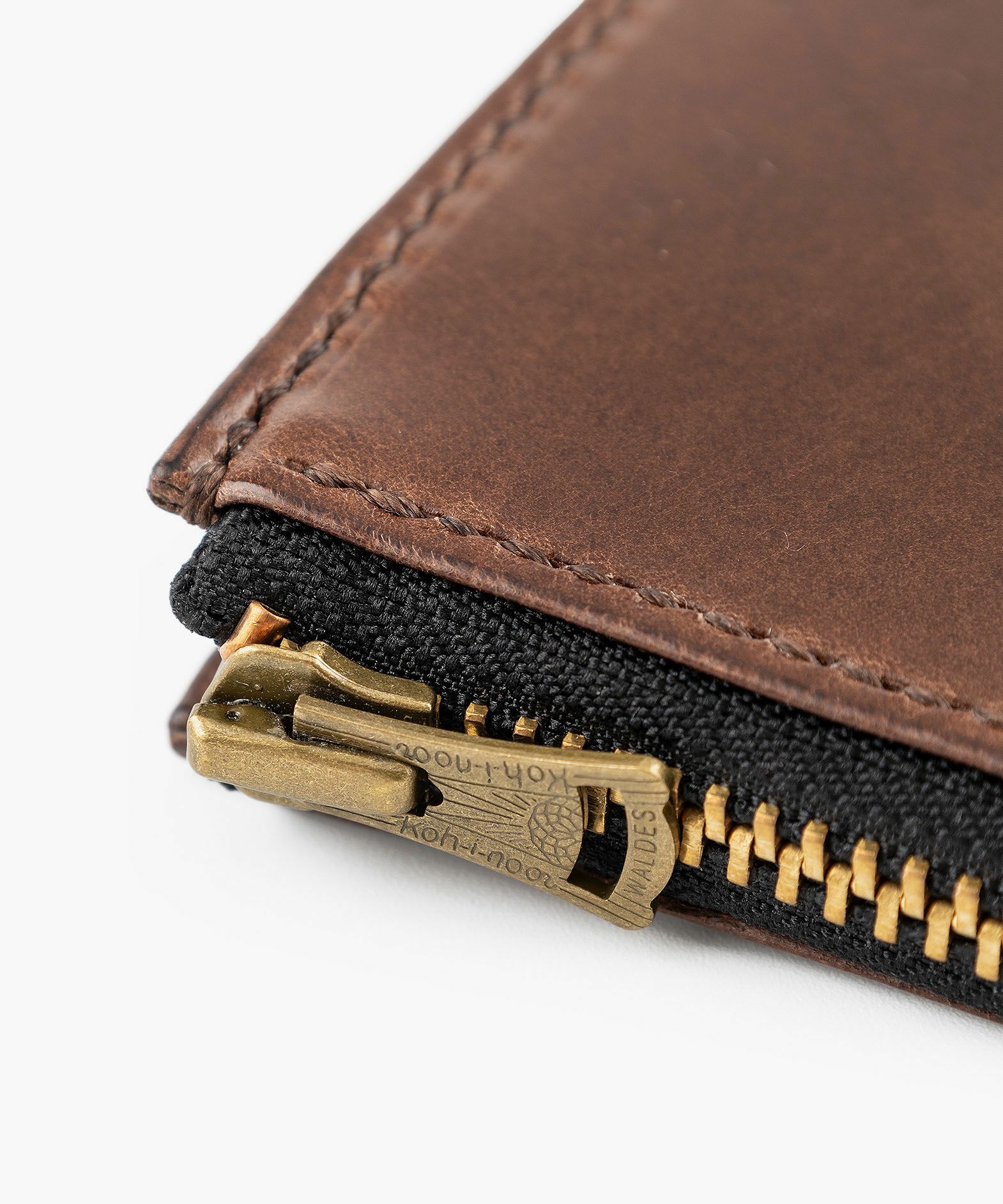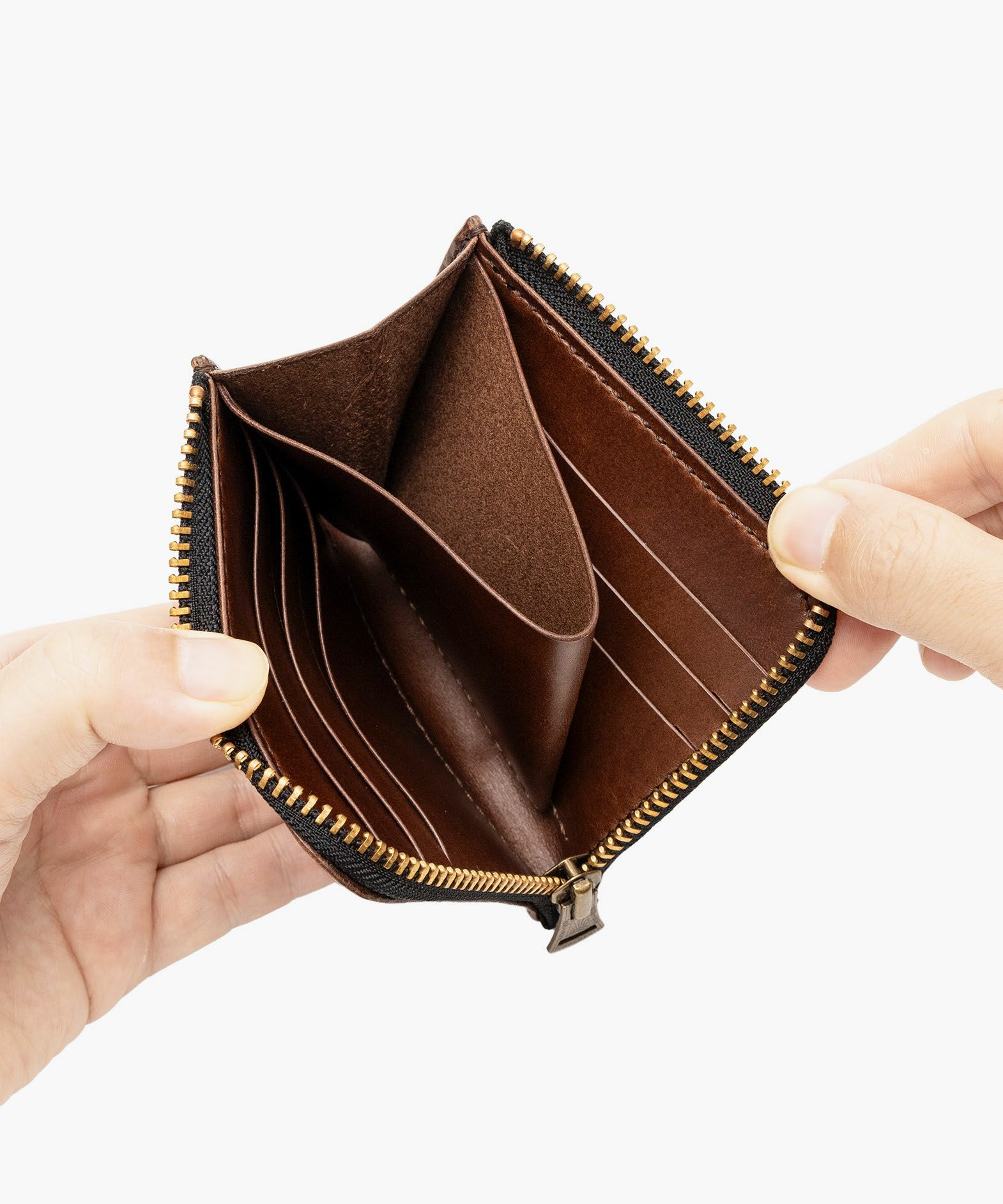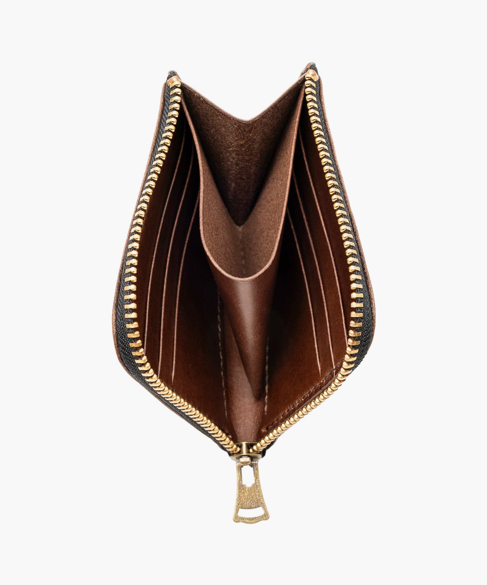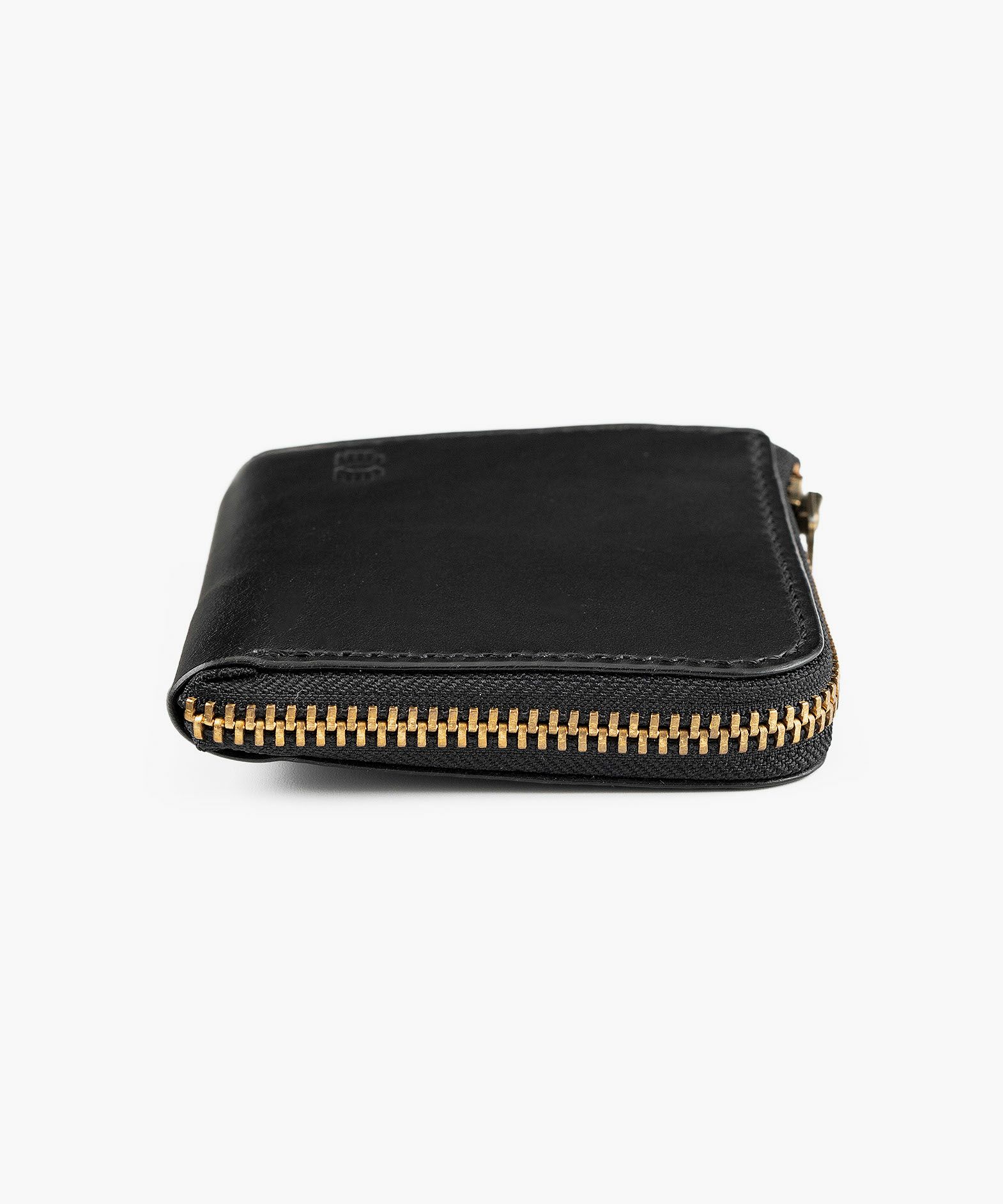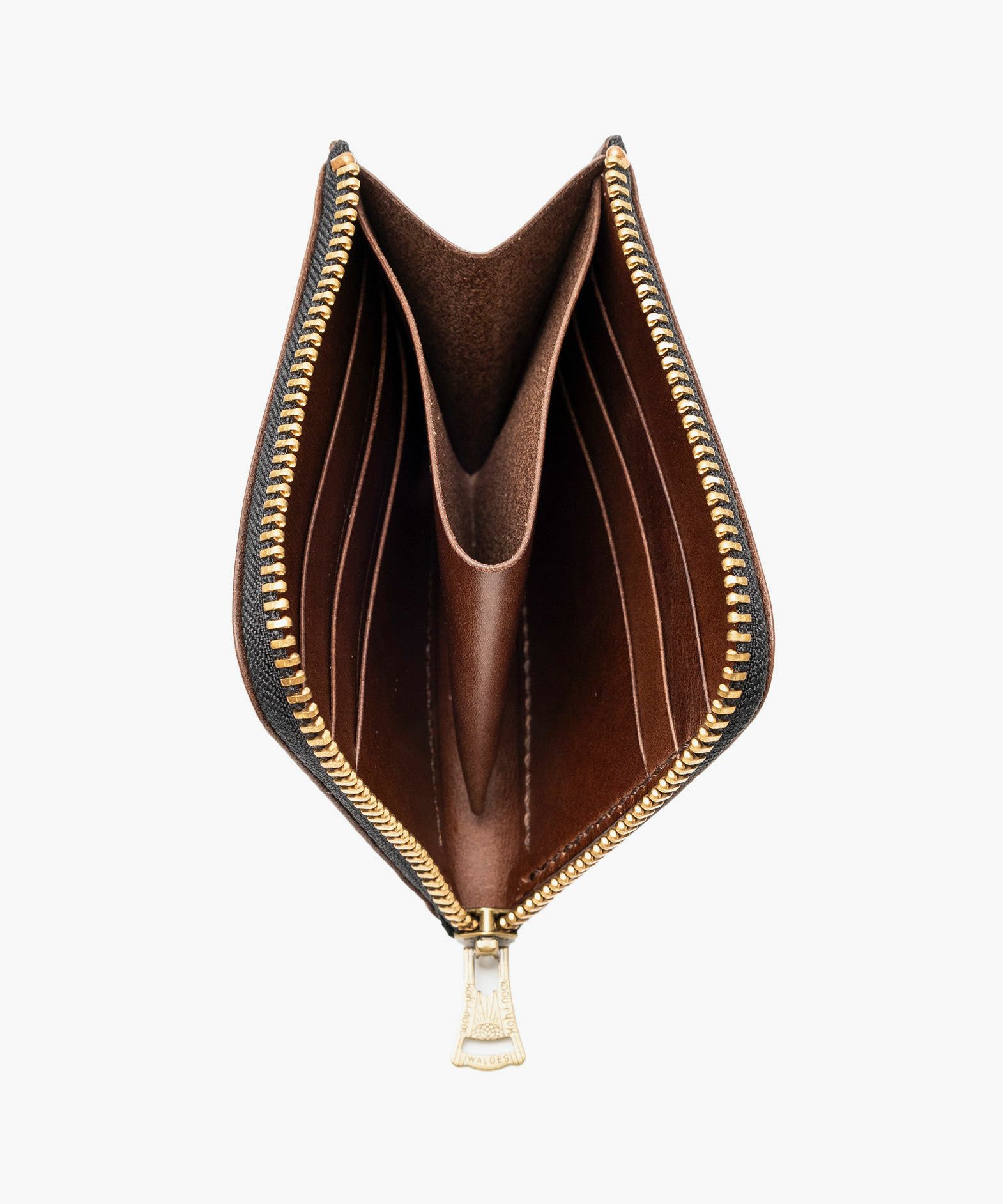 コンパクトなサイズでありながら、見た目以上に優れた収納力があり、紙幣も折り畳まずに入れられる、オールインワンのLジップウォレット。キャッシュレス時代に伴い、財布のスモール化が進むなかで、機能性とデザイン性を併せ持つ、定番モデルを独自に追求。厚めのフォルムにならないようパーツごとに最適な厚みに設計して、総手縫いで丁寧に製作してクラフト感も醸成。素材としては、経年変化も楽しめる上質なイタリアンレザーを採用。ブラック・ダークブラウンの2色から、スムース・型押しの2タイプと組み合わせて、好みの味わいをチョイスできるセレクトオーダーも。スマートに必要なものだけを収めて、スタイリッシュにポケットに入れられる所作や、WALDESファスナーによるヴィンテージ感あふれる佇まいが、ひとつ上の大人の洒落感を演出してくれる。