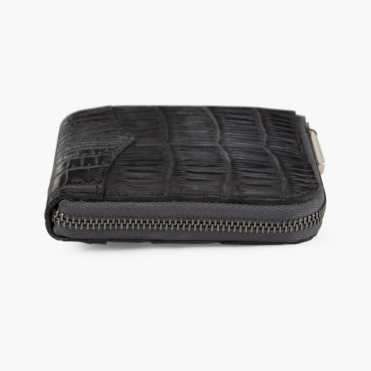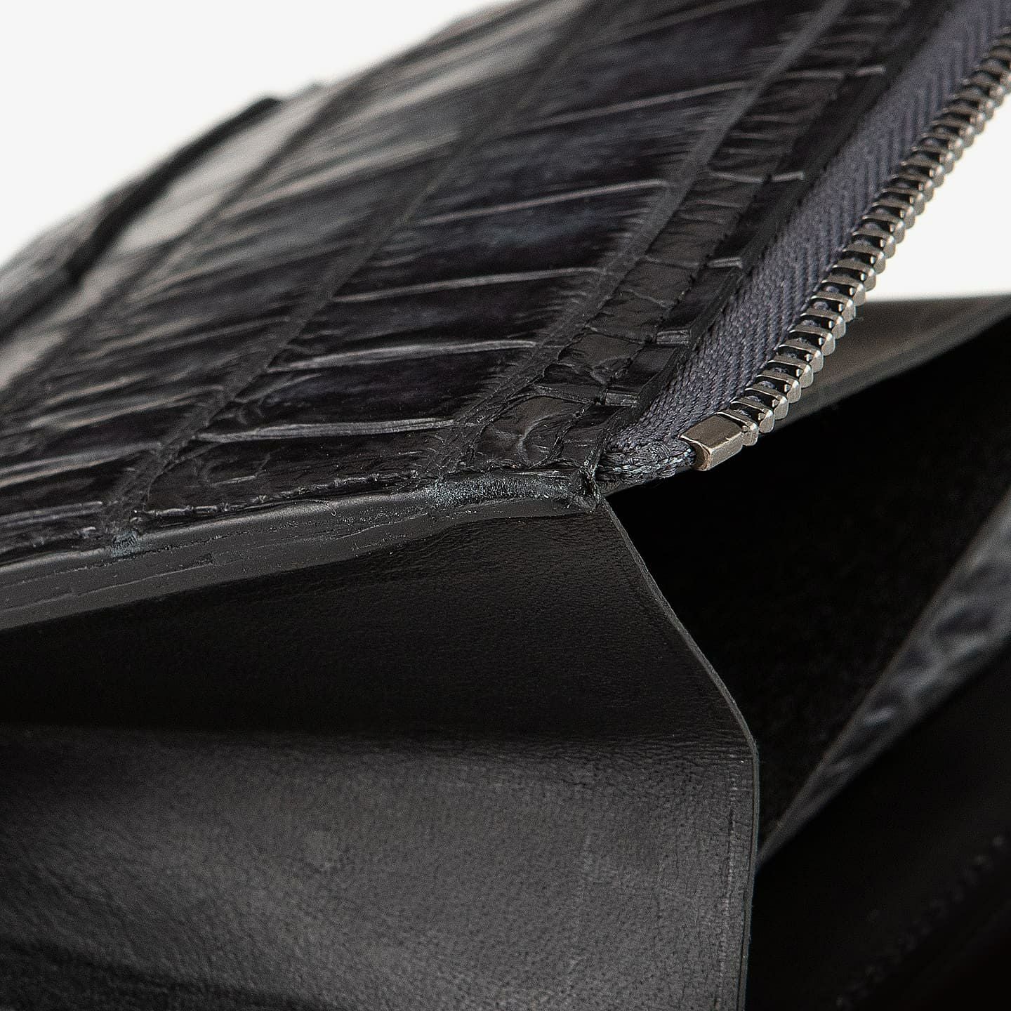 「ナイルクロコダイル」の重厚感と相性が良いクローム仕上げのファスナーは、すべての務歯に研磨が施されたYKK製を採用し、グレーのファスナーテープとともにクールさを引き立てるアクセントとして貢献。使い始めは若干の硬さを感じるかもしれませんが、次第に流れるようなスムーズなスライドになっていきます。