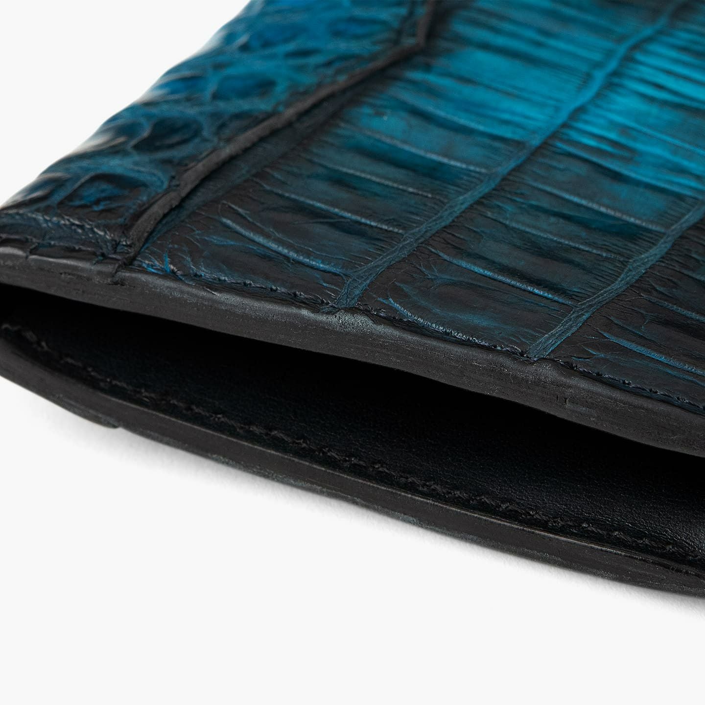 ムダを削ぎ落としたシンプルで実用的な内部構造でありながら、外装カラーと同色の「ナイルクロコダイル」の丸腑をあしらうことで、カード段に華やかさをもたらし高級感を演出。さらに、『Mens Leather Store』別注で、内装のカラーオーダーにも対応しているので、自分好みの洒落感も楽しめます。