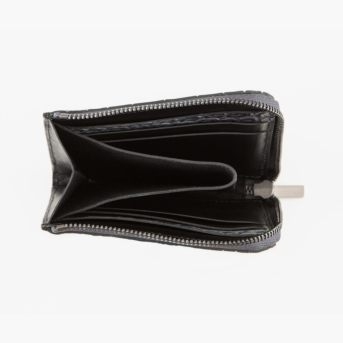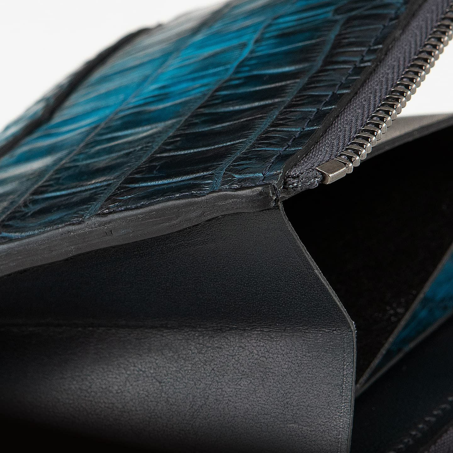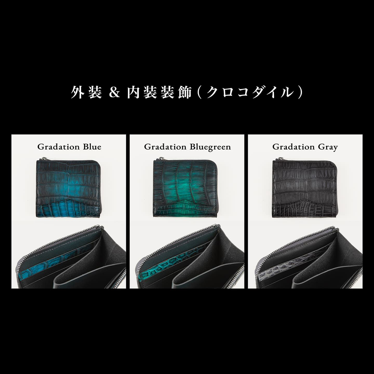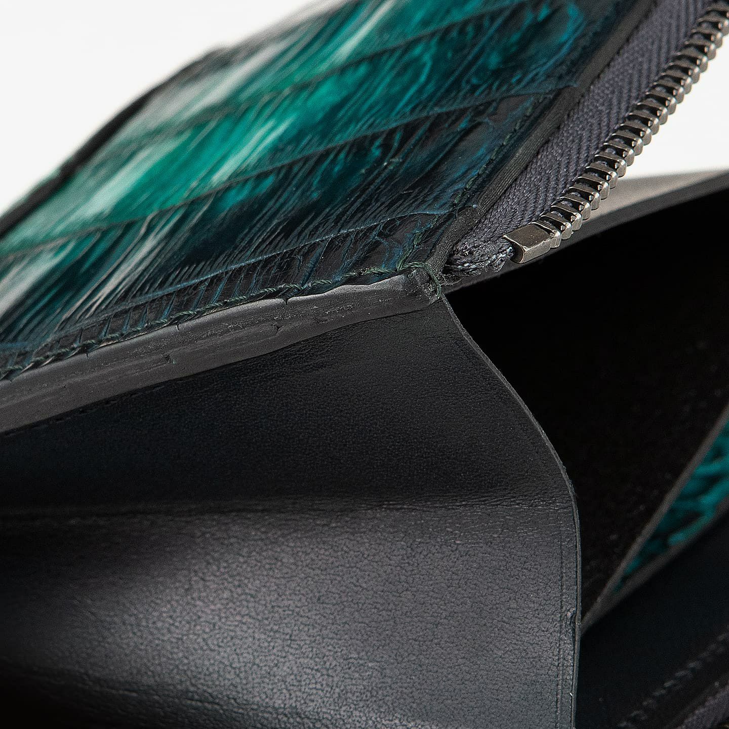 ポロサス/スモールクロコダイル(イリエワニ)・ラージクロコダイル(ニューギニアワニ)・シャムクロコダイル(シャムワニ)の他の3種類のクロコダイルに比べ、「ナイルクロコダイル(ナイルワニ)」は鱗が細かく、長方形の鱗板が腹部全体に整然と並んでいて、横腹の鱗は丸みのある長方形をしており、その幅は他の種類より狭いのが特長。鱗のバランスとしては、ポロサスとラージクロコダイルの中間くらいのイメージです。また、「ナイルクロコダイル」は、アフリカが原産で、一匹のナイルワニから採れる革の面積が小さいうえに、ヨーロッパの高級メゾンを中心に非常に需要が高く、とても希少価値が高い素材です。染色・質感・風合いの3つのこだわりを追求するために、鞣しや仕上げに至るまで日本国内のタンナーで行っています。
