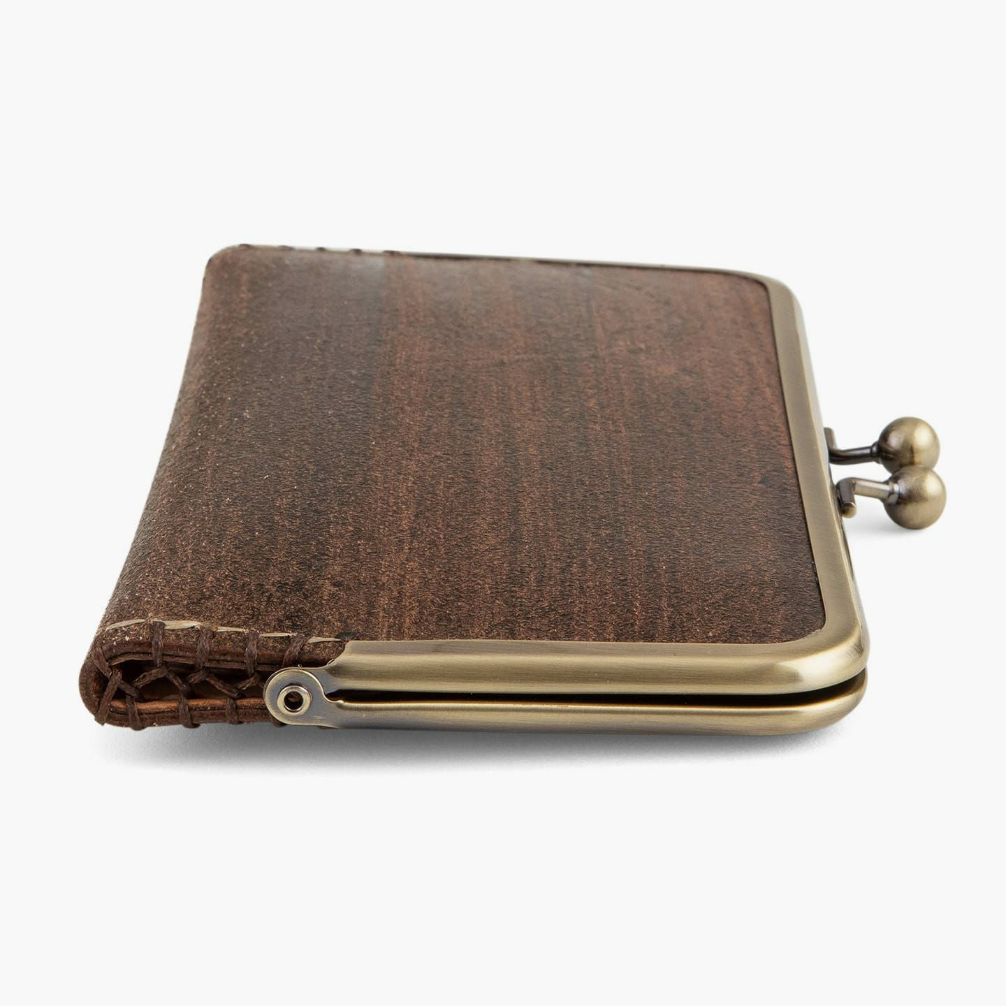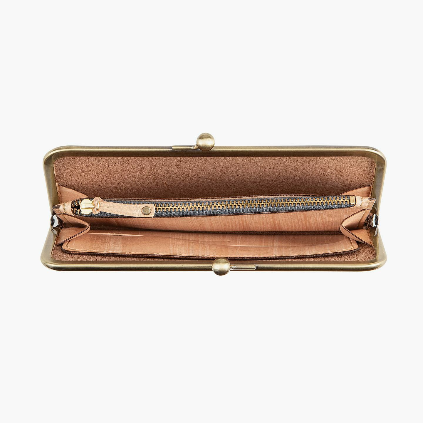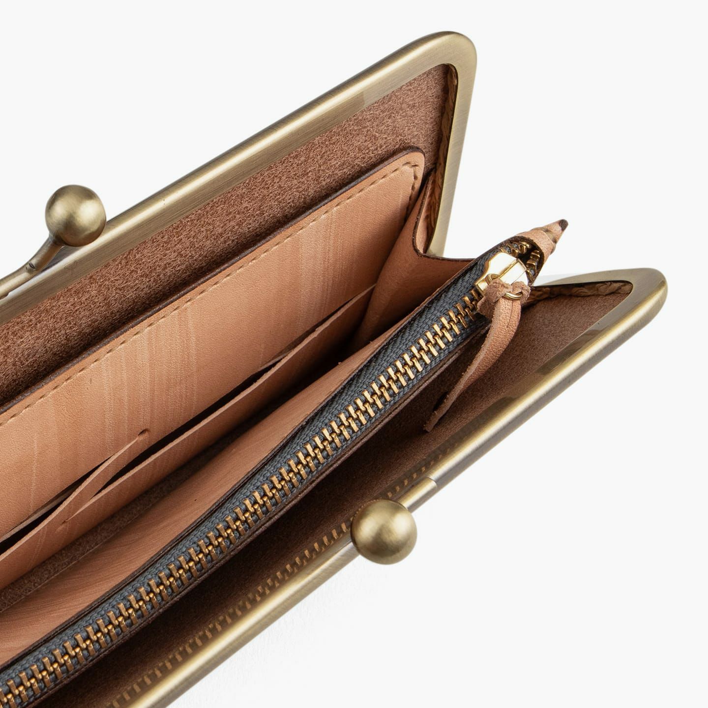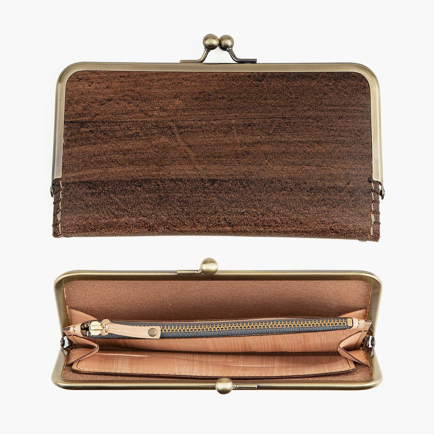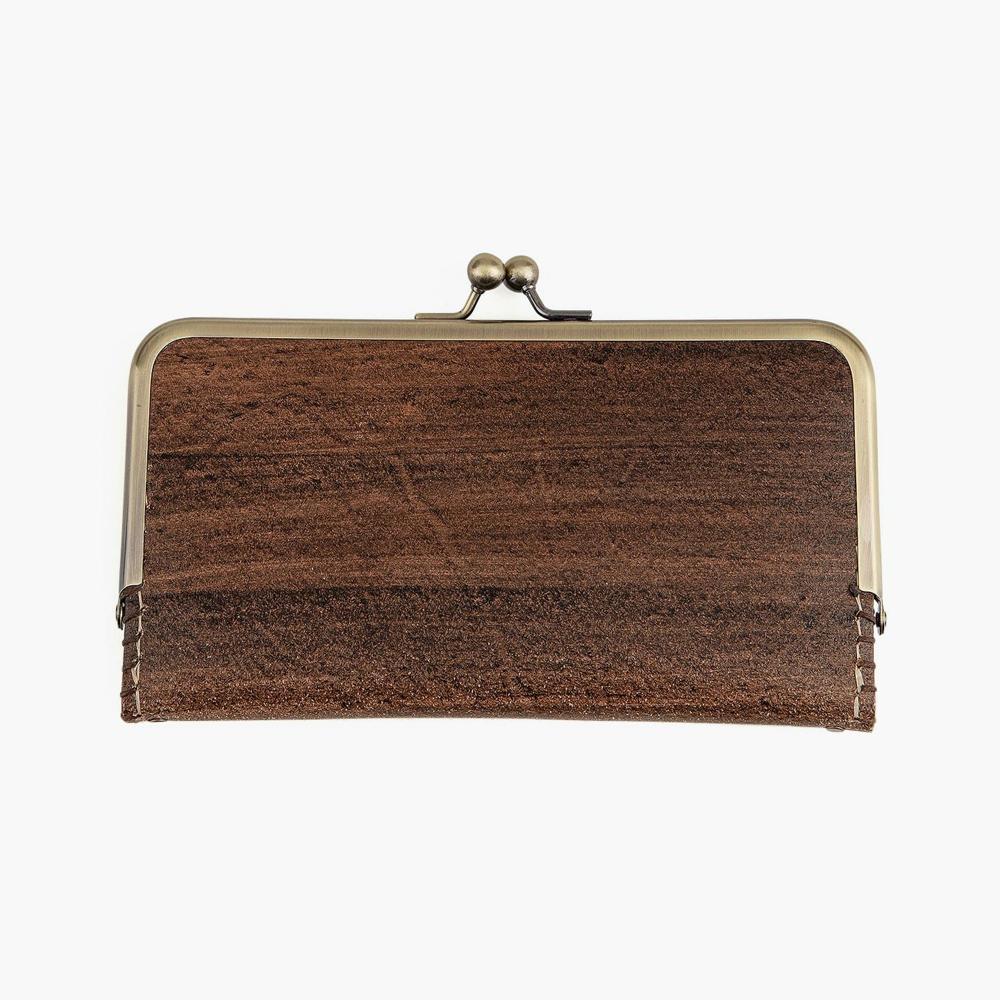 『Kei Arabuna』では、革は2種類の鞣し「フルタンニン」「コンビ」を使用しています。アイテムにより産地・鞣し方法は異なりますが、『がま口長財布(KA-LW-18sl)』は、最適な経年変化や耐熱性などの強度を兼ね備えさせるために、指定工場にて鞣し加工を行った「兵庫県産コンビ牛革」を使用しています。そして、車の塗装に匹敵するほどの硬度を誇る天然素材の本漆を用いて、古来武士の具足作りから発想を得て生まれた独自技術「鎧染め」にて染色。手染めされた漆により、革の表面に浸透した木目模様は、割れや剥げもなく美しさを保つとともに、革の呼吸を助け、防水性を高めながらもオイルは浸透させる、優れたマテリアルへと昇華させています。