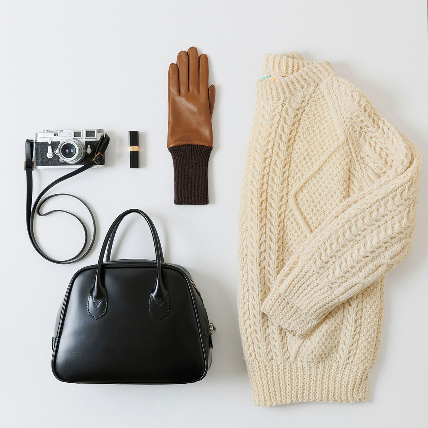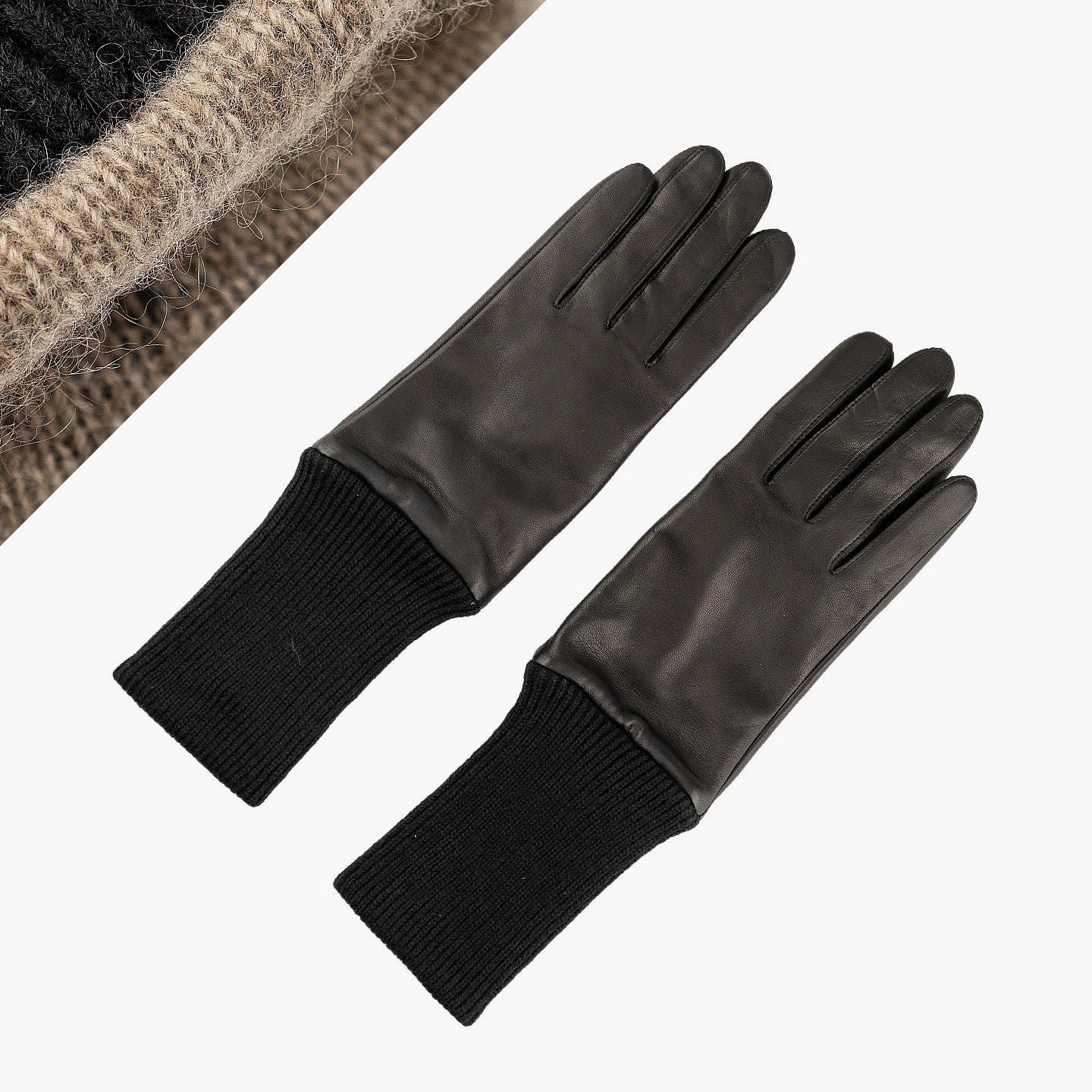 イタリア・ポルトラーノ社の「イタリアンラムレザー」に、手首まで隠れて温かい長めのニットカフスを付けた、カジュアルでリッチなイタリアンシープ手袋 “Cuffs-Touch Panel”【WOMEN】。カフスは折り返して短くしても使え、手のひらサイドの親指・人差し指には導電革が施され、装着したままスマートフォンなどのタッチパネル操作をすることも。Black・Luggage・Hematiteの3色から2サイズと併せてセレクトオーダーでき、肌触りがよく温かなカシミア100%のニットを裏地に採用。“ピケ縫い”という指先を長くキレイに見せる、こだわりの縫製を用いて日本で丁寧に一双一双を仕立て、細身でスッキリとした女性らしいルックスへと導いてくれる。