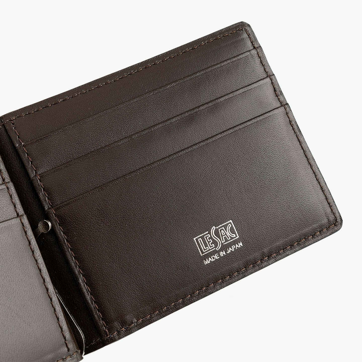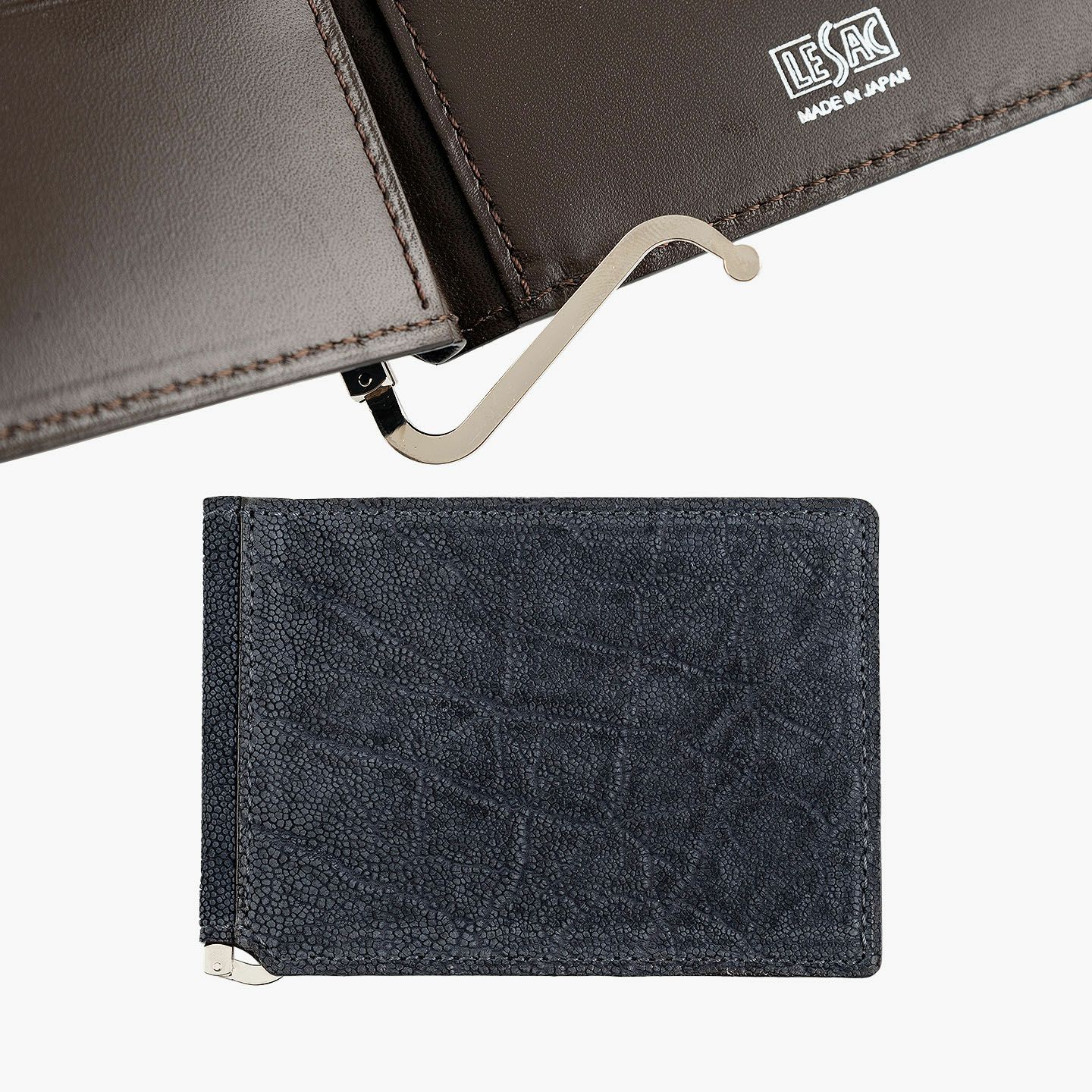すべてにおいて独自の価値基準を設けることで、希少価値の高い最高級の革を用いるなど、真の絶対価値を追求している、エキゾチックレザー専業ブランド『LE’SAC』のマネークリップ。紙幣とカード類のみを収納するスリムなフォルムや、手軽に使いこなせるスマートなデザインと相反するように、希少で特別なゾウ革の外装「オイルエレファント」が、自然なシワ・凹凸模様による独特の存在感を放つとともに、しっとり感とザラザラ感による味わいのある質感も魅力。4色ラインナップした外装との相性も良いシルバーの金具と、落ち着いたマットな風合いで大人感のあるダークブラウンの牛革による内装が、大人の小粋さを引き立ててくれる。