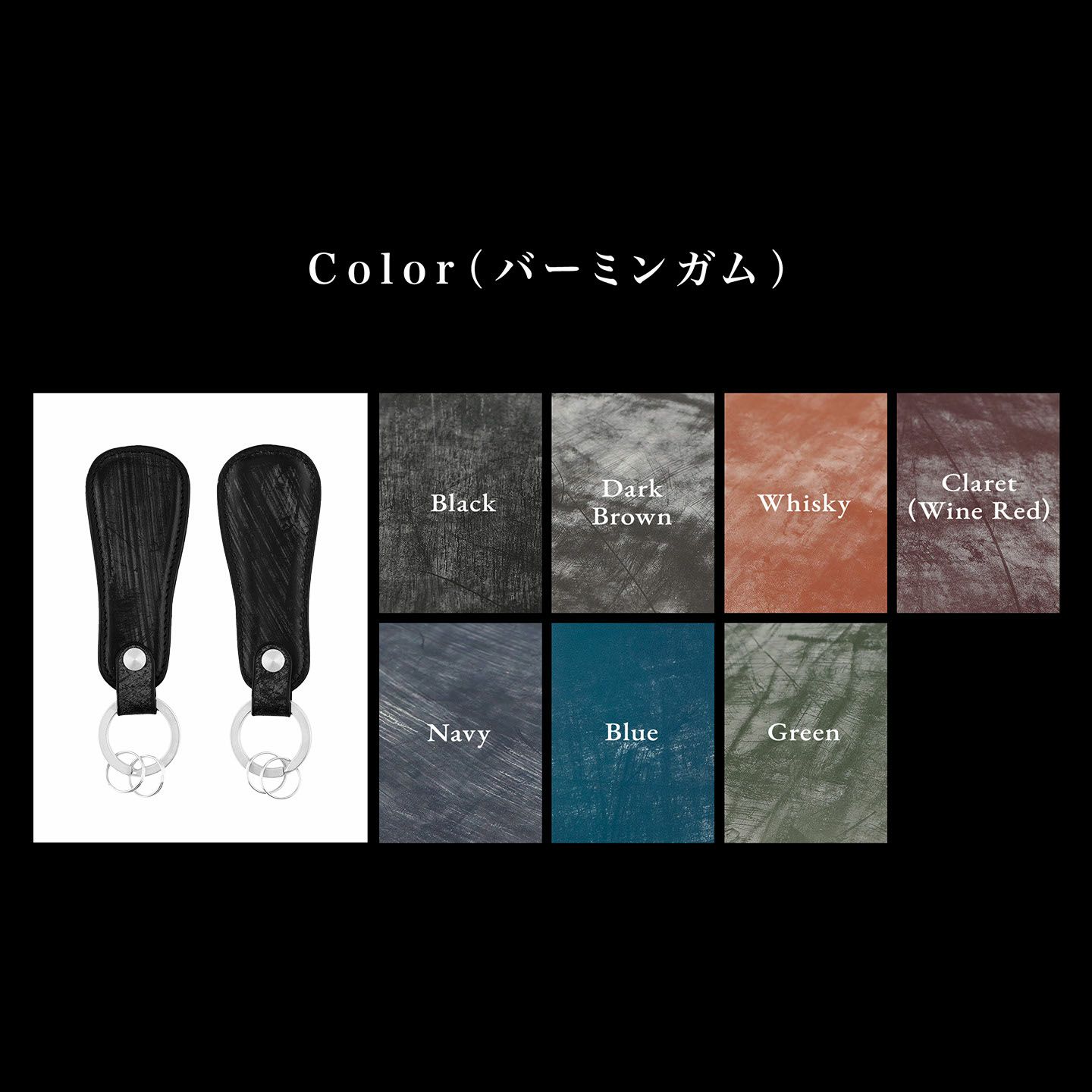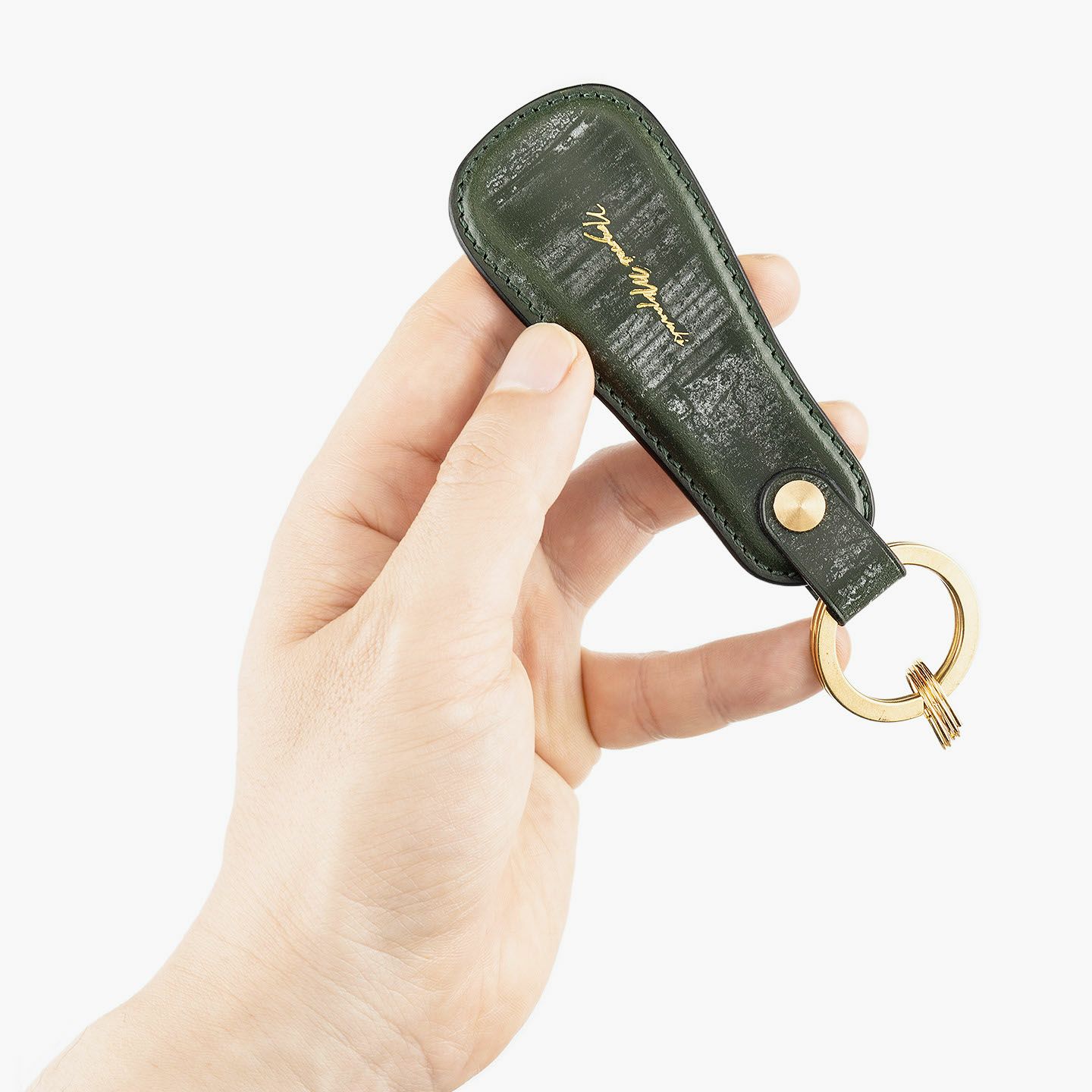 携帯できるコンパクトな靴ベラでありながら、真鍮製の二重リングを大1つ・小2つを備えて、キーホルダーとしても使える実用性の高いアイテム。シューホーンとしての高級感を纏わせている「バーミンガム」は、味わい深い7カラーから選ぶことができます。セレクトした色と同系色を採用している糸色は、丁寧に仕上がられたステッチとともに上質感を演出。さらに、程よいマット感のあるブラックを採用している美しい磨きのコバは、シューホーンのアウトラインを引き締める額縁効果も。また、ブランドロゴ刻印を素押し・箔押し(Gold)のいずれかからチョイスできるとともに、人気の高い名入れ刻印もオプションで対応しているので、自分用としても贈り物用としても、名前が入れて自分感を高められます。