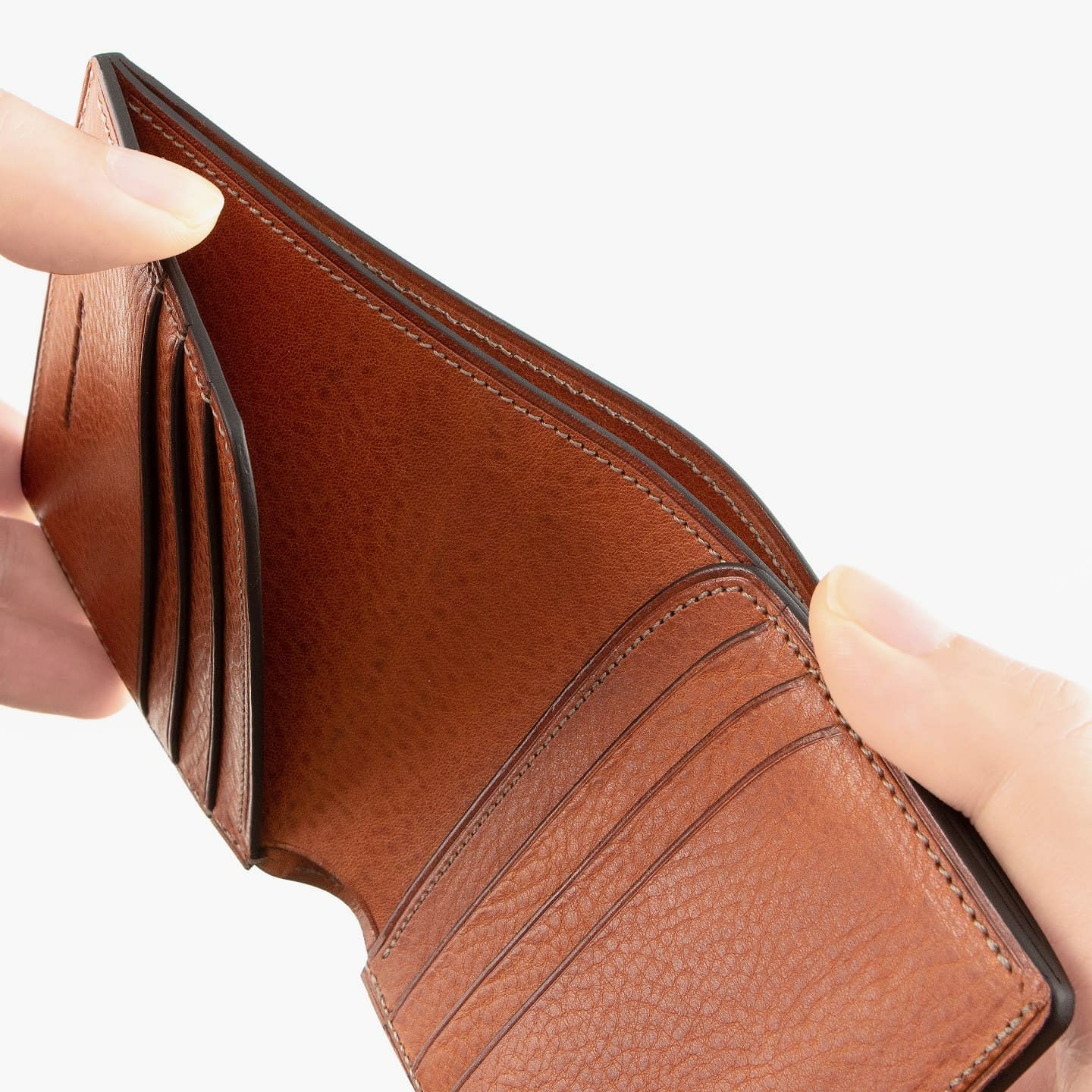 札入れを独立させた設計により、左右のカードポケット裏にフリーポケットを2つ装備させ、キャッシュレス時代に合わせた収納性にも配慮。直線的な外装フォルムと曲線的な内装ポケットのカットラインが、ブランドのアイデンティを象徴するデザイン性を醸し出しています。外装「コードバン」と内装「リベルソ」による総革の贅沢な仕様は、2種とも二つ折り部分の曲げに強くシワなども目立ちにくく、使い込むほどに手に馴染み、エイジング効果で表情の変化も楽しめるのも魅力。さらに、丁寧なミシン縫製による職人技を駆使した構造・仕立てが、細部にまで美しさと強さを行き渡らせているので、長年の愛用にも最適です。