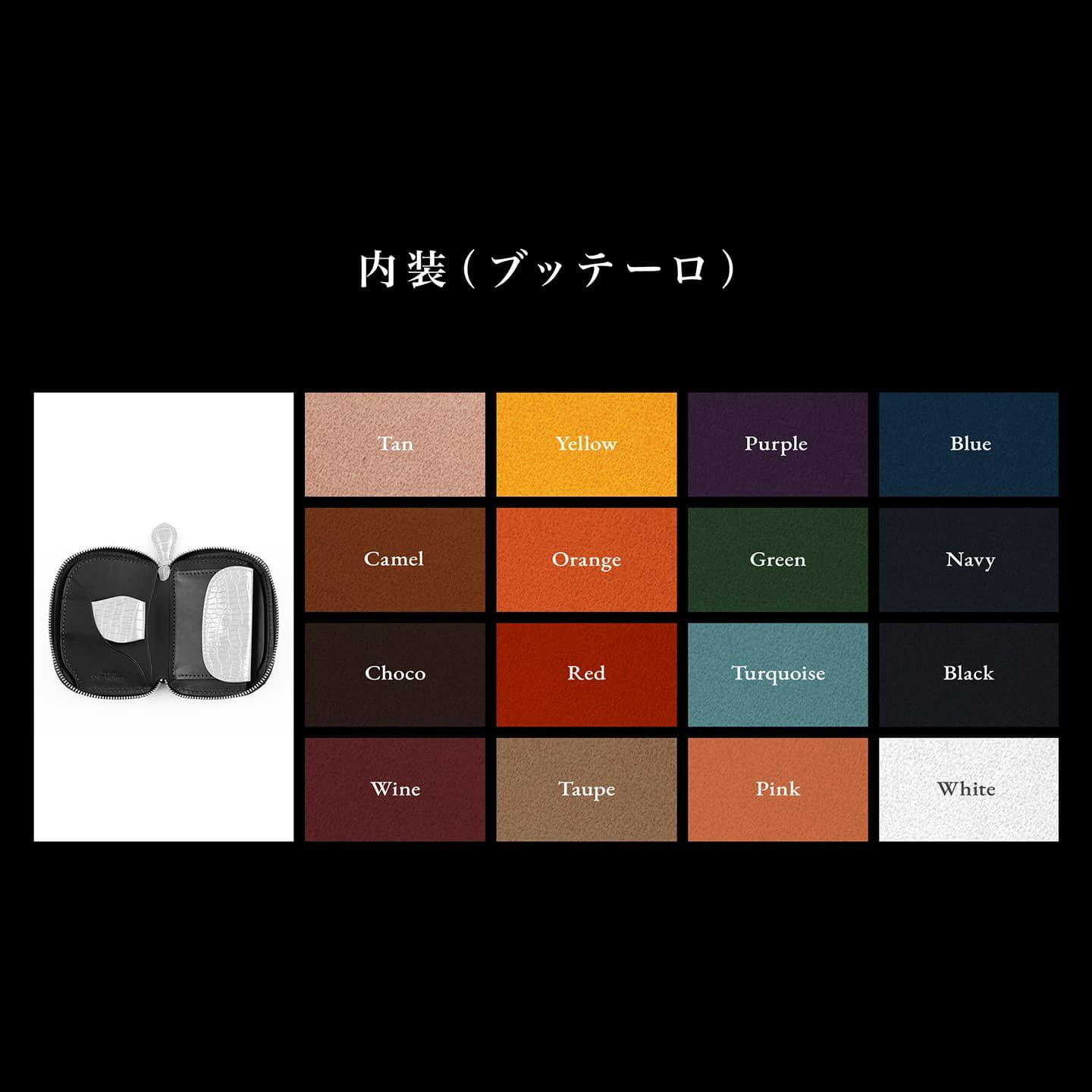 カラーオーダーできる外装&内装装飾の「クロコダイル ポロサス」は、5色をラインアップ。内装の「ブッテーロ」は、16色から自由に選ぶことができるとともに、ファスナー金具3色・ファスナーテープ18色からそれぞれセレクトでき、豊富な組み合わせのなかから、自分好みのカラーリングで仕立てられます。