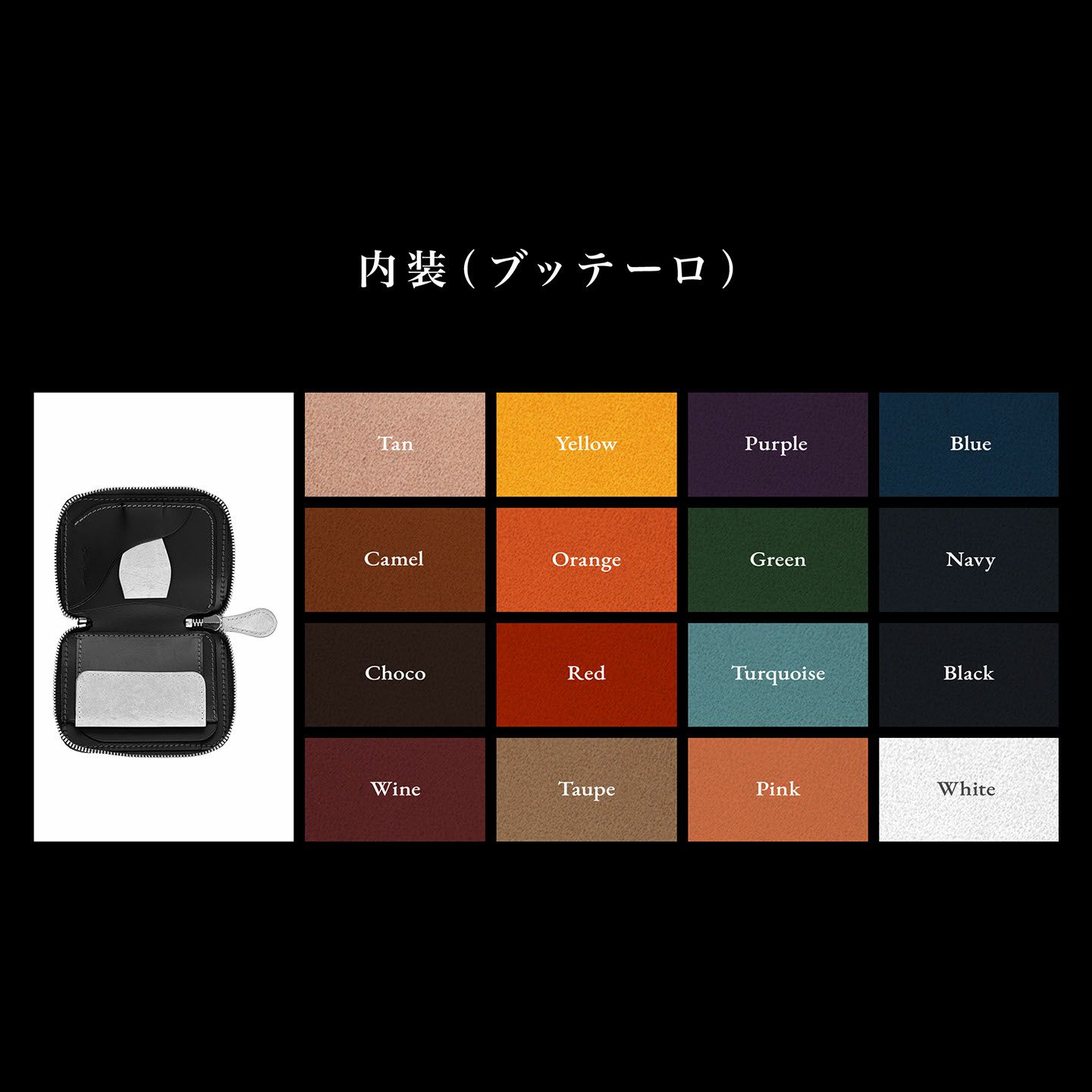 コンパクトなサイズ感でありながら、紙幣・小銭・カードなどを可能な限り収納できる設計を追求。紙幣を挟めるホルダー付きの札スペースや、マチ付きで収納力があるフラップ&ホック式の小銭入れ、カード数枚を差し込めるループとともに、ループユニット裏・小銭入れ裏・札スペース裏にもカードポケットを設けているカード収納など、それぞれに独自の工夫が施されています。また、収納物を包む込む安心なラウンドファスナー仕様で、外装革をあしらった開閉しやすいユニークな形状の引き手も魅力。さらに、外装は手縫い・その他はミシン仕立てにして、パーツごとに最適な縫製を使い分けたり、革の厚みもパーツごとに調整したりして、使い心地や使用感にもこだわり抜くなど、高度な技術を誇る職人としての美学も凝縮されています。