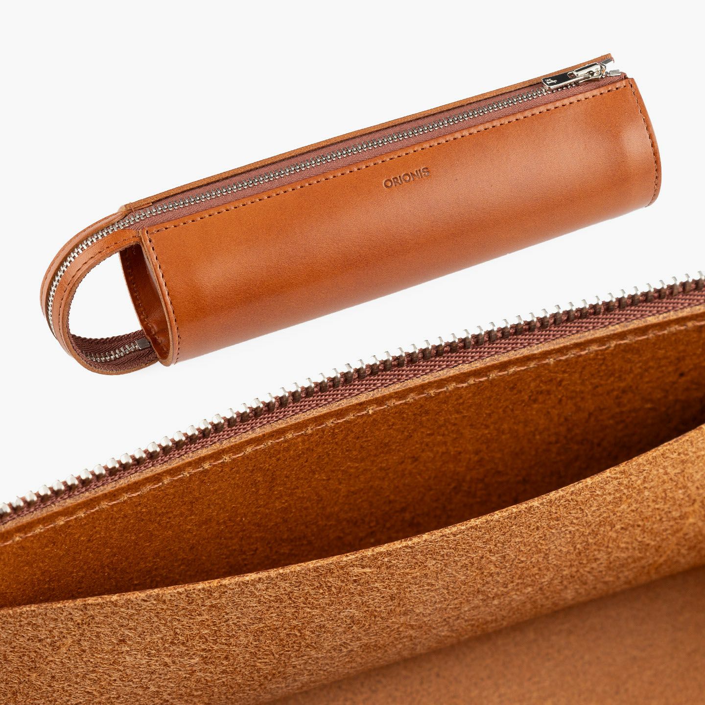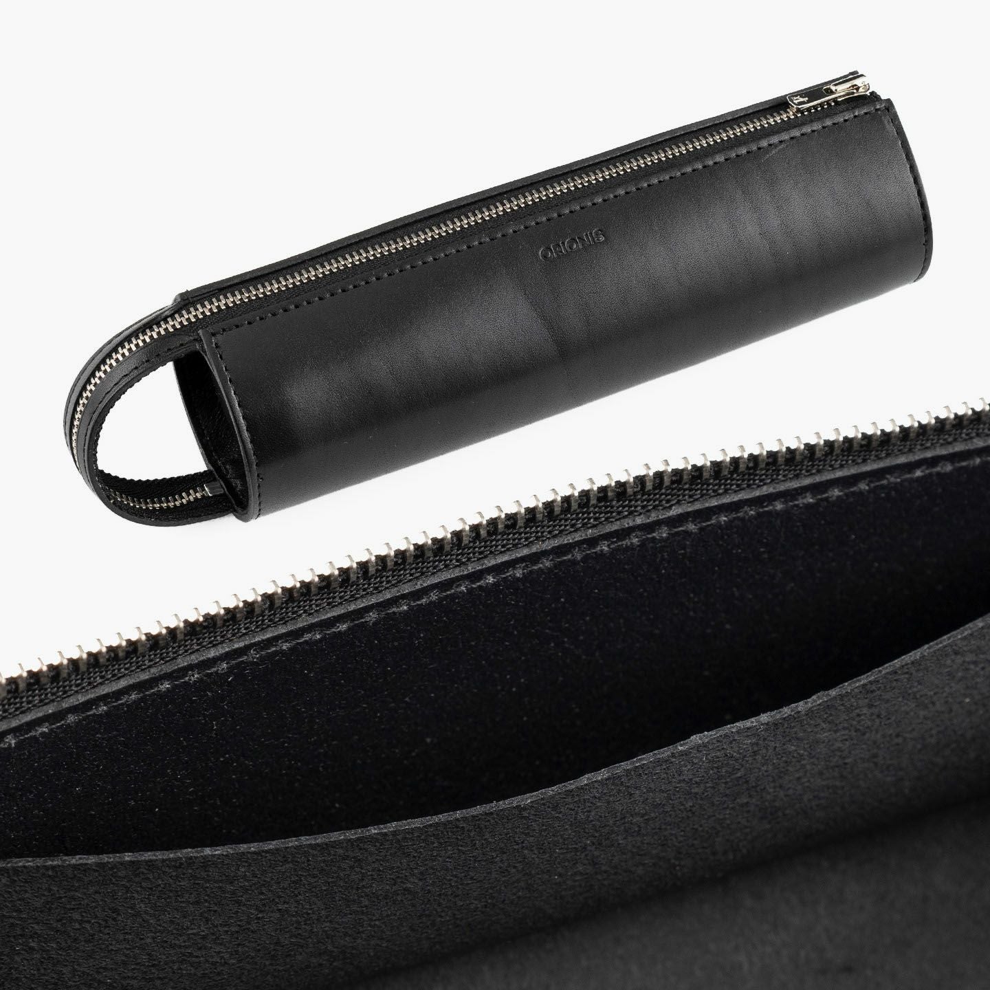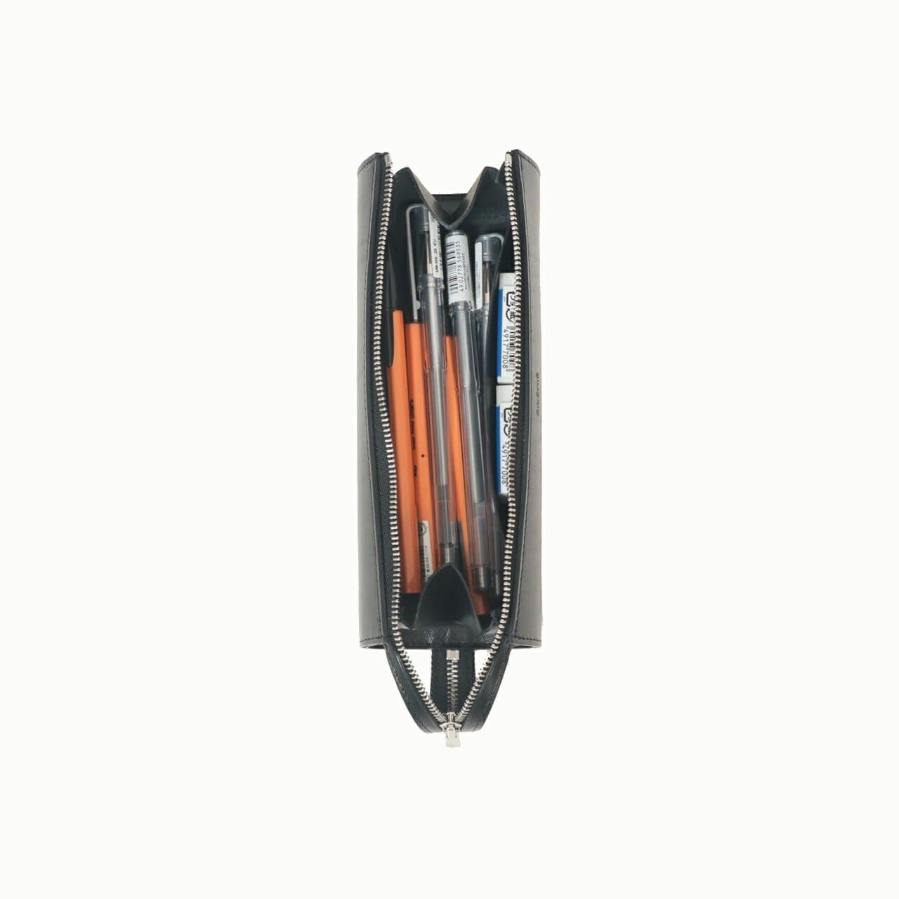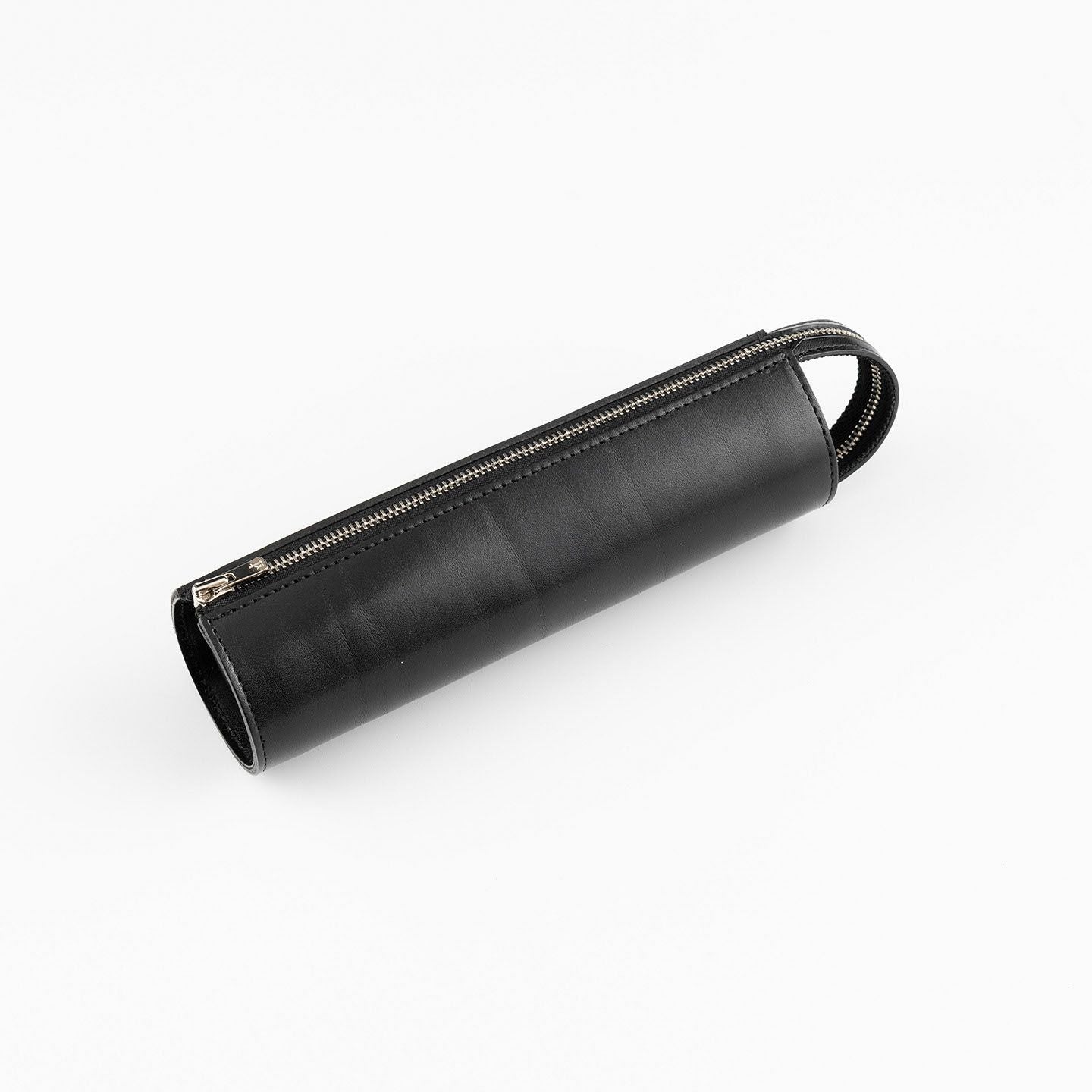 ハンドル部分までYKKエクセラジップを大きく開くことができ、ペントレイのようにも使うことができる、直径約55mmの円柱型ペンケース ミニ。内ポケットも1つ備えているので、キズを付けたくないような大切なペンの収納などにも最適。立てて置いておくこともできるミニタイプで、デスク周りでもスペースを取らず、ハンドルを掴んで気軽に持ち運べるのも魅力。素材には、ファッションへの感度が高いイタリア・M.P.G.社製「イングラサットLUX」を採用し、透明感のある風合いと独特のツヤ感が美しく、発色の良いBlack/Camelから選んでインテリアのようにも飾れるので、ギフトなどにも大人の洒落感を満たしてくれる。