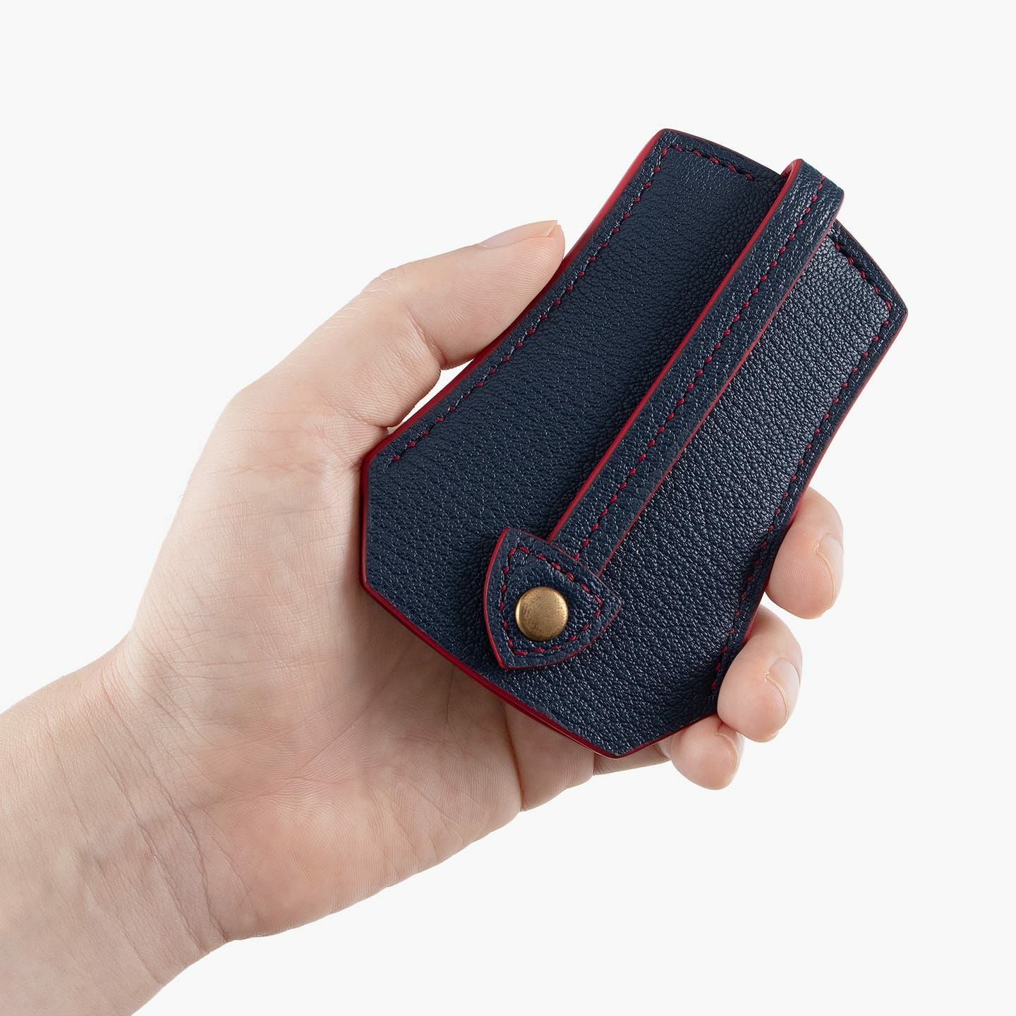 剣先デザインのベルト部分のホックを留めて、ベル型デザインのボディに鍵を収納する仕様。マチを設けていることで、ナスカンタイプの日本製キーフック4つに装着した鍵を余裕で収納できるとともに、しっかり挟んでホールドできる設計にもなっています。鍵を使用するときには、ホックを外してボディの両サイドを握って少し膨らませると、鍵が擦り抜けて出てくるシンプルな構造で、ベルト部分を押して鍵を出す使い方も可能。剣先タイプのベルトエンドは、デザイン性だけでなく、ベルト部分の抜け落ちを防ぐストッパー機能も兼ねています。