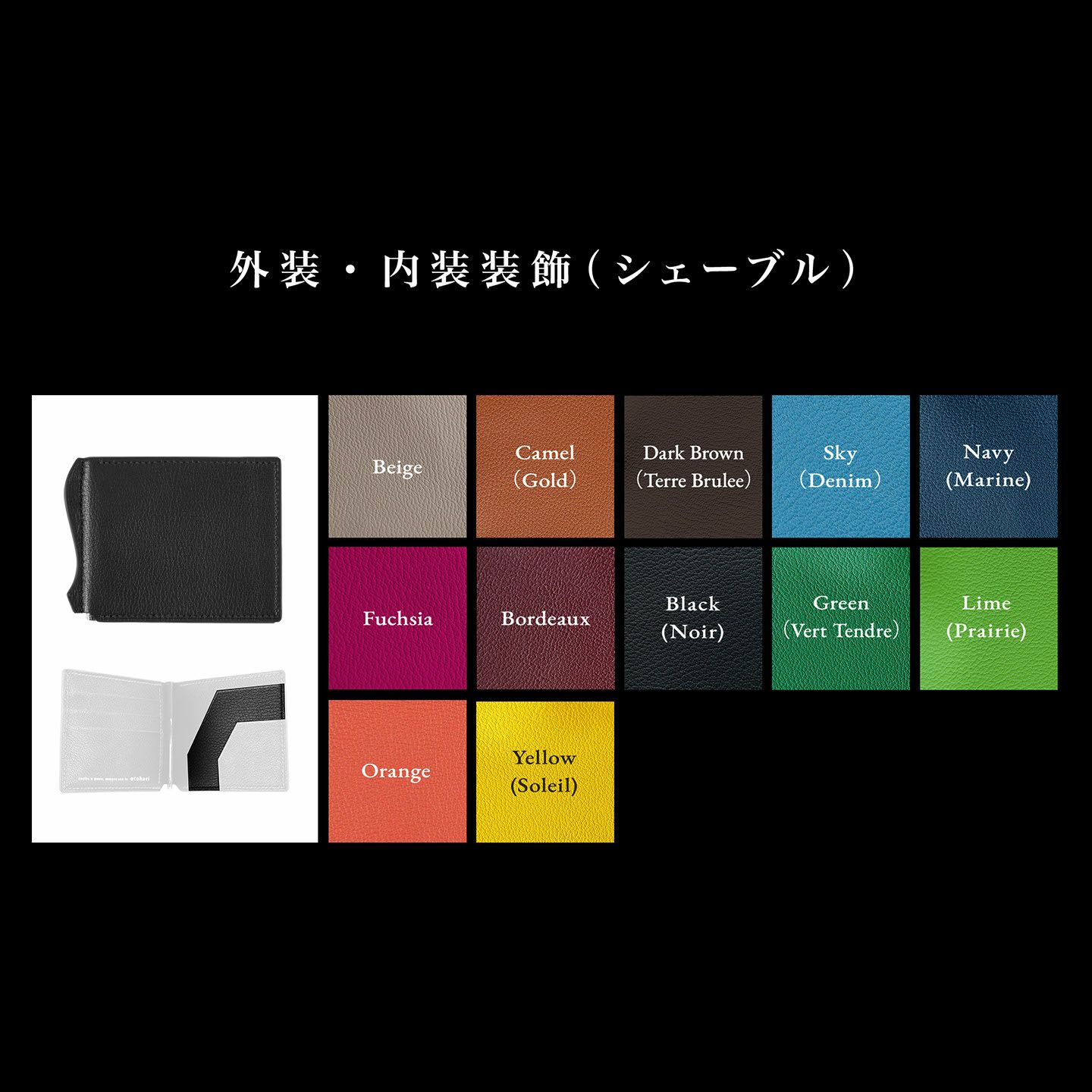 フランス・アスラン社製の「シェーブル」を外装と内装に採用し、鮮やかな8色からそれぞれ選ぶことが可能。また、内装右サイドのマルチポケットを、装飾として外装カラーにしているカラーリングで、遊び心あふれるアクセントを楽しめます。金具は、Silver・Goldのいずれからセレクトすることができ、小銭入れ付きを選んだ際のファスナーや内装左サイドのロゴも同じカラーで統一。さらに、糸色・コバ色・ファスナーテープカラー色(小銭入れ付きの場合)は、外装・内装いずれかの同系色を選択してオーダーできます。