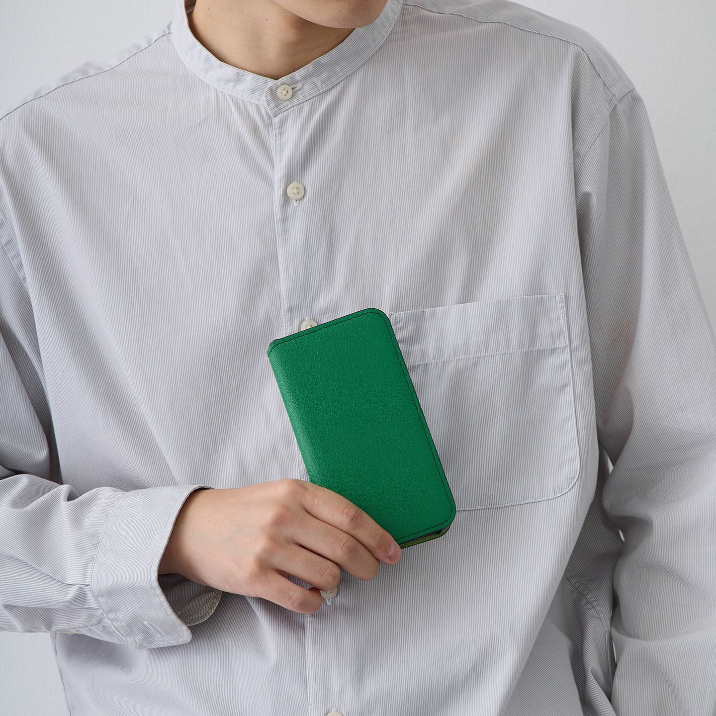 美しく鮮やかな発色、はっきりと深い凹凸のシボ、繊維密度の高い丈夫さが魅力の高級皮革「シェーブル」を、外装・内装ともに贅沢に纏わせた、手帳型iPhoneケース。上品な光沢感を併せ持ち、小キズなども付きにくくキレイな状態で長く使い続けられ、普段使いのスマホケースにも最適。総手縫いによる丁寧なステッチと、手間暇を掛けて仕上げたブラックのコバにより、より高品位なアイテムへと昇華。オプションでスタンドとしても使えるフラップを追加でき、折れ曲がる部分に工夫が施された細やかな設計も。そして、ブラッククロムメッキ加工された「ポリカーボネート」が、カメラ周りのサイドから覗き、大人の上質感を引き立ててくれる。