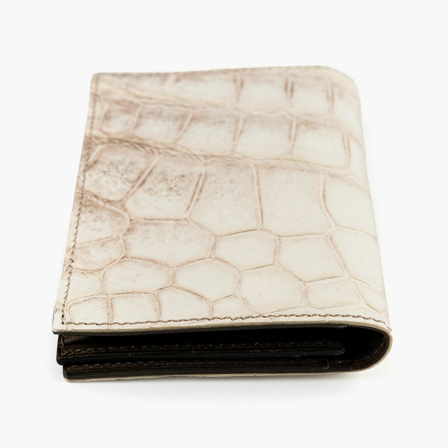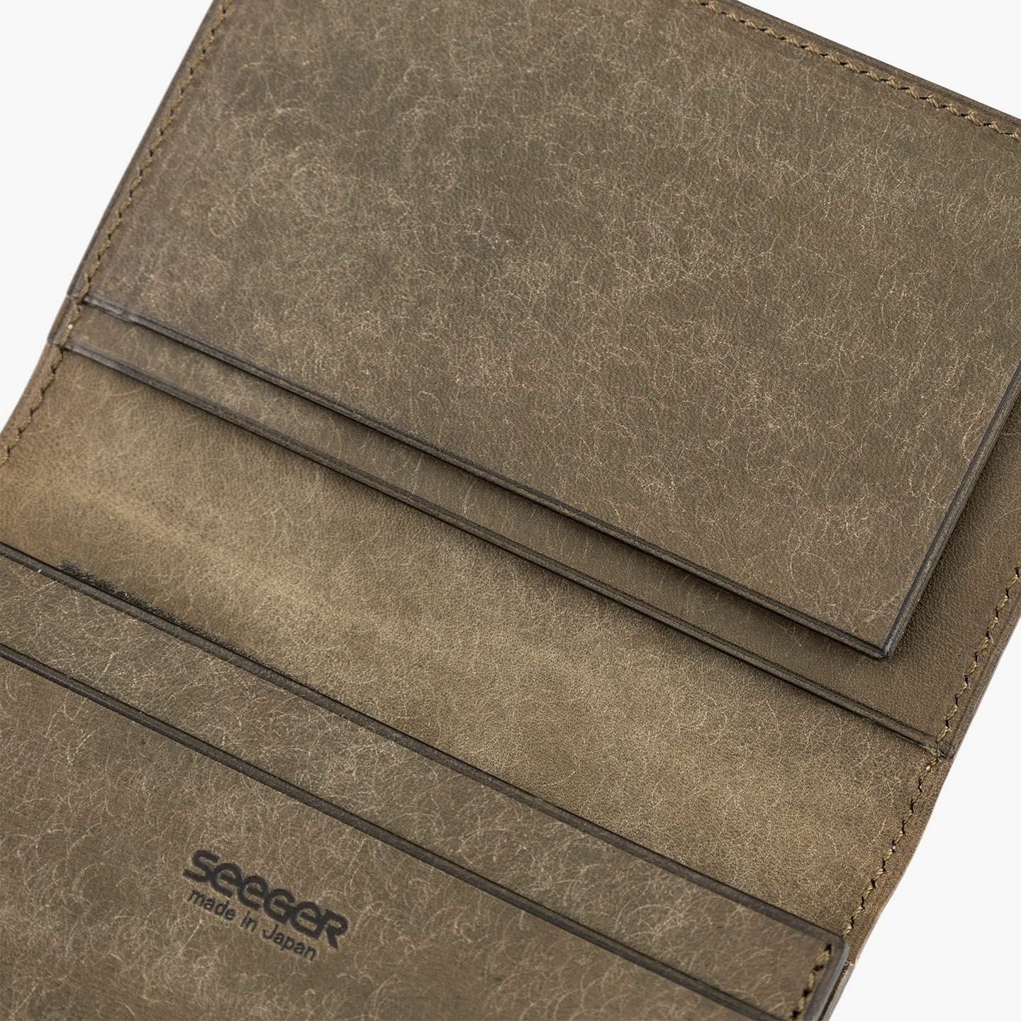 1889年にドイツ・オッフェンバッハで創業し、世界中のセレブリティから愛されながらも衰退するが、日本の職人たちにより蘇らせたブランド『SEEGER』の名刺入れ“Hestia”。環境に配慮して“メタルフリー”で鞣した「ヒマラヤクロコ」を、高級感あふれる外装として贅沢に纏わせながら、内装「プエブロ」との異なる色合い・質感による組み合わせが、比類なき独創的な佇まいで魅了。通しマチ付きのメインポケットには50枚ほどの名刺を収納できるとともに、カードポケット2つに加えてアオリポケットも1つ備え、一時的な名刺の差し込みに活躍。ひとつ上の洗練された印象を漂わせながら、ビジネスシーンに彩りを与えてくれる。