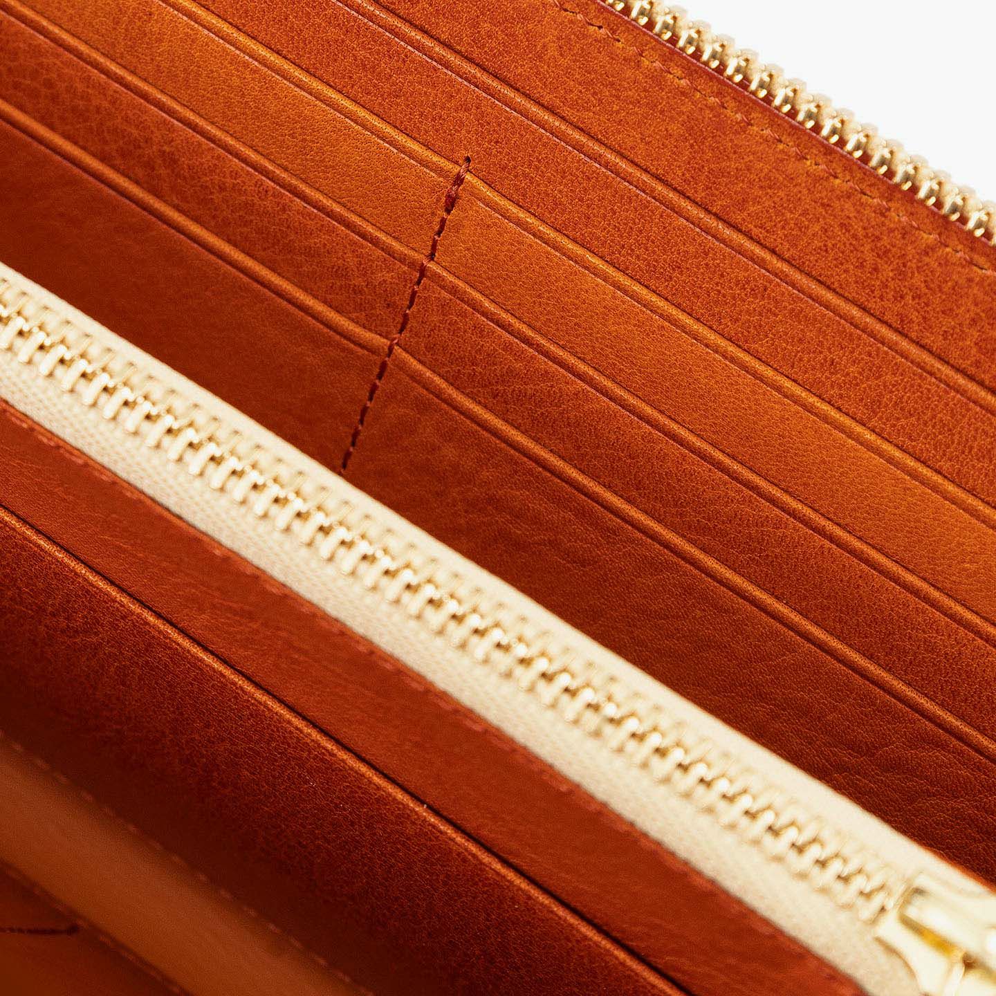 かけがえのない時間や空間へ、モノがあふれる時代のレザーアイテムとして、自然の情緒と色彩の感動を届けている、ファクトリーブランド『SOLSOMARE』のラウンドジップ長財布。深みのある落ち着いた色合いの「イタリアンショルダー」は、Orange/Navy Blueのいずれかからセレクトでき、そのカラーごとに異なる金具・ファスナーテープとの配色が洒落感を演出。丈夫で経年変化を楽しめる牛革の風合いを感じながら、大容量の収納力を併せ持つとともに、紙幣・小銭・カードなどが見やすく出し入れしやすい使い勝手の良さが、日常使いの満足感を高めてくれる。